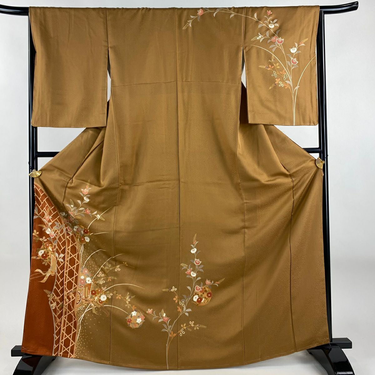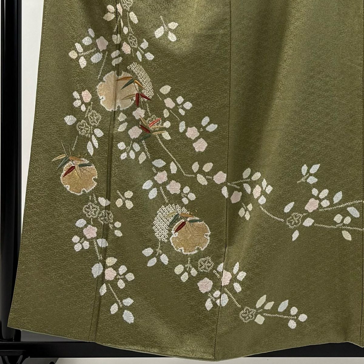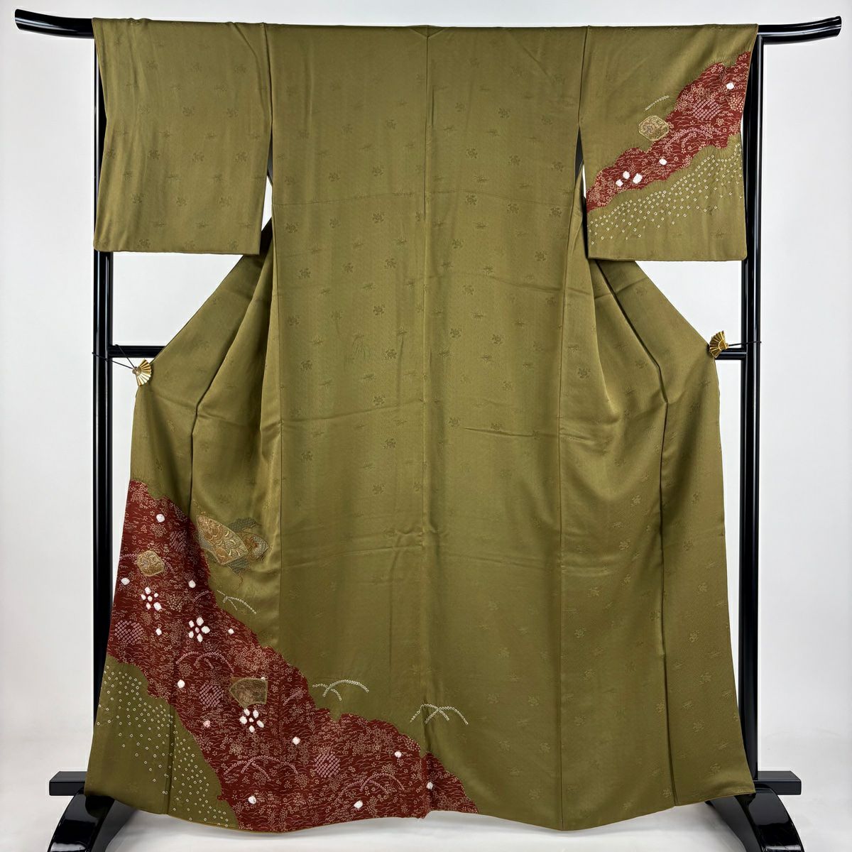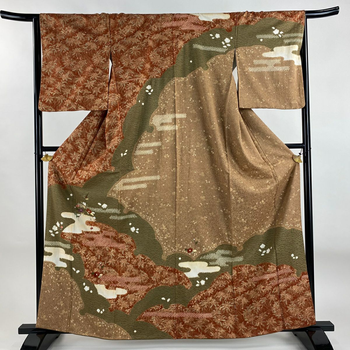 【在庫一掃】 付下げ 身丈154.5cm 裄丈62.5cm S 袷 扇 草花 刺繍 金銀彩 抹茶色 正絹 秀品