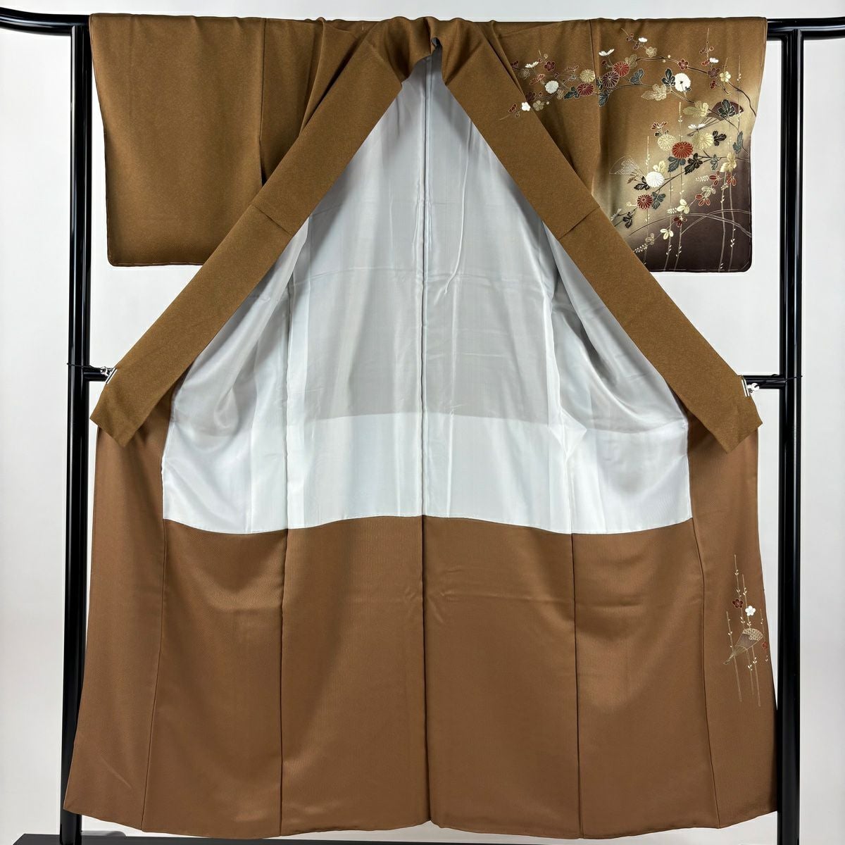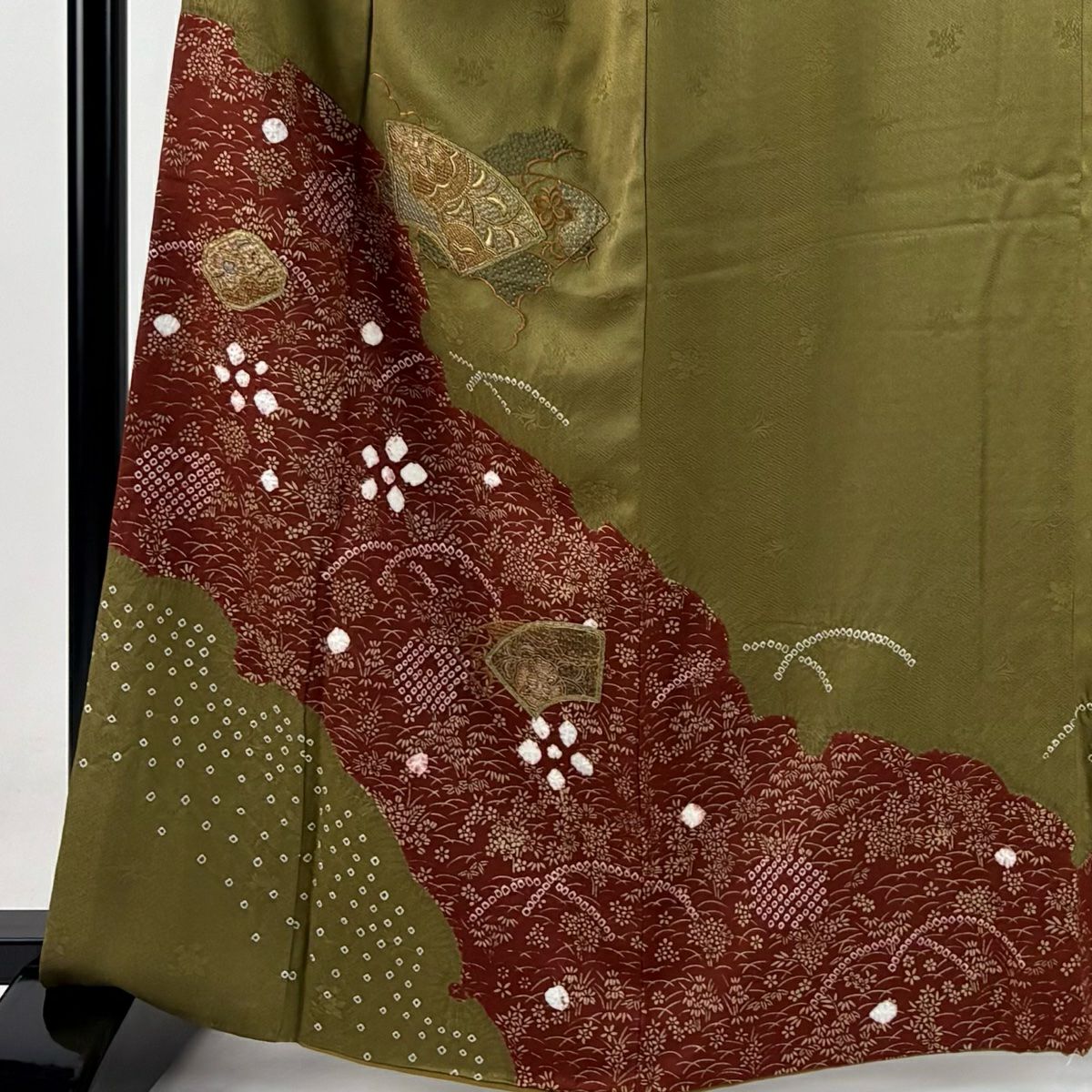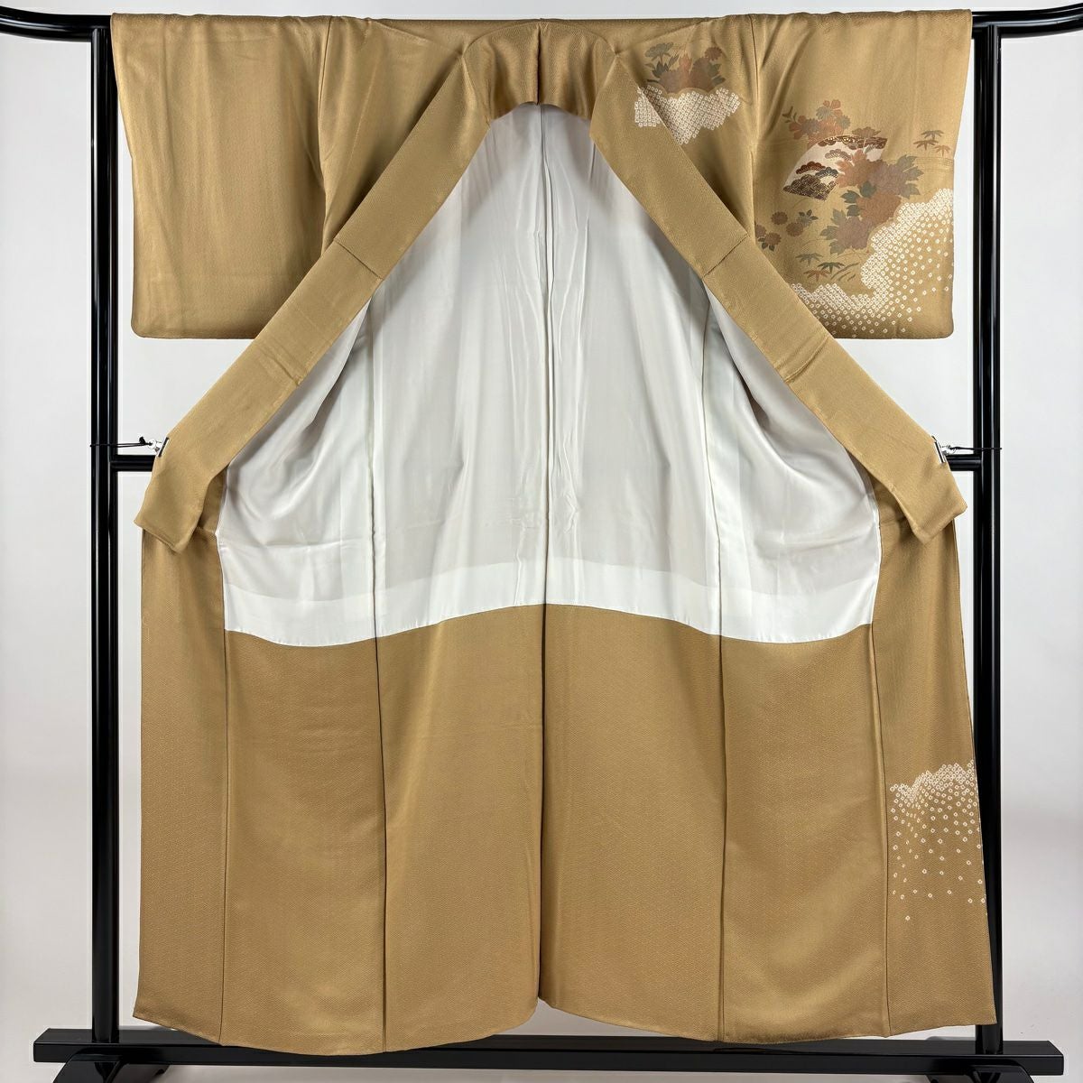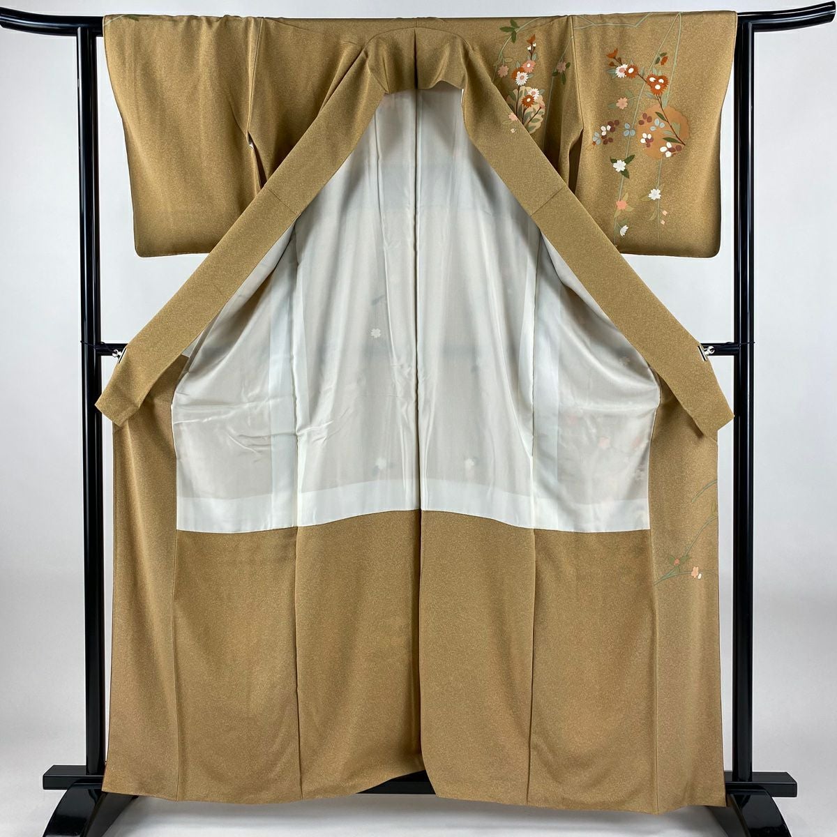 【在庫一掃】 付下げ 身丈154.5cm 裄丈62.5cm S 袷 扇 草花 刺繍 金銀彩 抹茶色 正絹 秀品