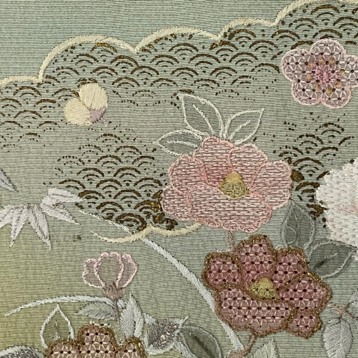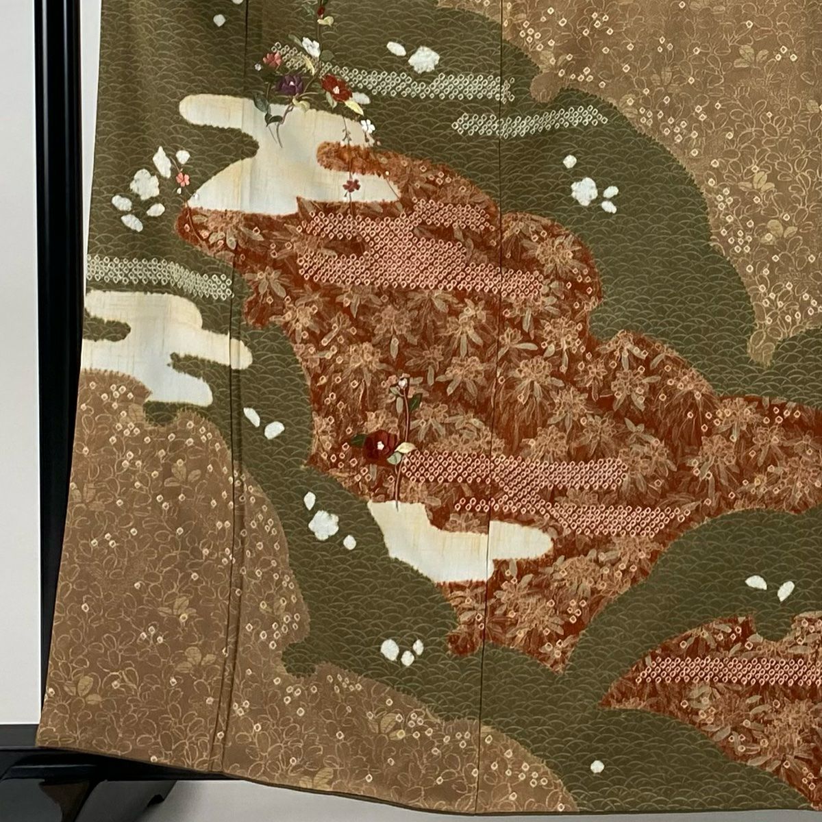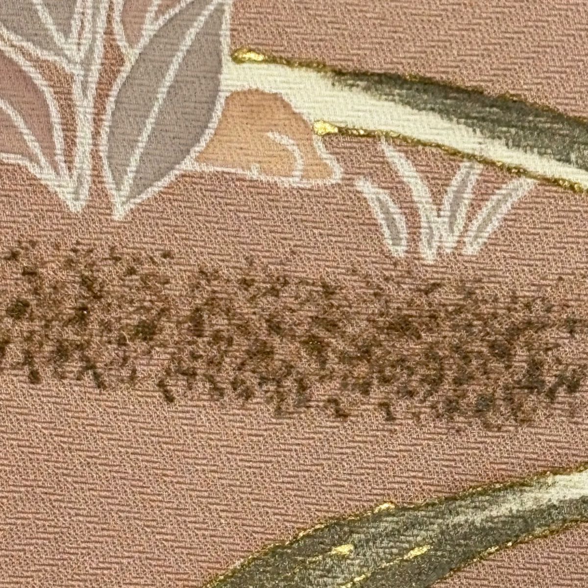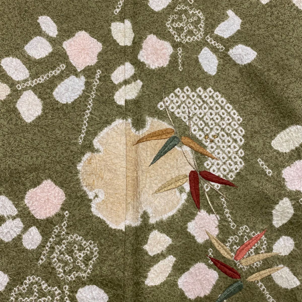 【在庫一掃】 付下げ 身丈154.5cm 裄丈62.5cm S 袷 扇 草花 刺繍 金銀彩 抹茶色 正絹 秀品