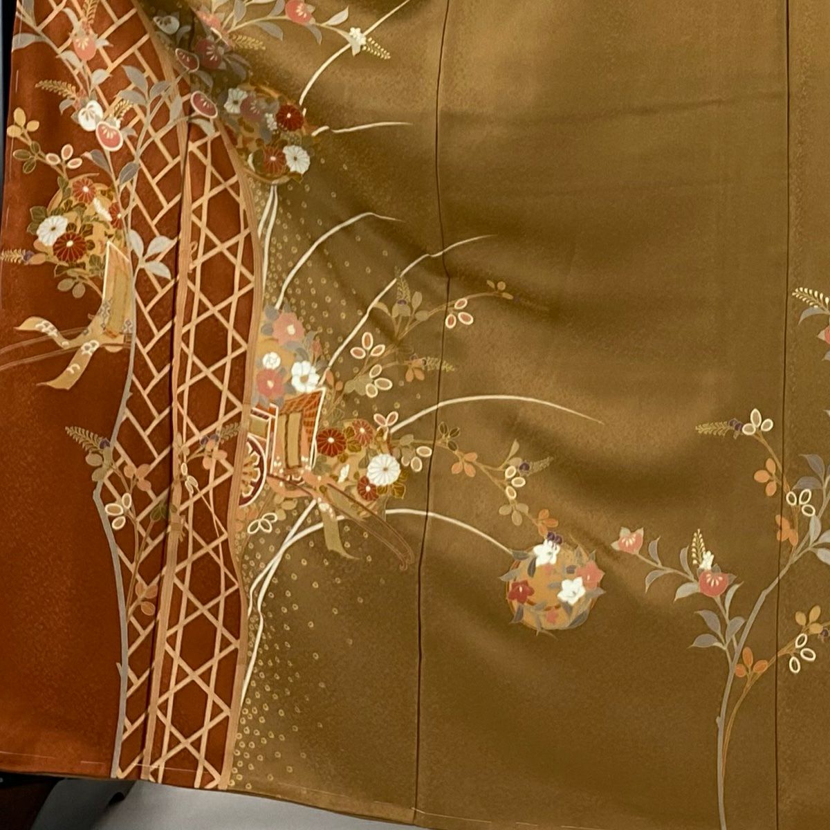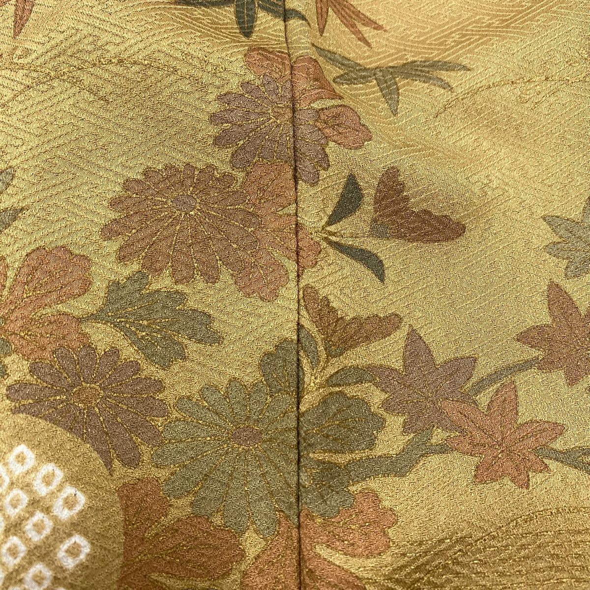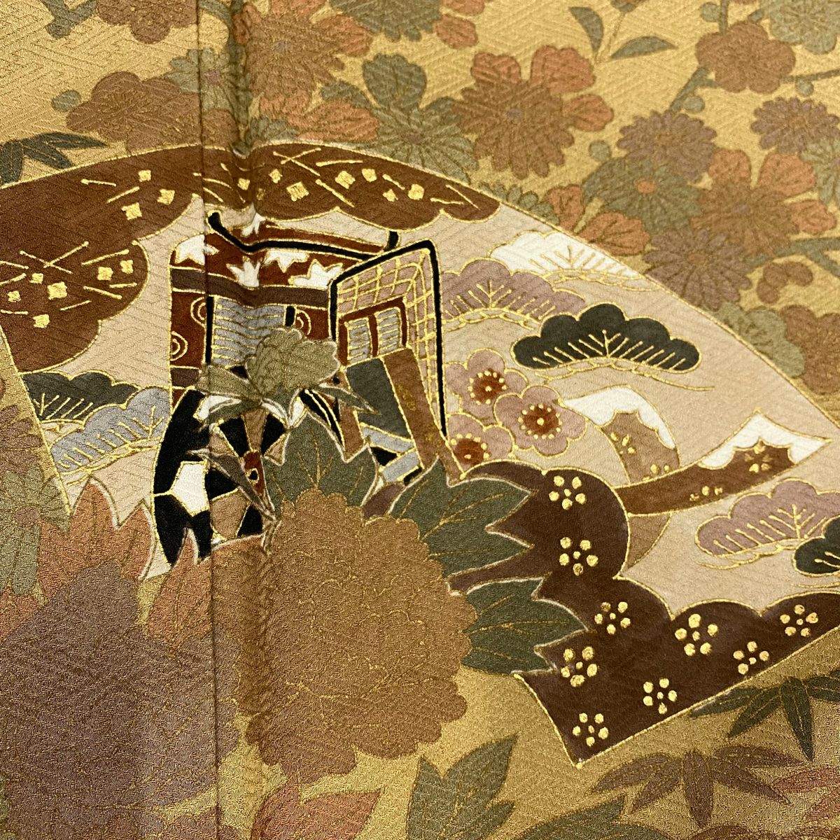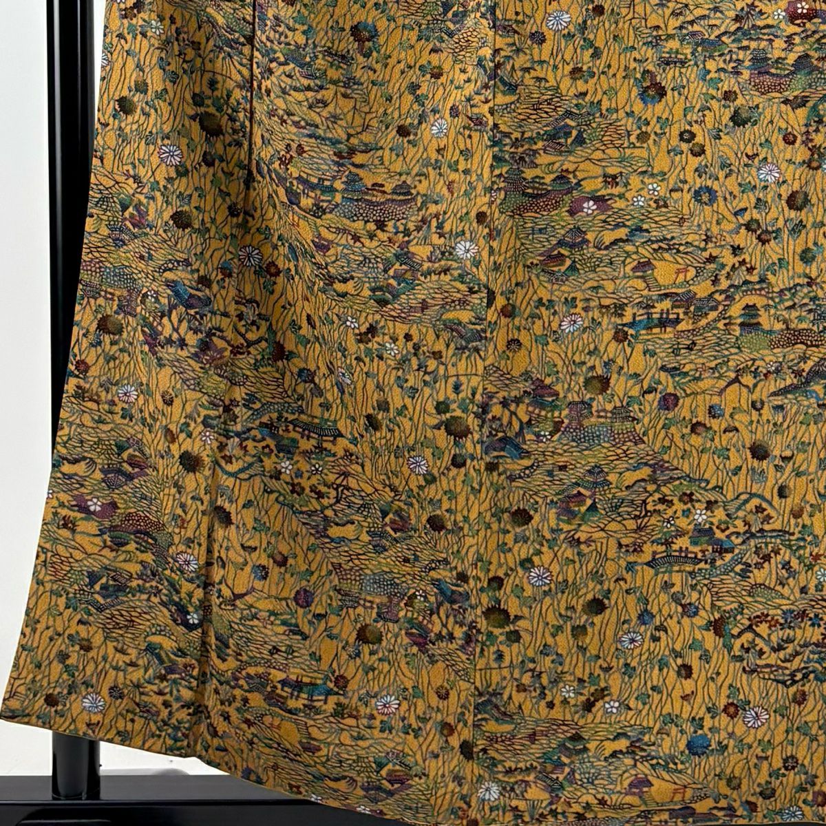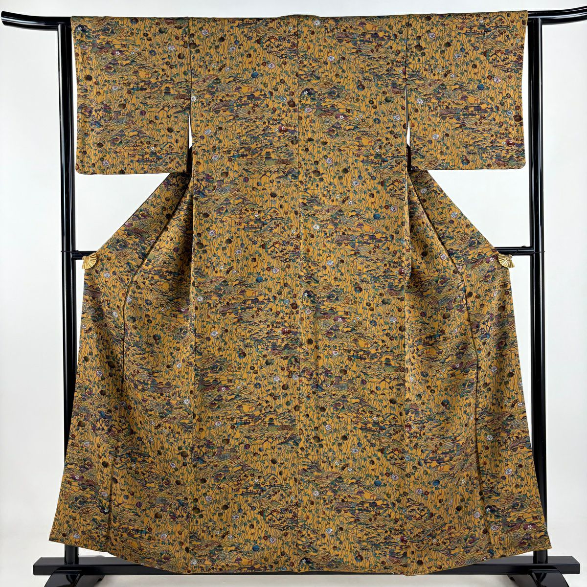 【在庫一掃】 【美品】 小紋 身丈157cm 裄丈61.5cm S 袷 家屋 菊 金彩 山吹茶色 正絹 秀品