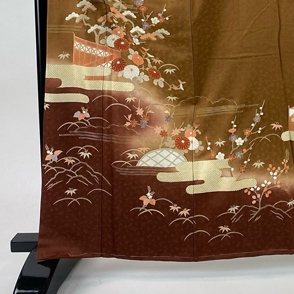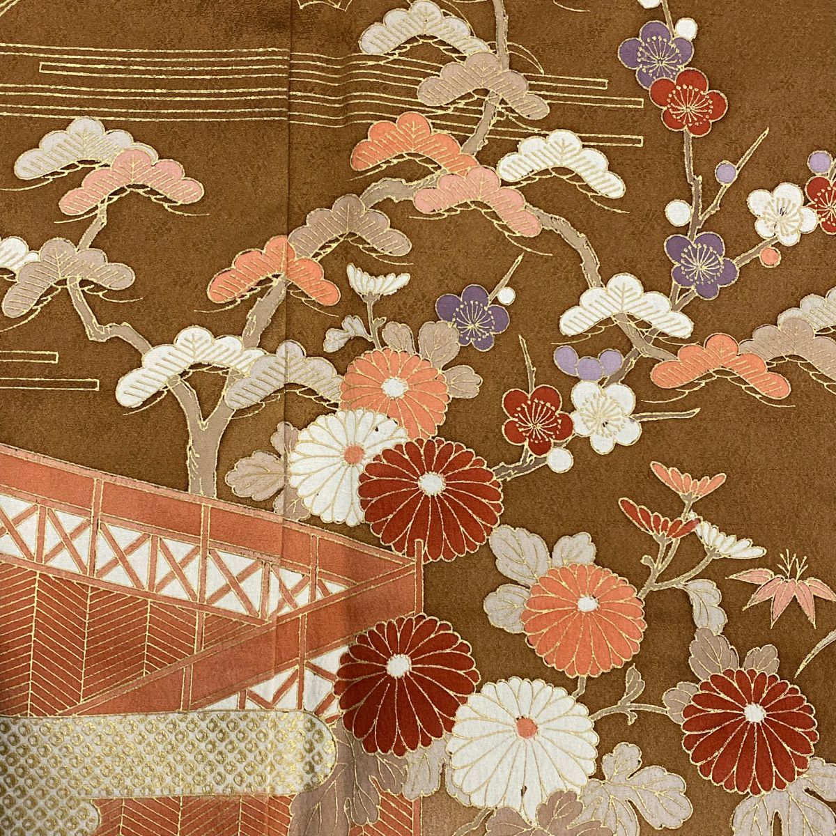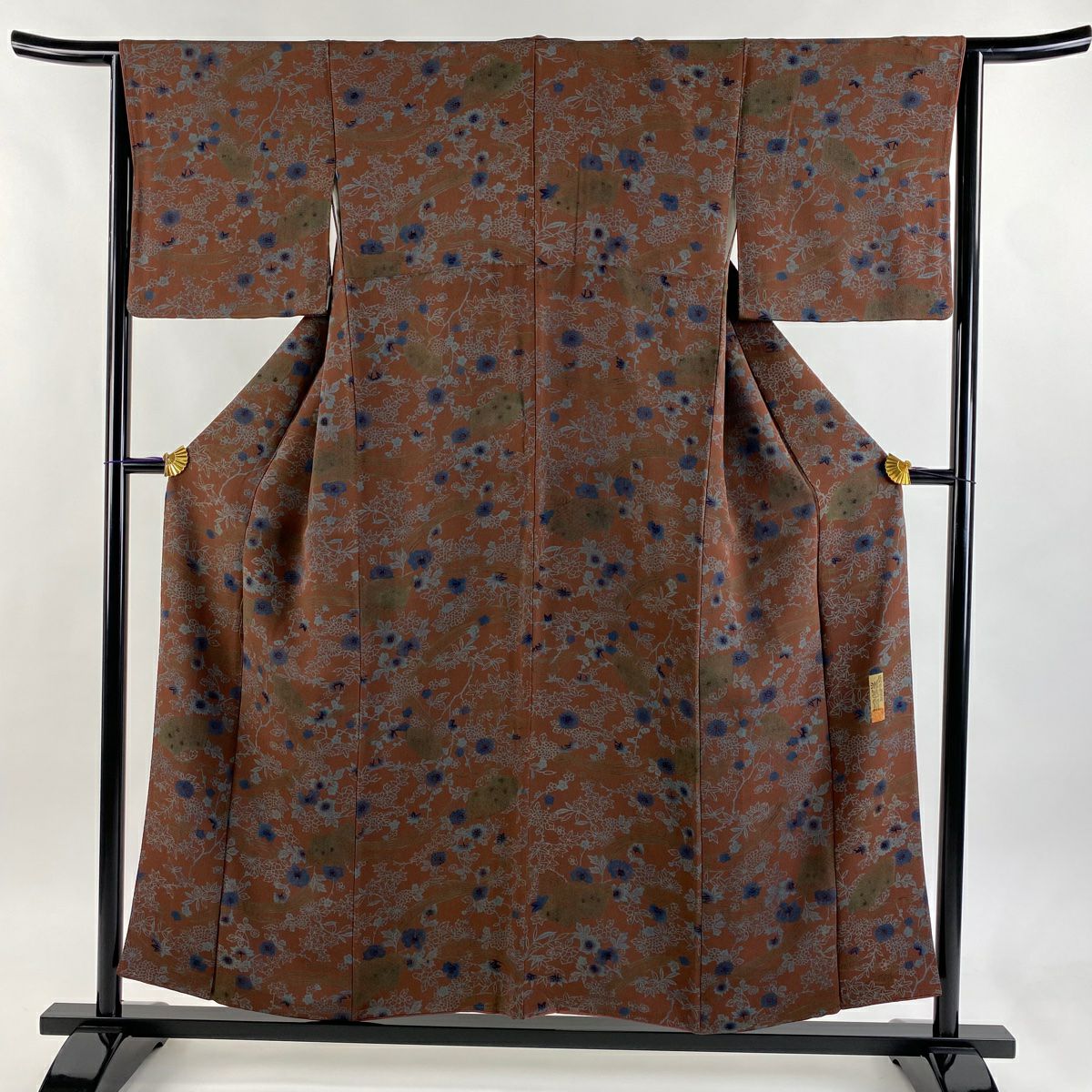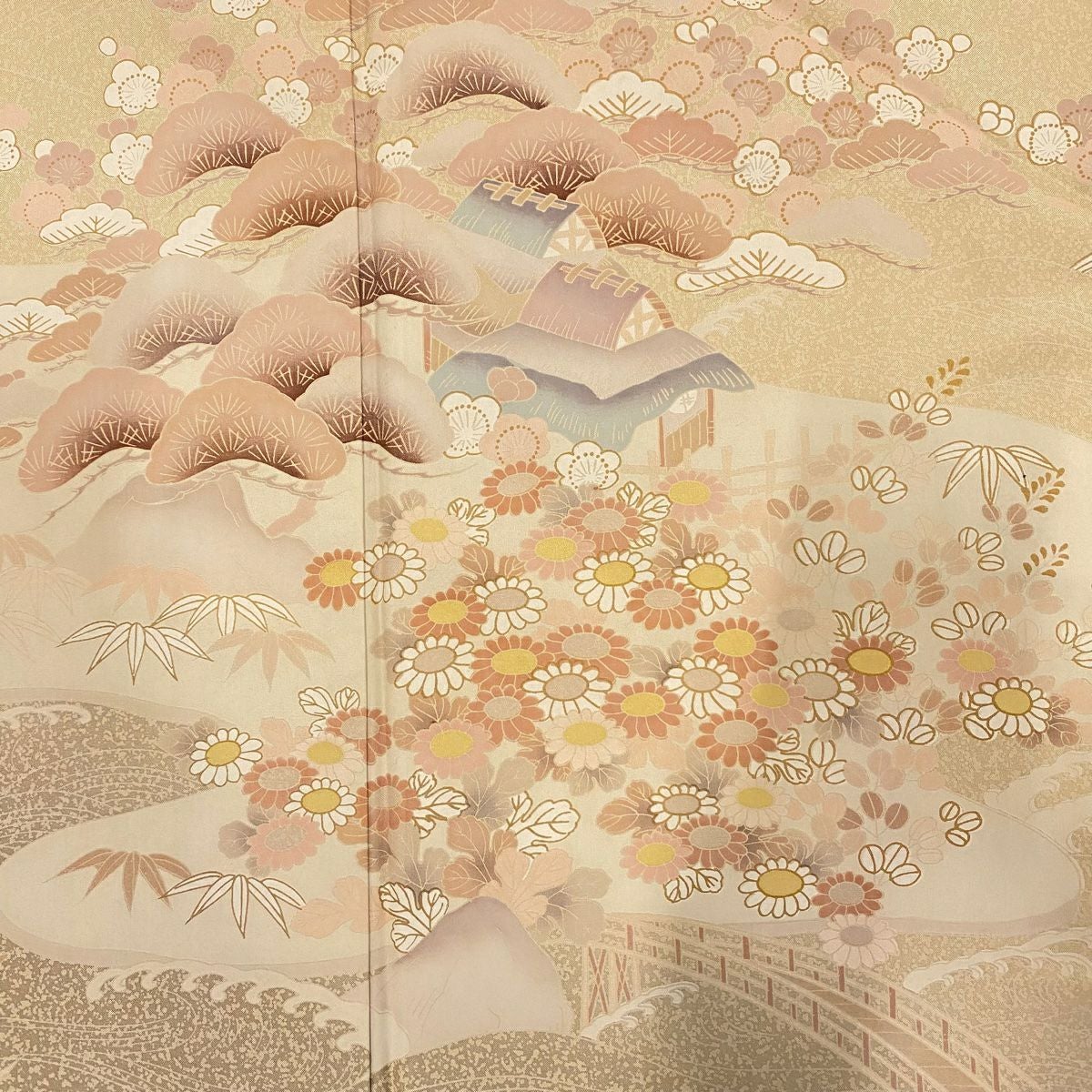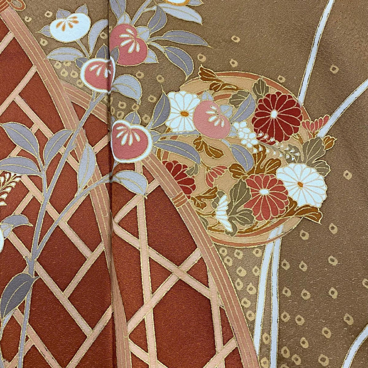 【在庫一掃】 【美品】 小紋 身丈157cm 裄丈61.5cm S 袷 家屋 菊 金彩 山吹茶色 正絹 秀品