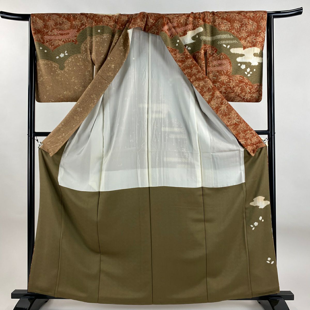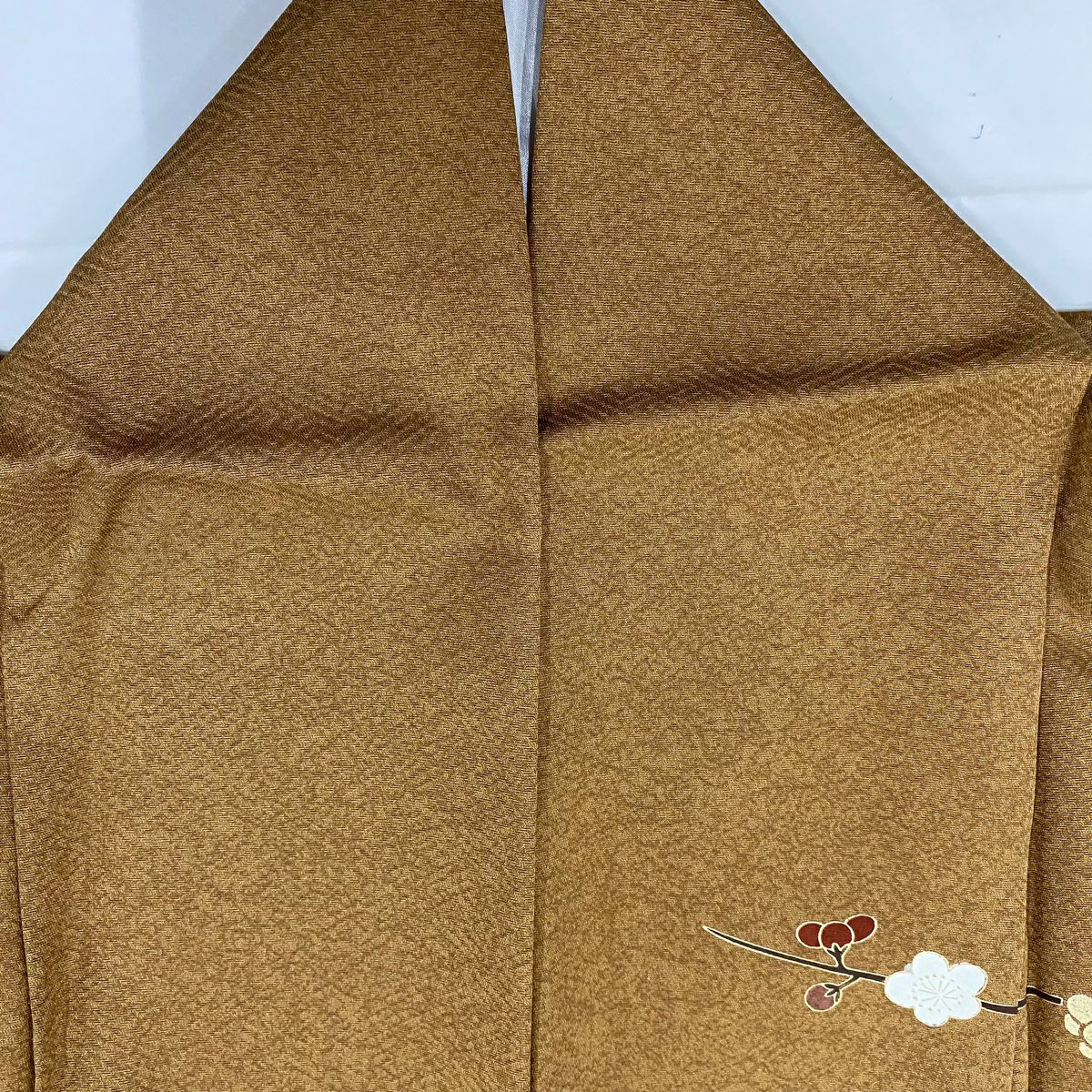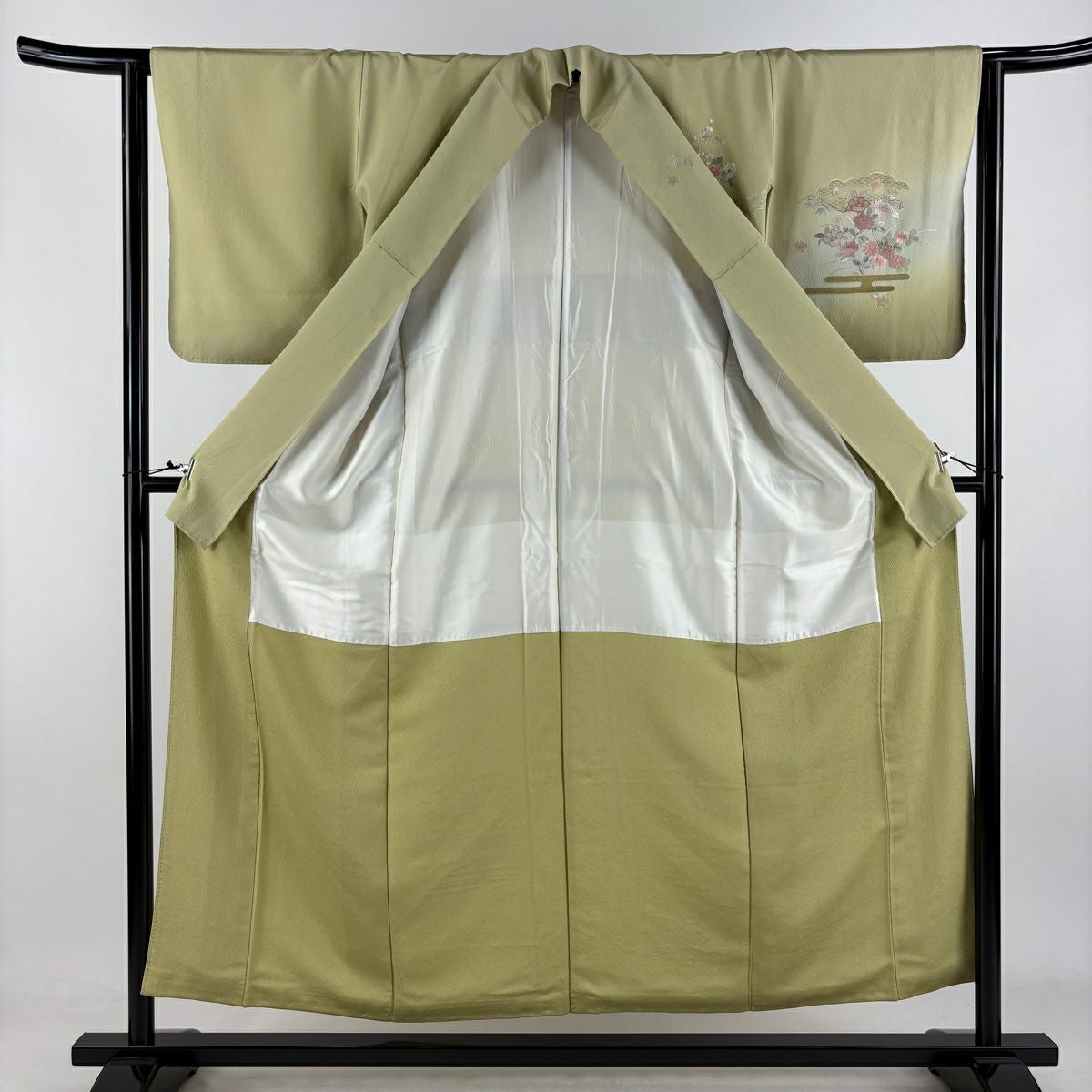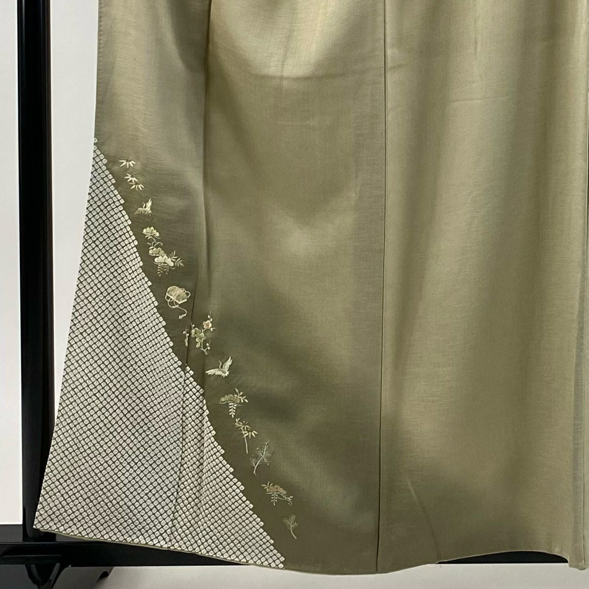 【在庫一掃】 訪問着 身丈163.5cm 裄丈65.5cm M 袷 梅 鳳凰 刺繍 金銀彩 茶緑色 正絹 秀品