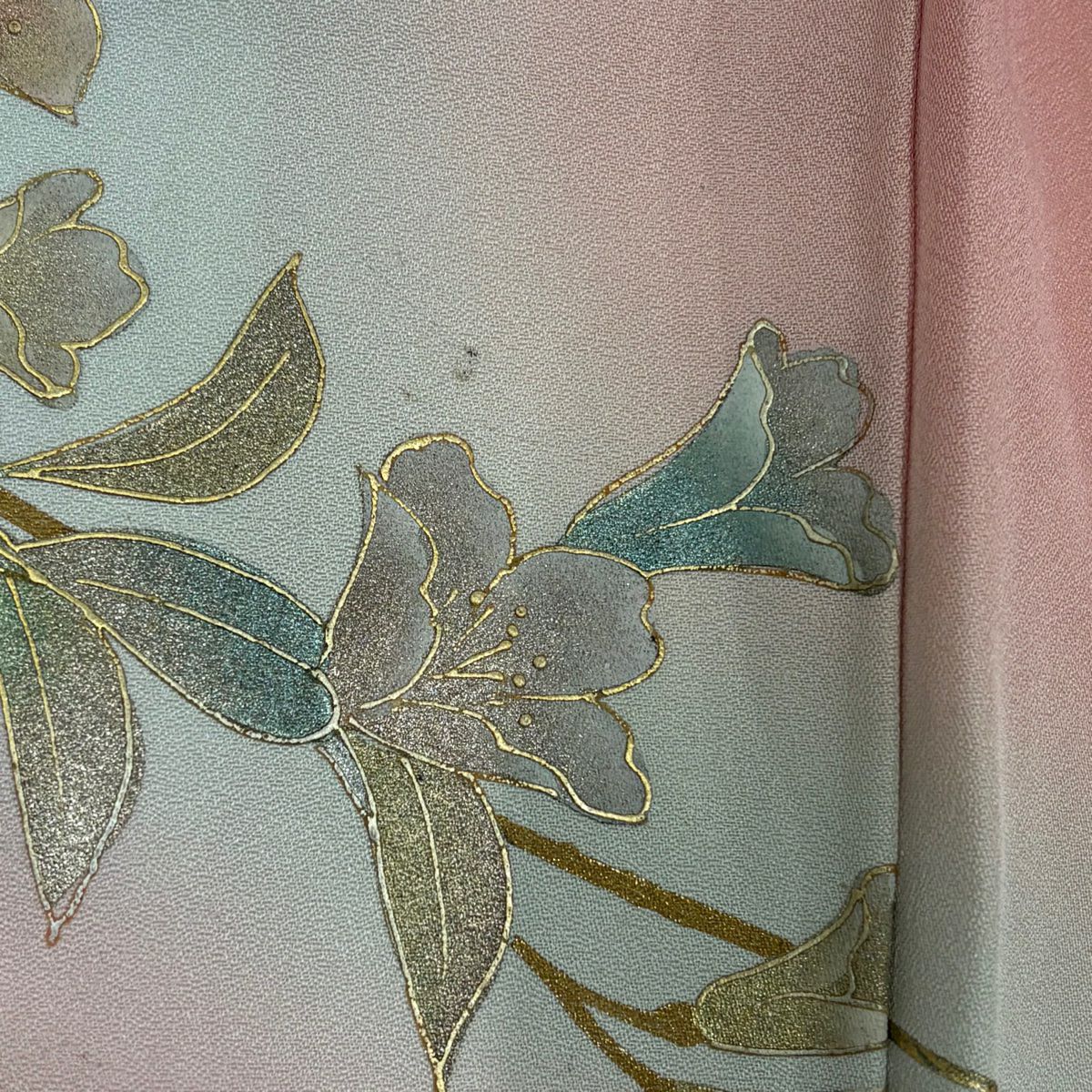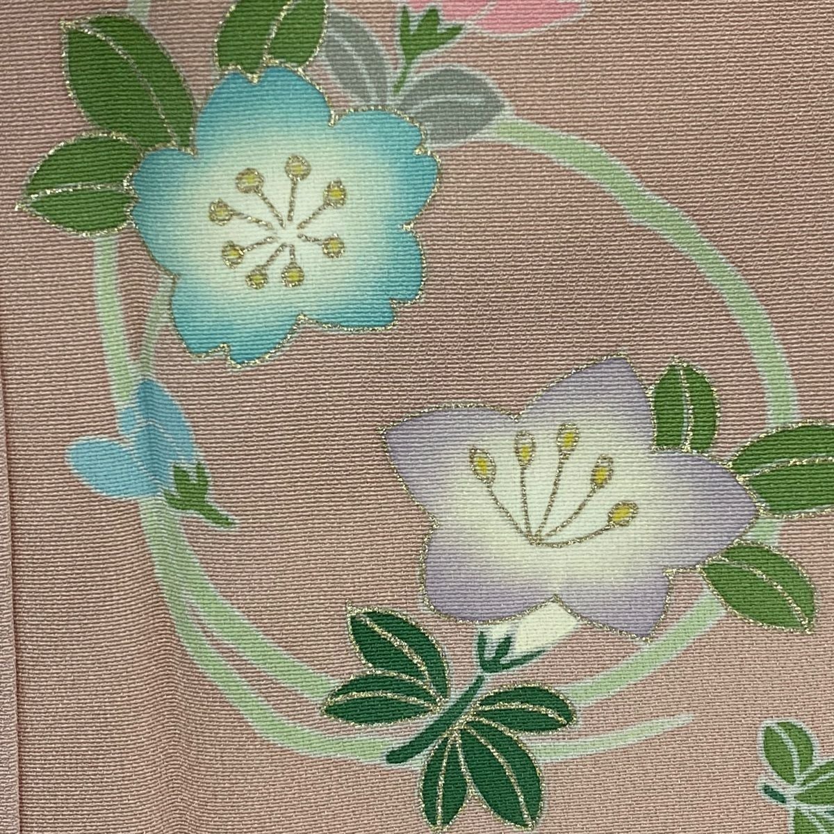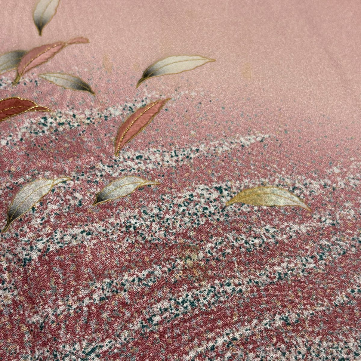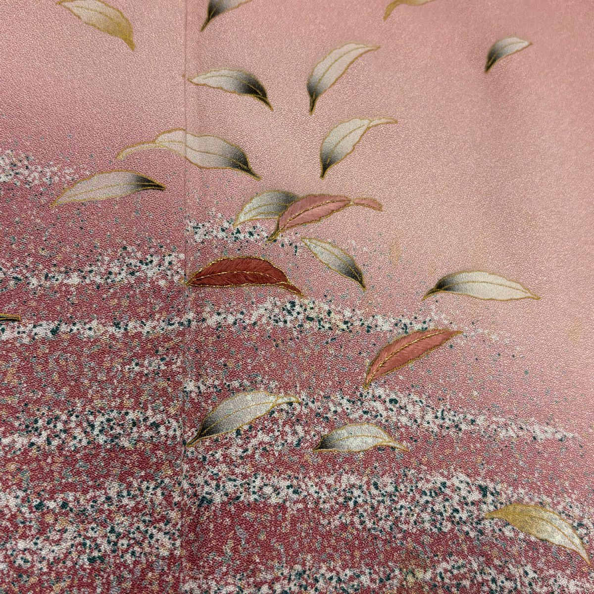 【在庫一掃】 訪問着 身丈154cm 裄丈66.5cm M 袷 葉柄 霞 刺繍 金彩 ピンク 正絹 秀品