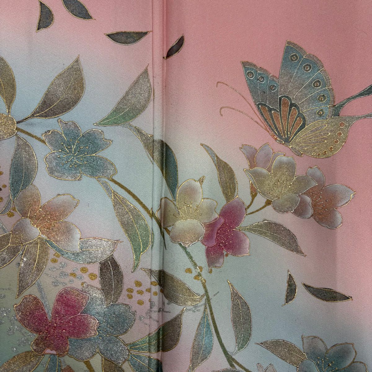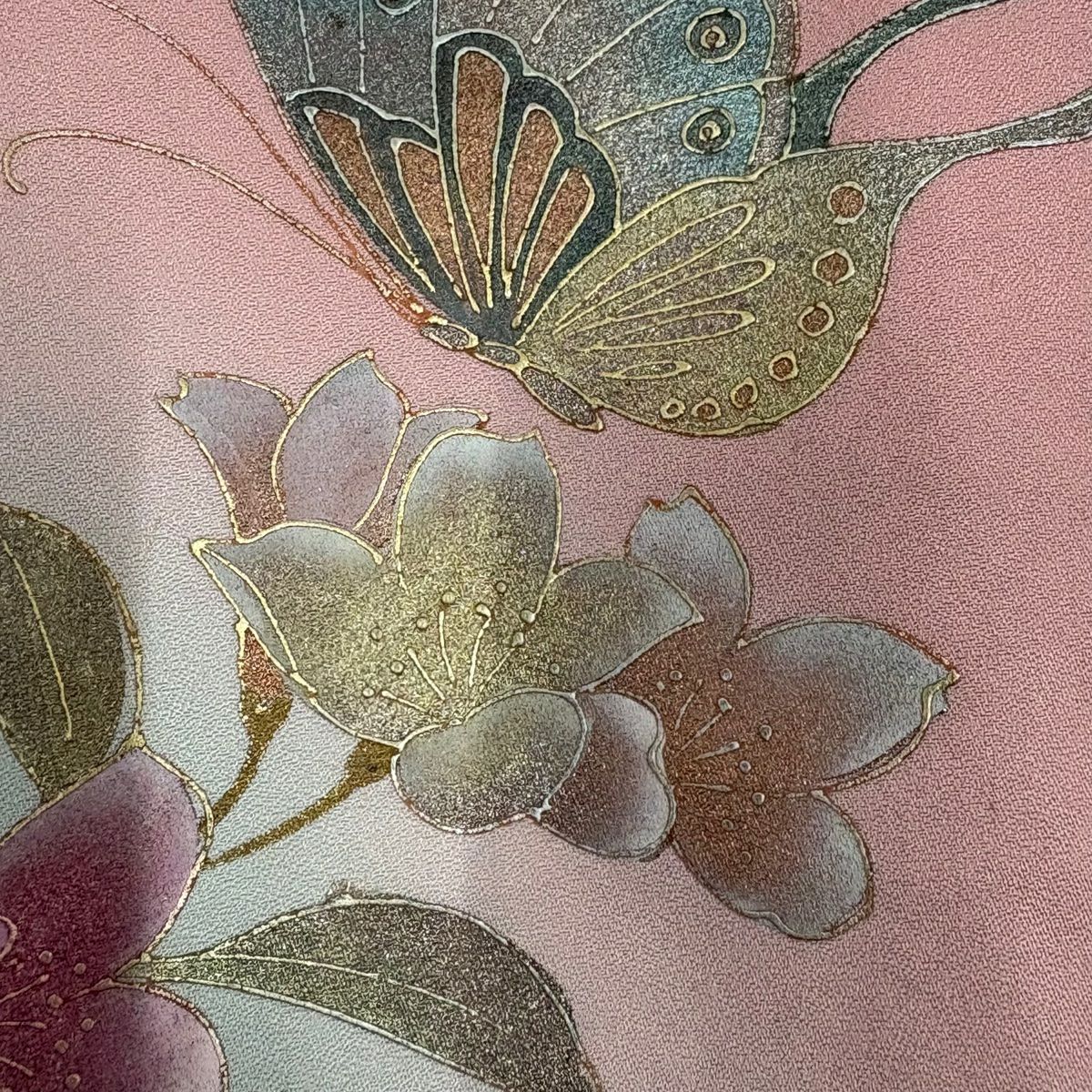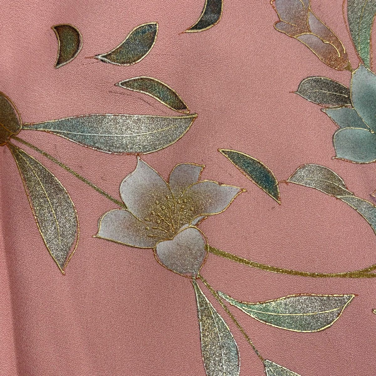 【在庫一掃】 訪問着 身丈154cm 裄丈66.5cm M 袷 葉柄 霞 刺繍 金彩 ピンク 正絹 秀品