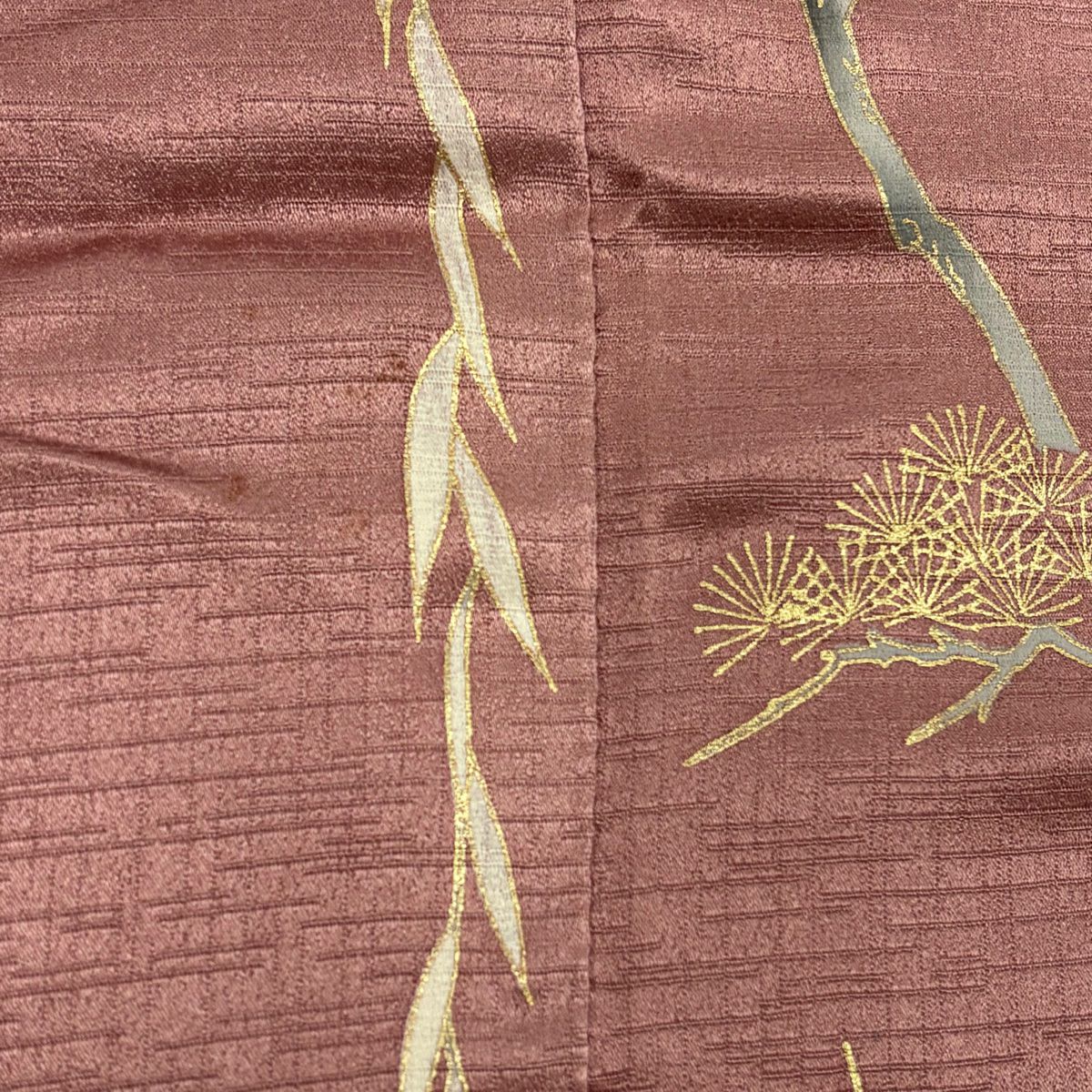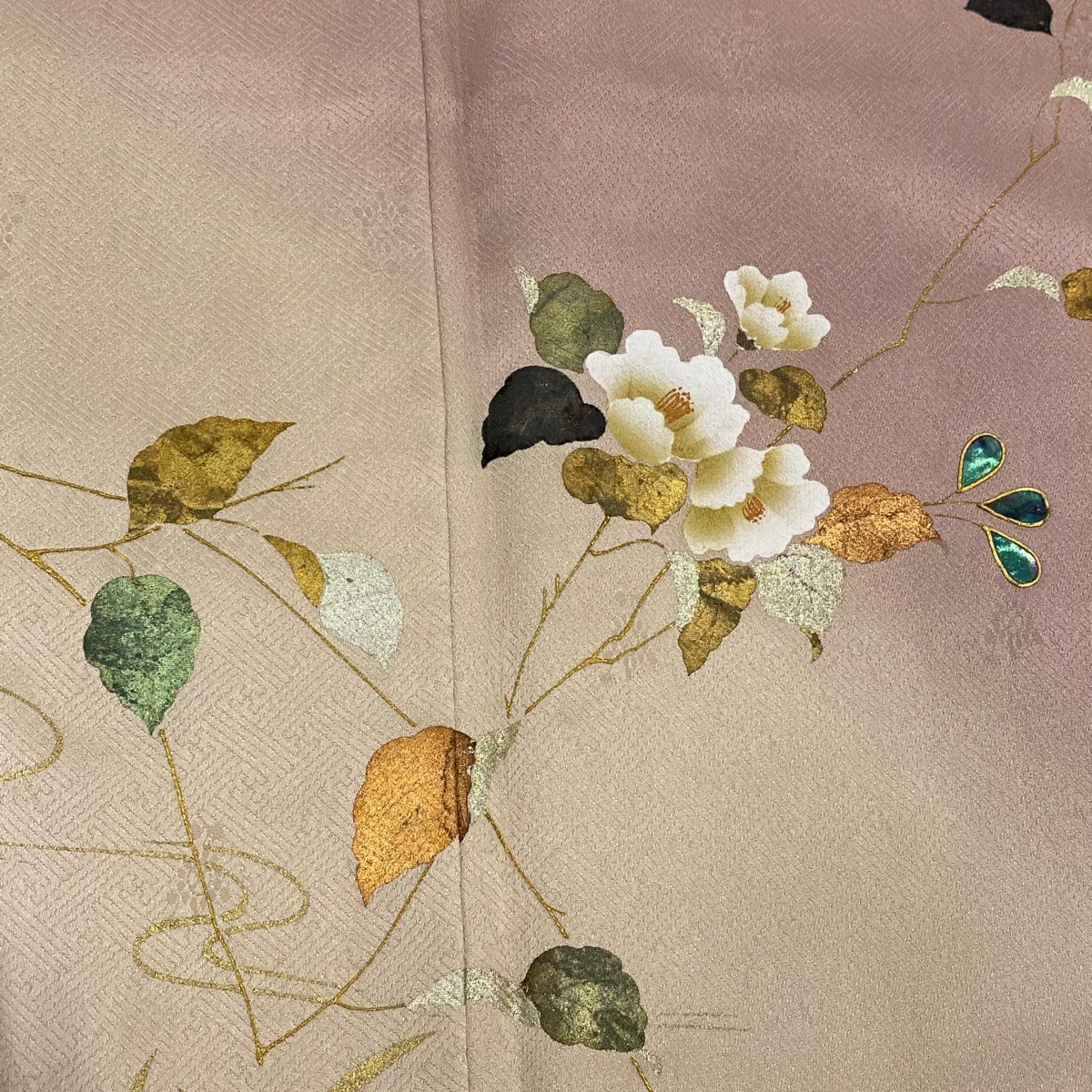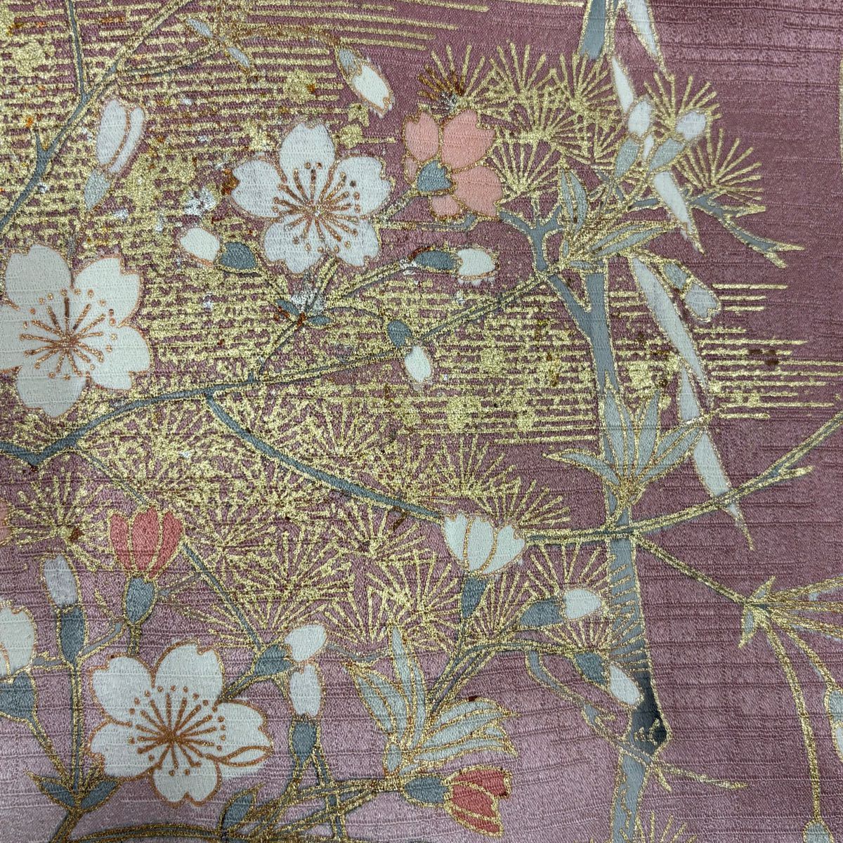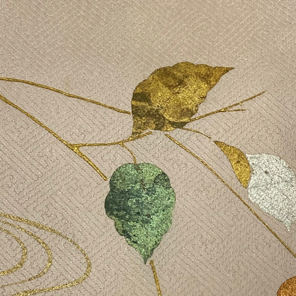 【在庫一掃】 訪問着 身丈154cm 裄丈66.5cm M 袷 葉柄 霞 刺繍 金彩 ピンク 正絹 秀品
