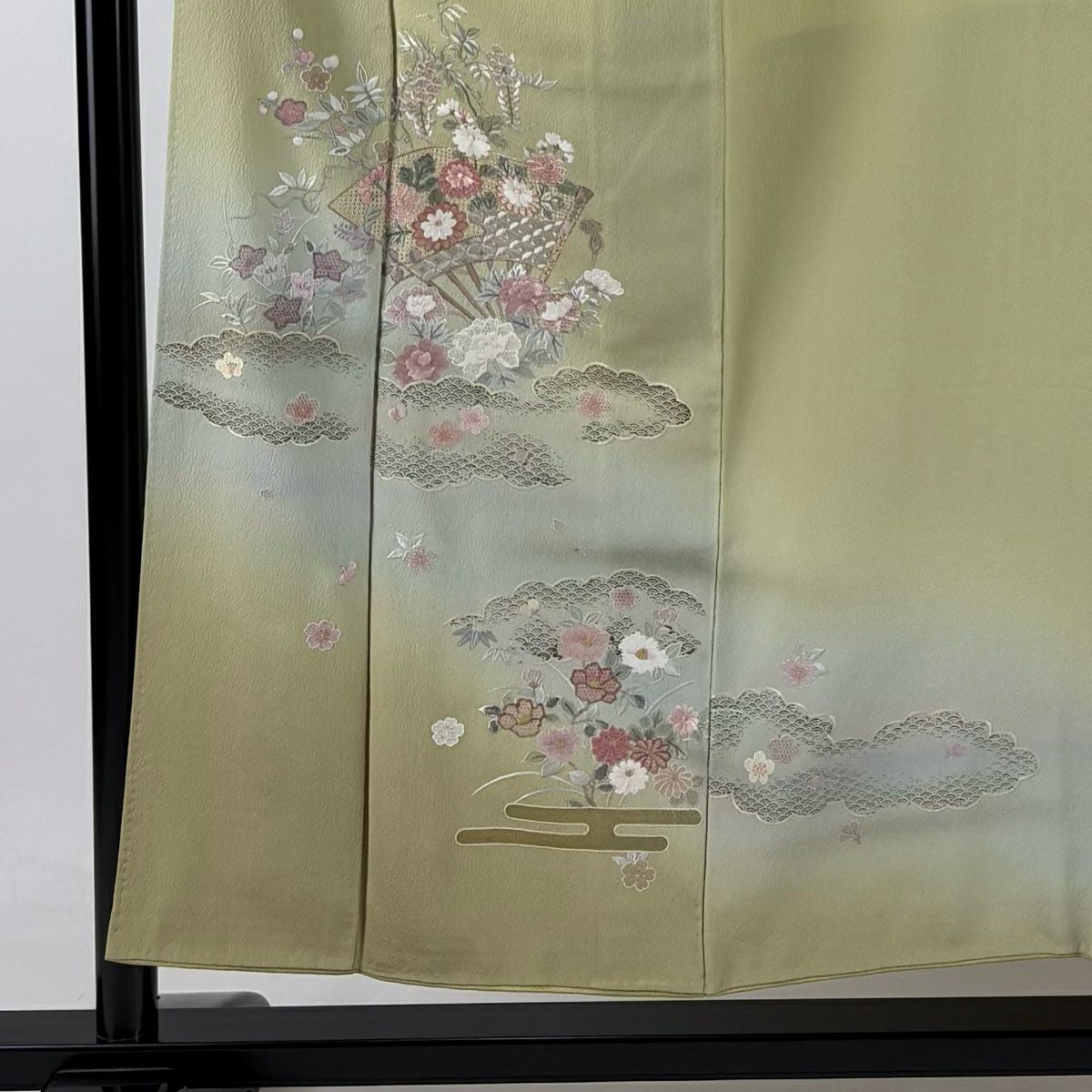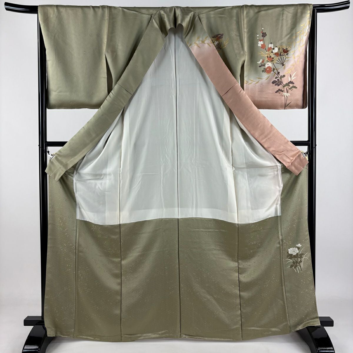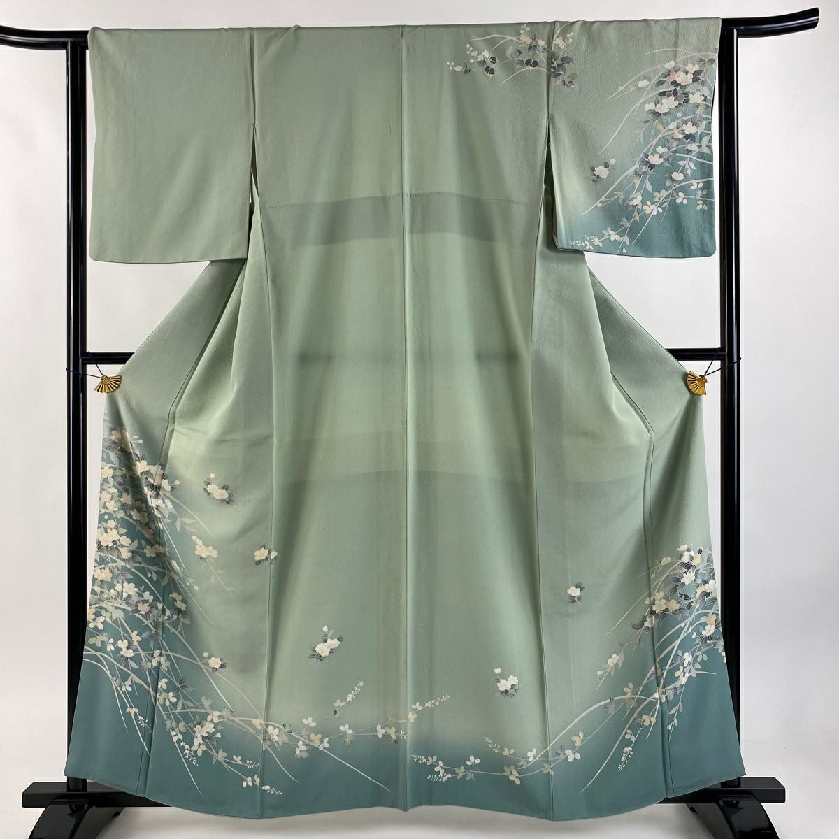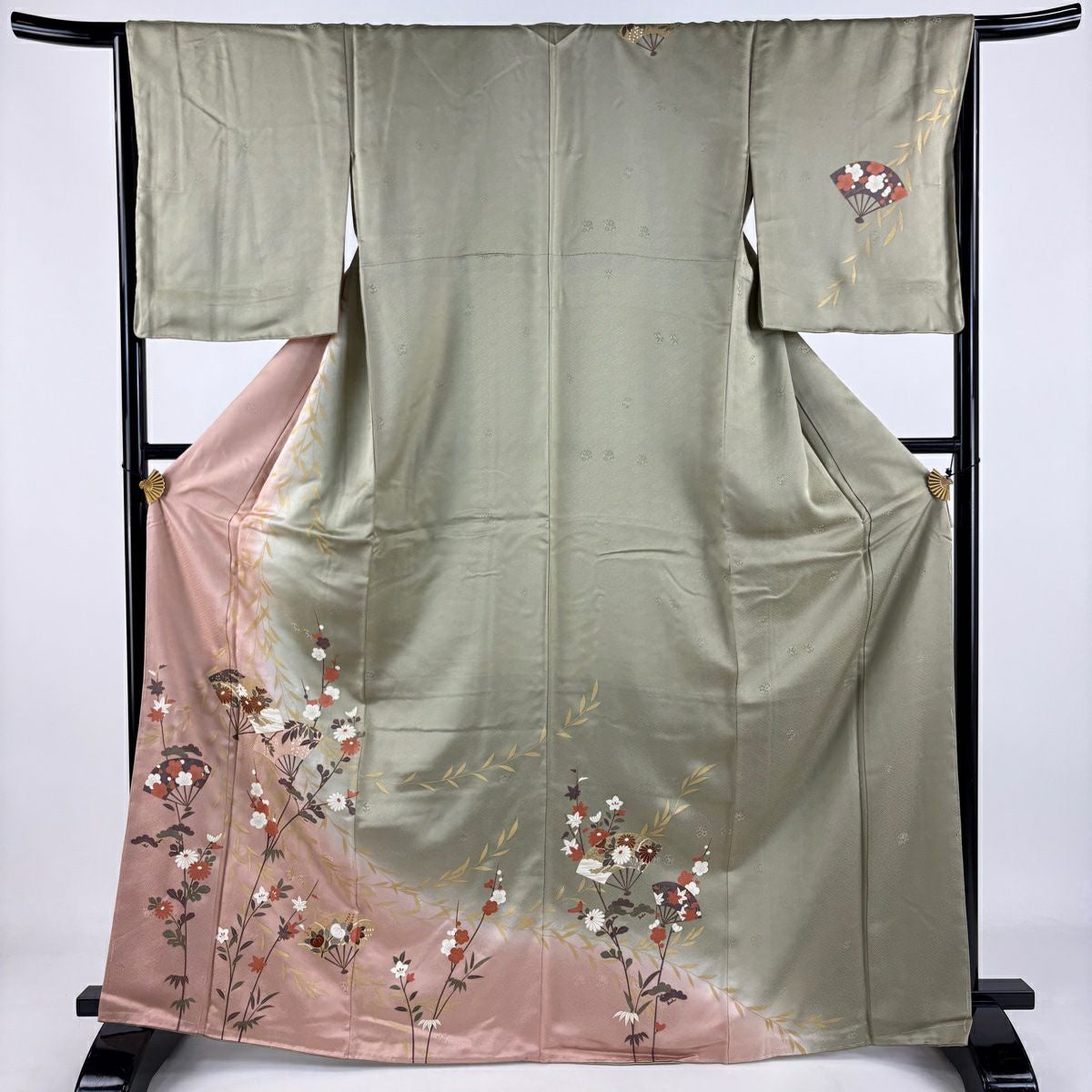 【在庫一掃】 訪問着 身丈168cm 裄丈65.5cm M 袷 扇 枝花 金彩 染め分け 灰緑 正絹 秀品