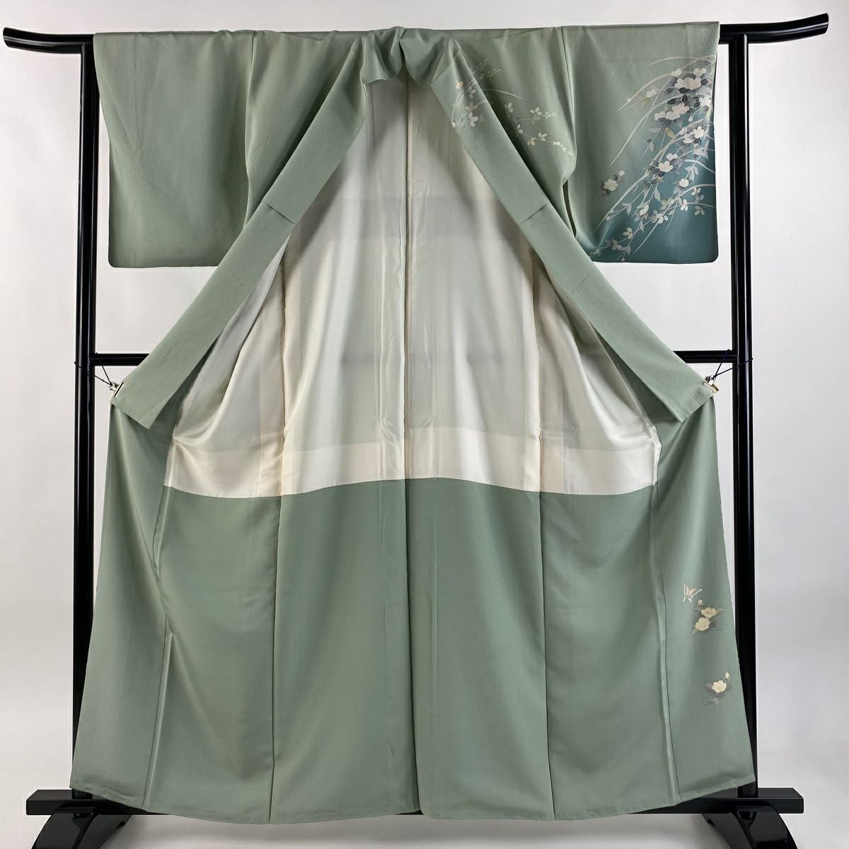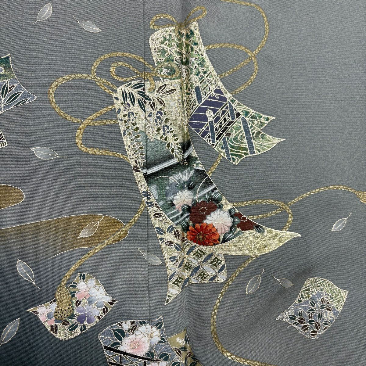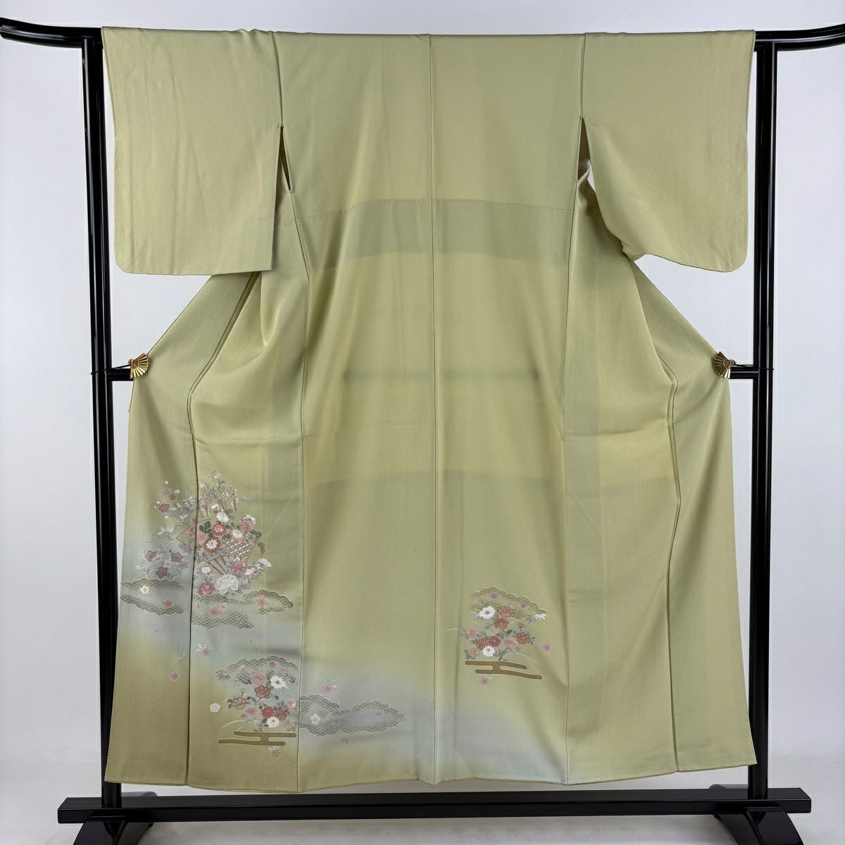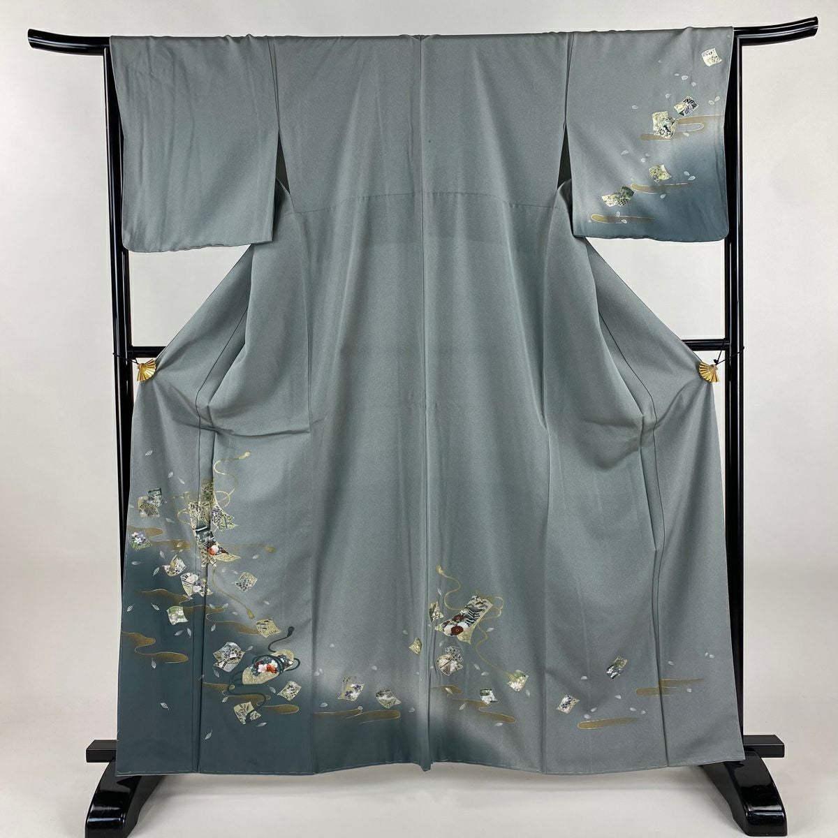 【在庫一掃】 訪問着 身丈168cm 裄丈65.5cm M 袷 扇 枝花 金彩 染め分け 灰緑 正絹 秀品