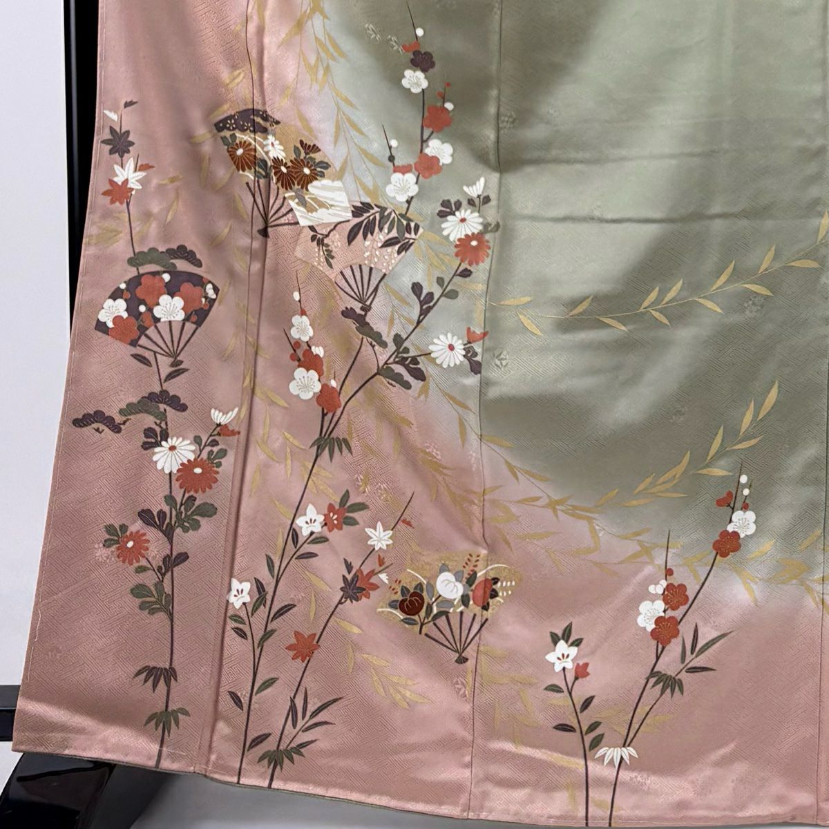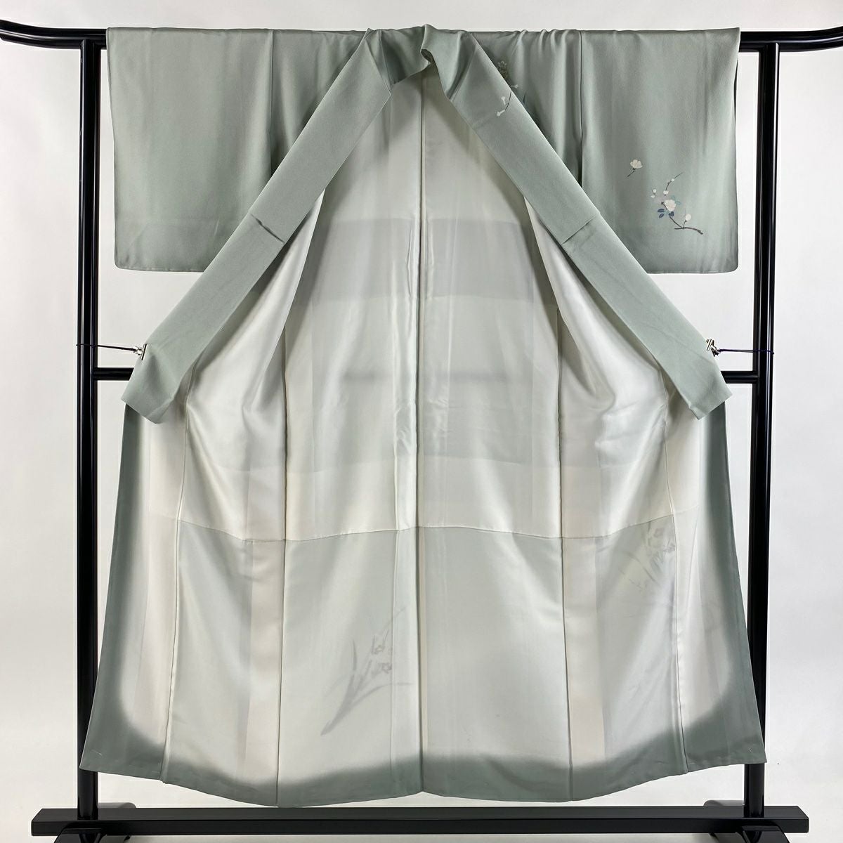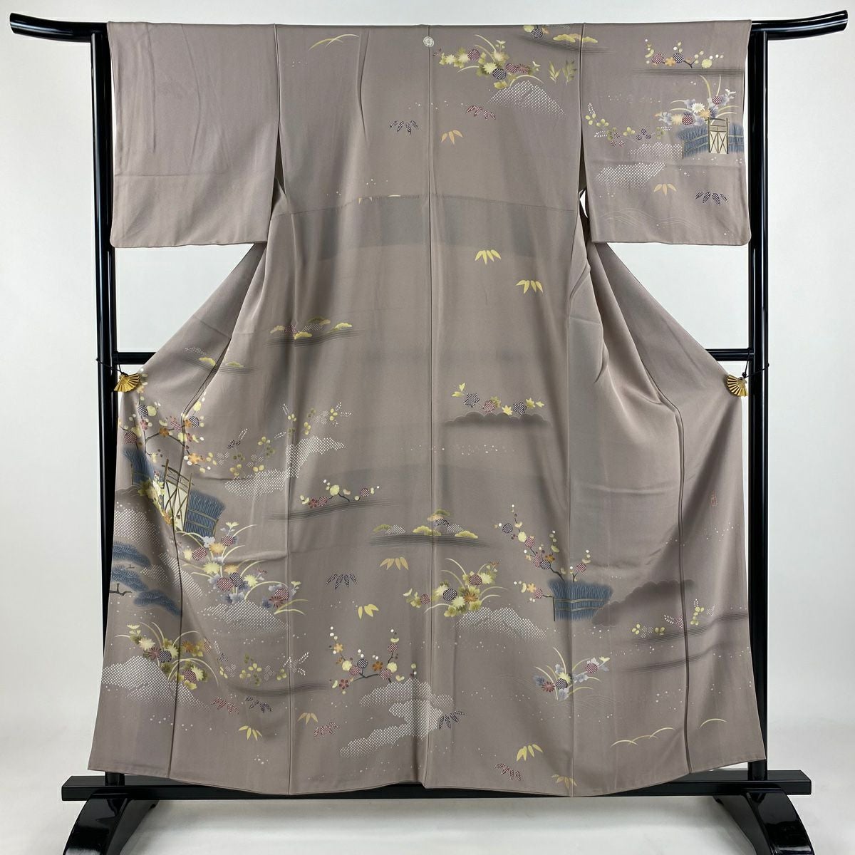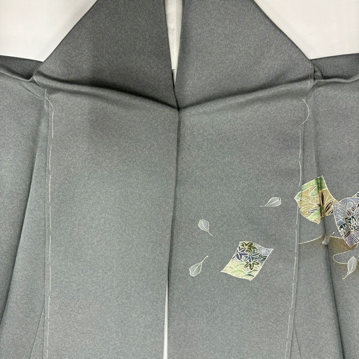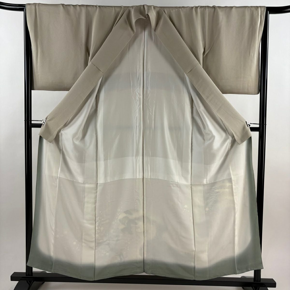 【在庫一掃】 訪問着 身丈168cm 裄丈65.5cm M 袷 扇 枝花 金彩 染め分け 灰緑 正絹 秀品