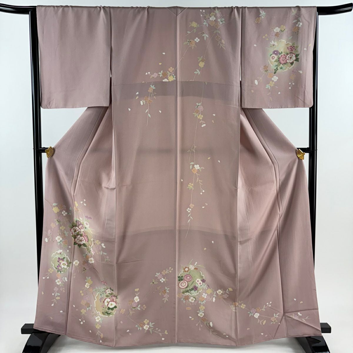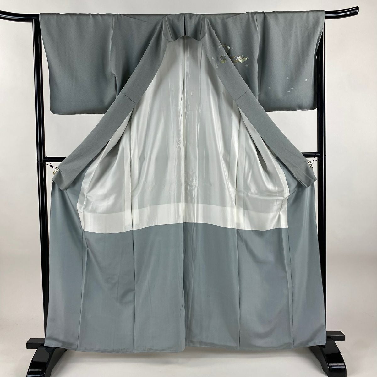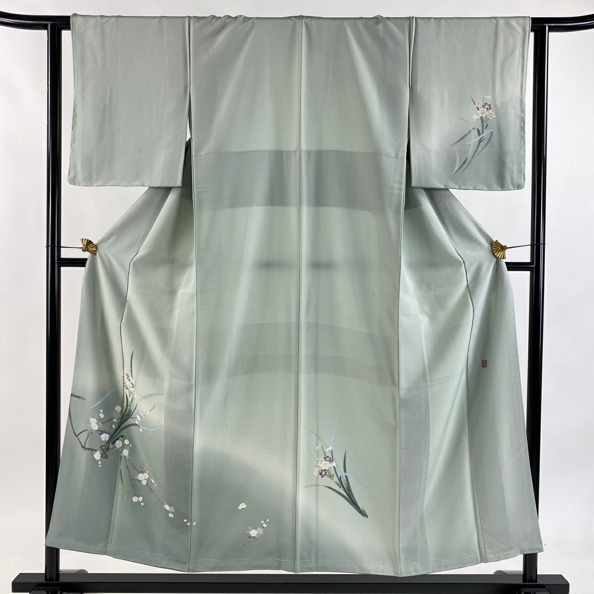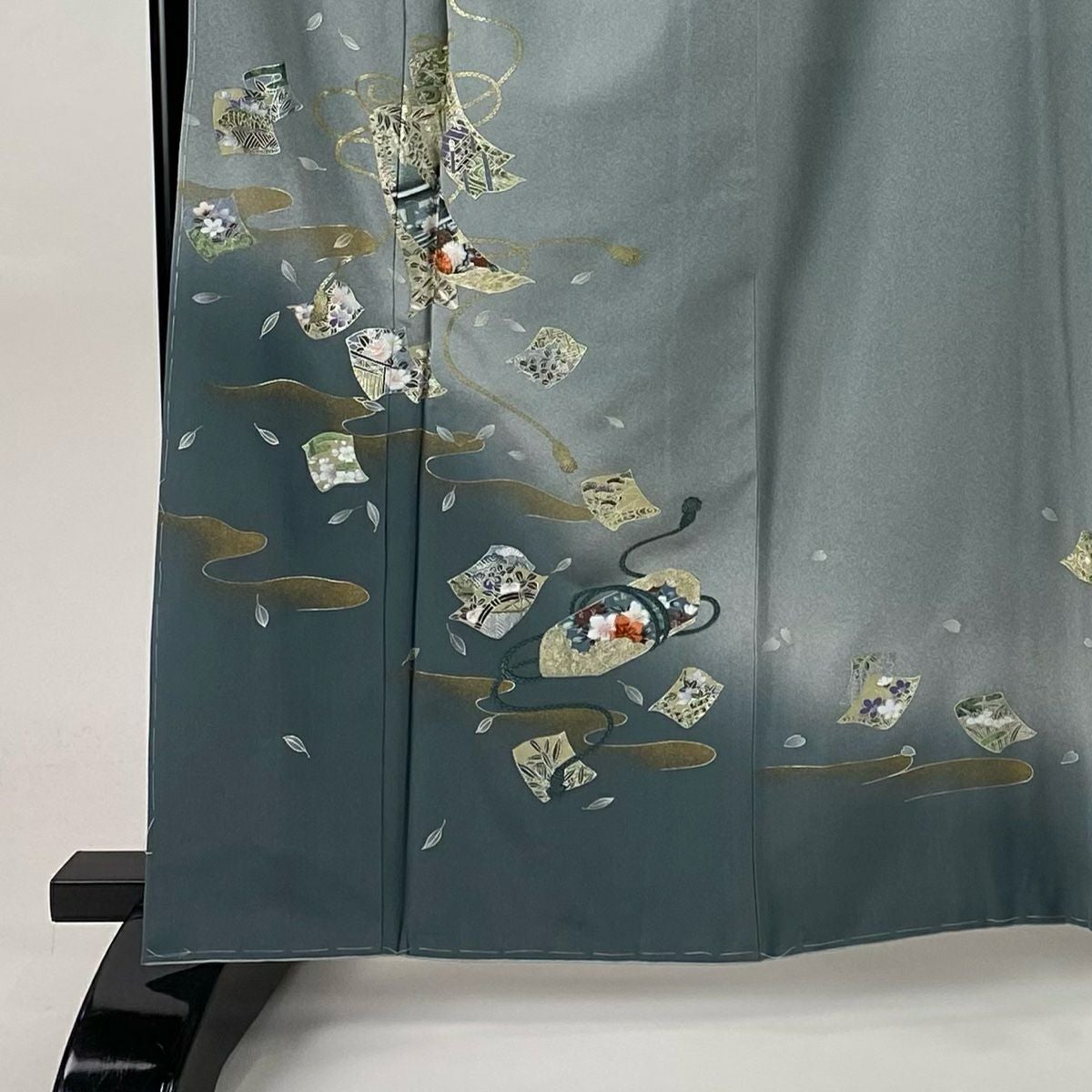 【在庫一掃】 訪問着 身丈168cm 裄丈65.5cm M 袷 扇 枝花 金彩 染め分け 灰緑 正絹 秀品