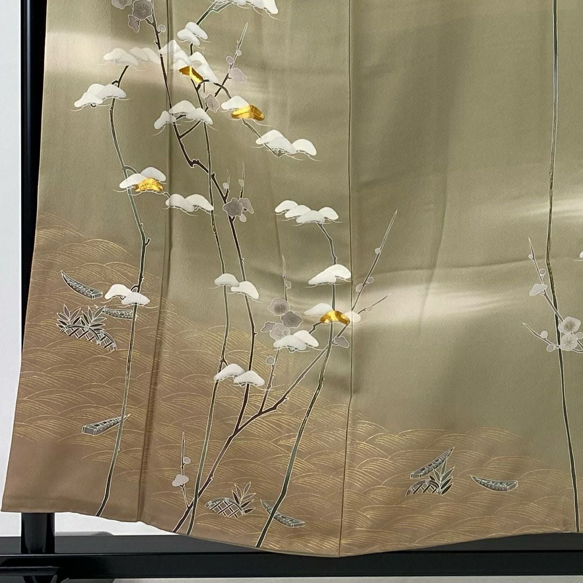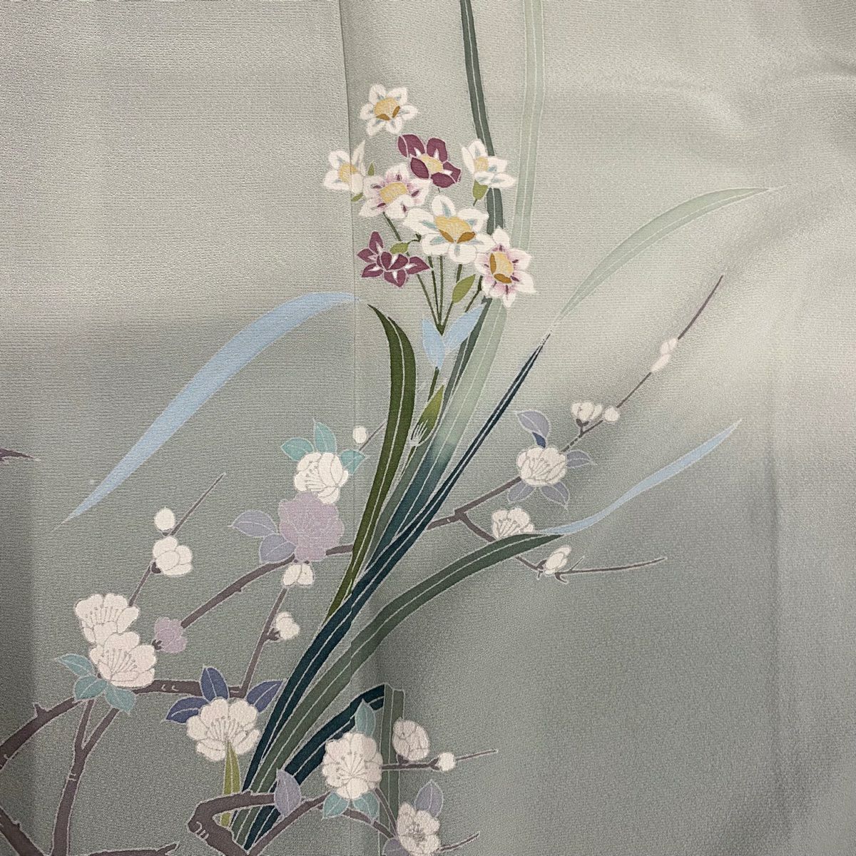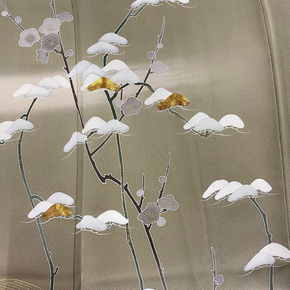 【在庫一掃】 訪問着 身丈156cm 裄丈63cm S 袷 落款あり 枝梅 松 金糸 金彩 灰緑 正絹 秀品