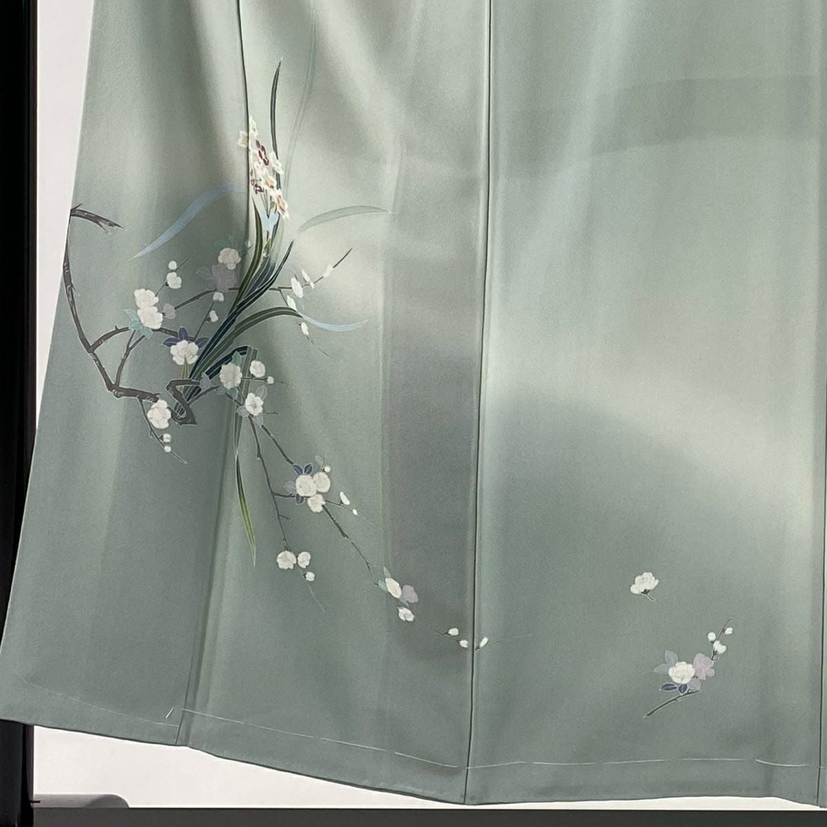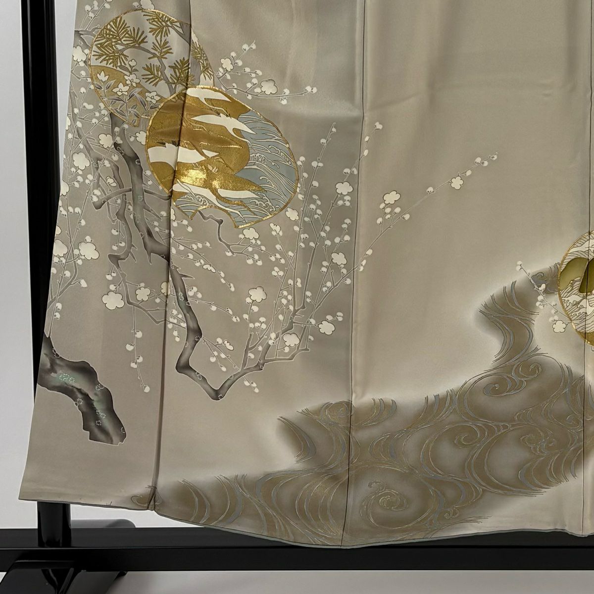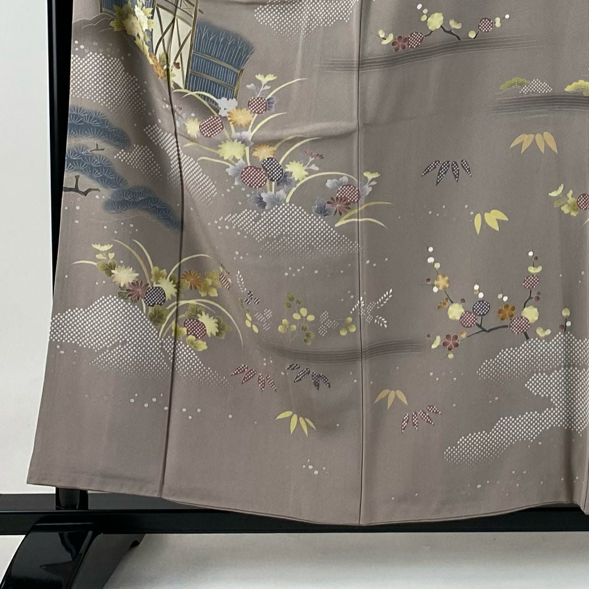 【在庫一掃】 訪問着 身丈156cm 裄丈63cm S 袷 落款あり 枝梅 松 金糸 金彩 灰緑 正絹 秀品