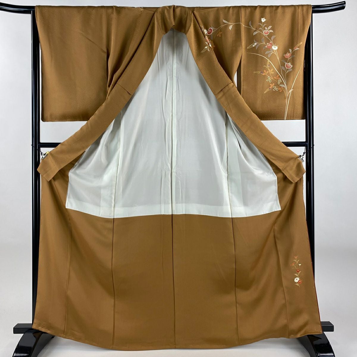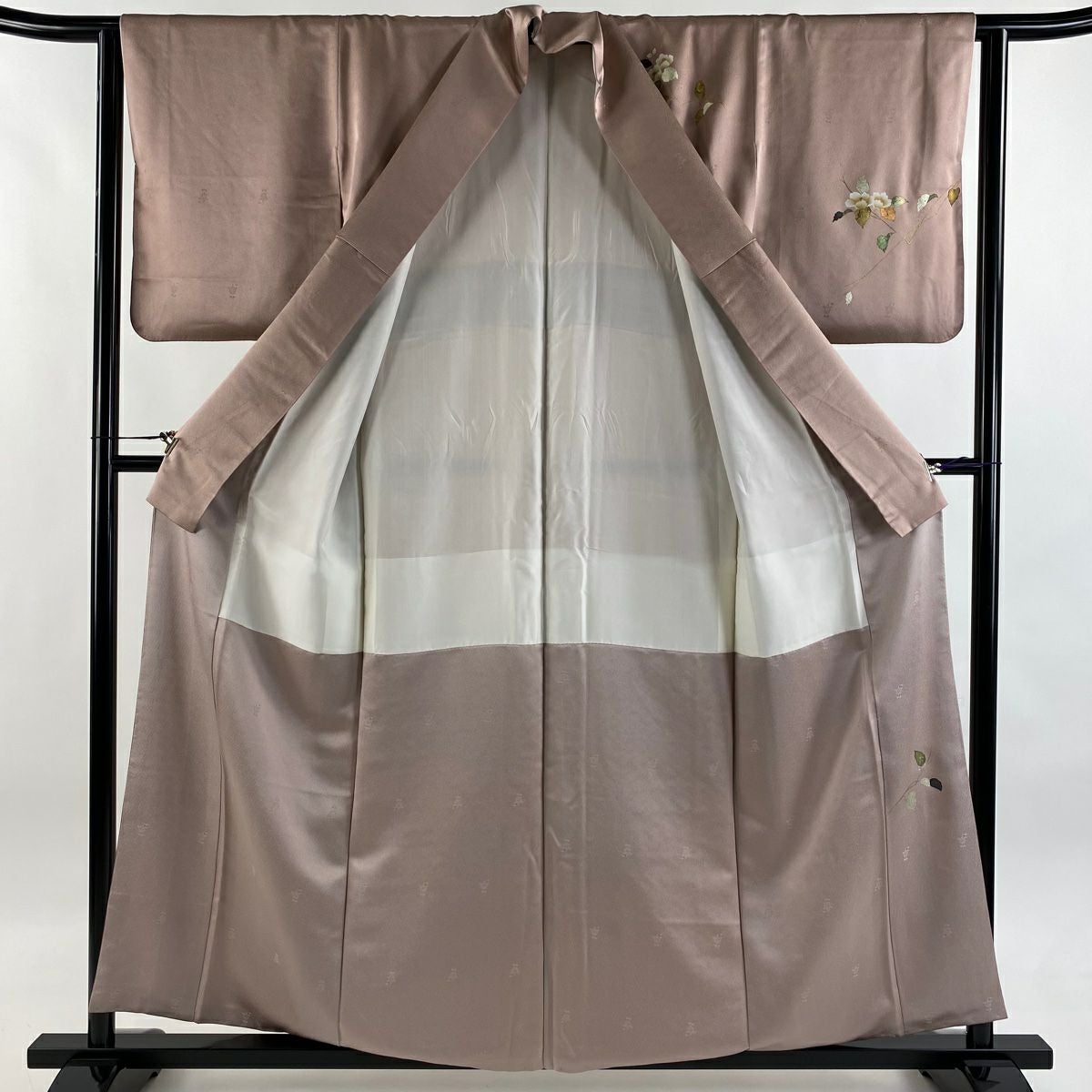 【在庫一掃】 訪問着 身丈157cm 裄丈64cm M 袷 枝花 道長取り 刺繍 絞り 薄茶色 正絹 秀品