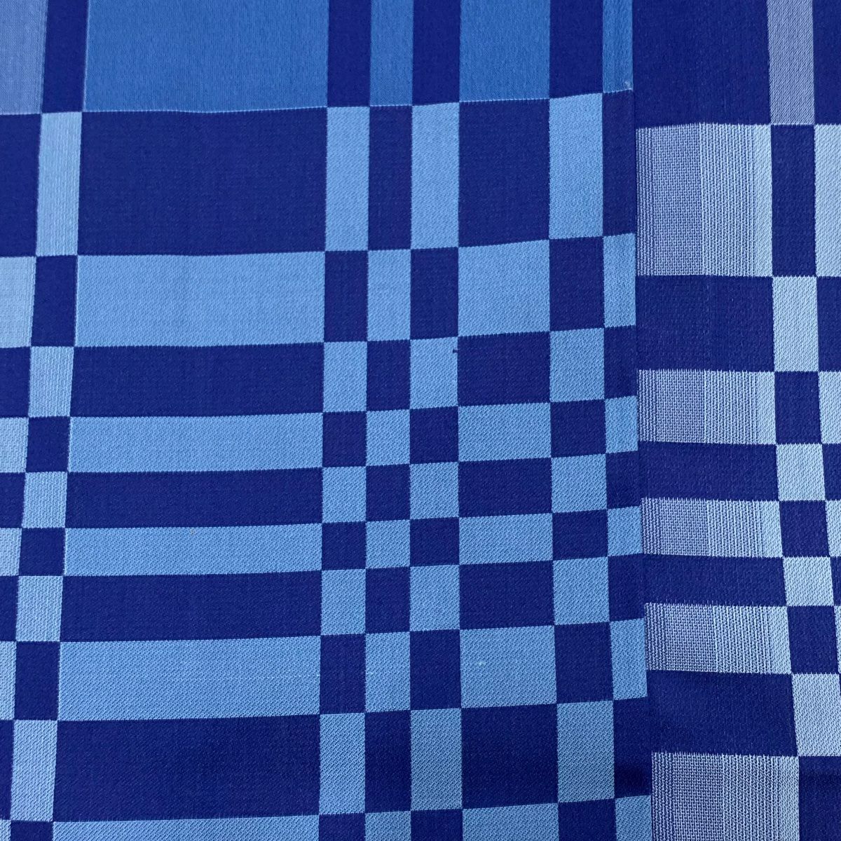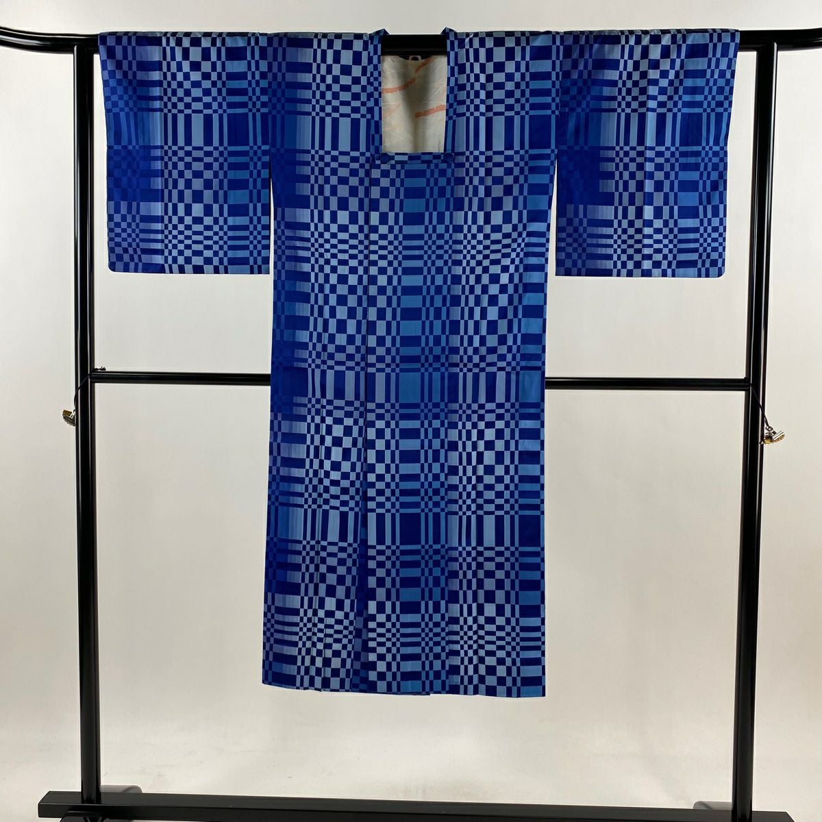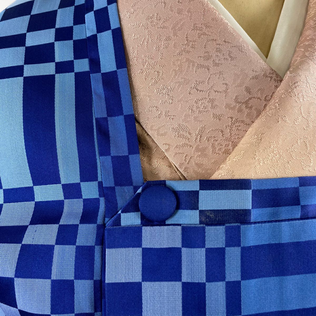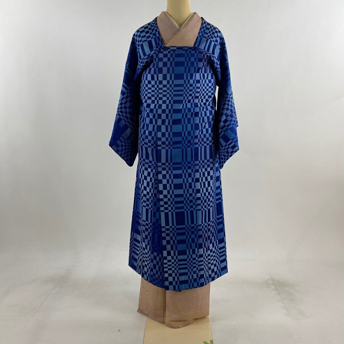 【美品】 小紋 身丈155cm 裄丈65cm M 袷 千地泰弘 落款あり 変わり市松 青緑 正絹 秀品 一つ紋