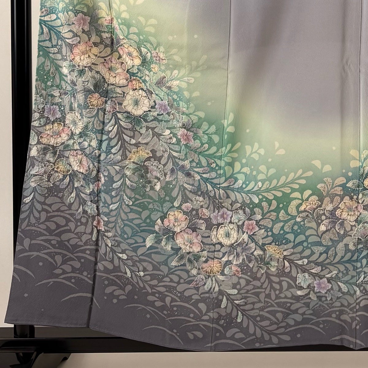 色留袖 身丈151.5cm 裄丈63.5cm S 袷 落款あり 霞 染め分け ぼかし 青灰色 正絹 秀品