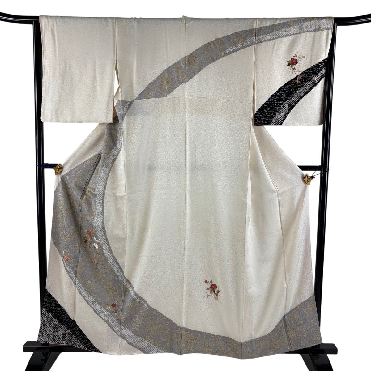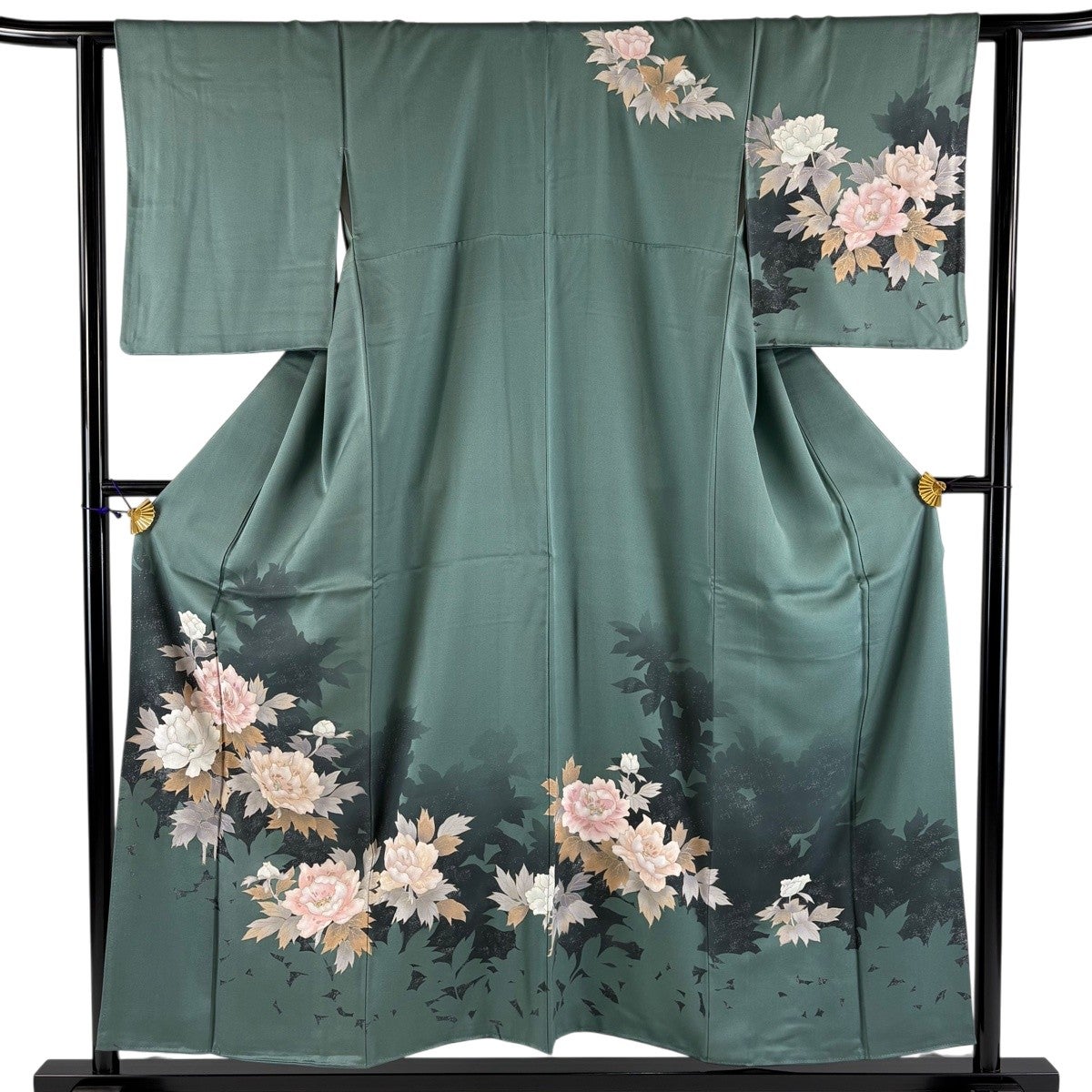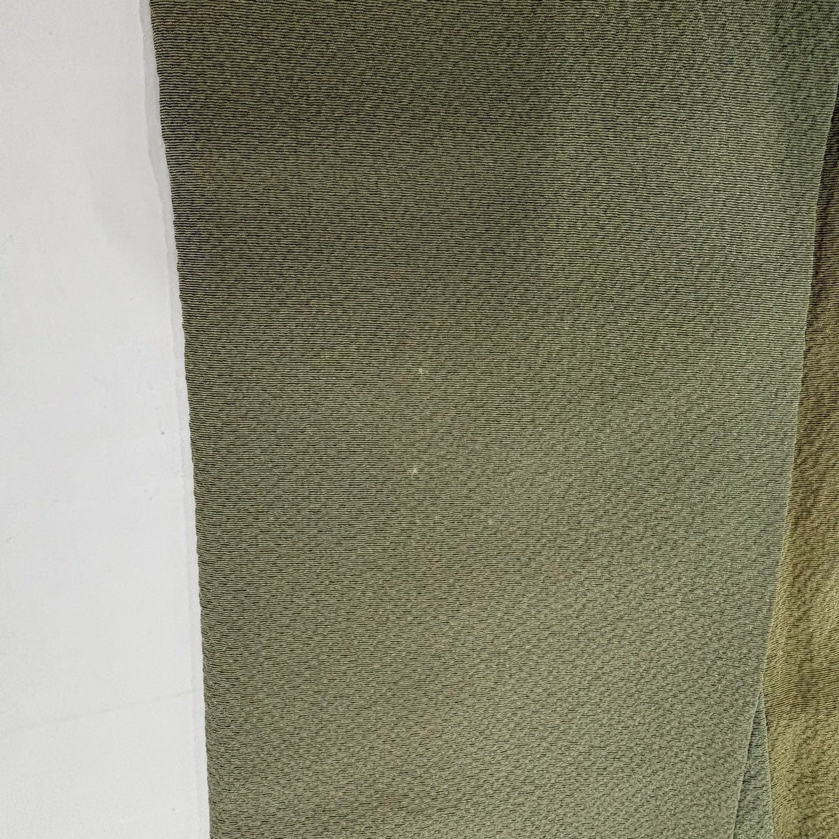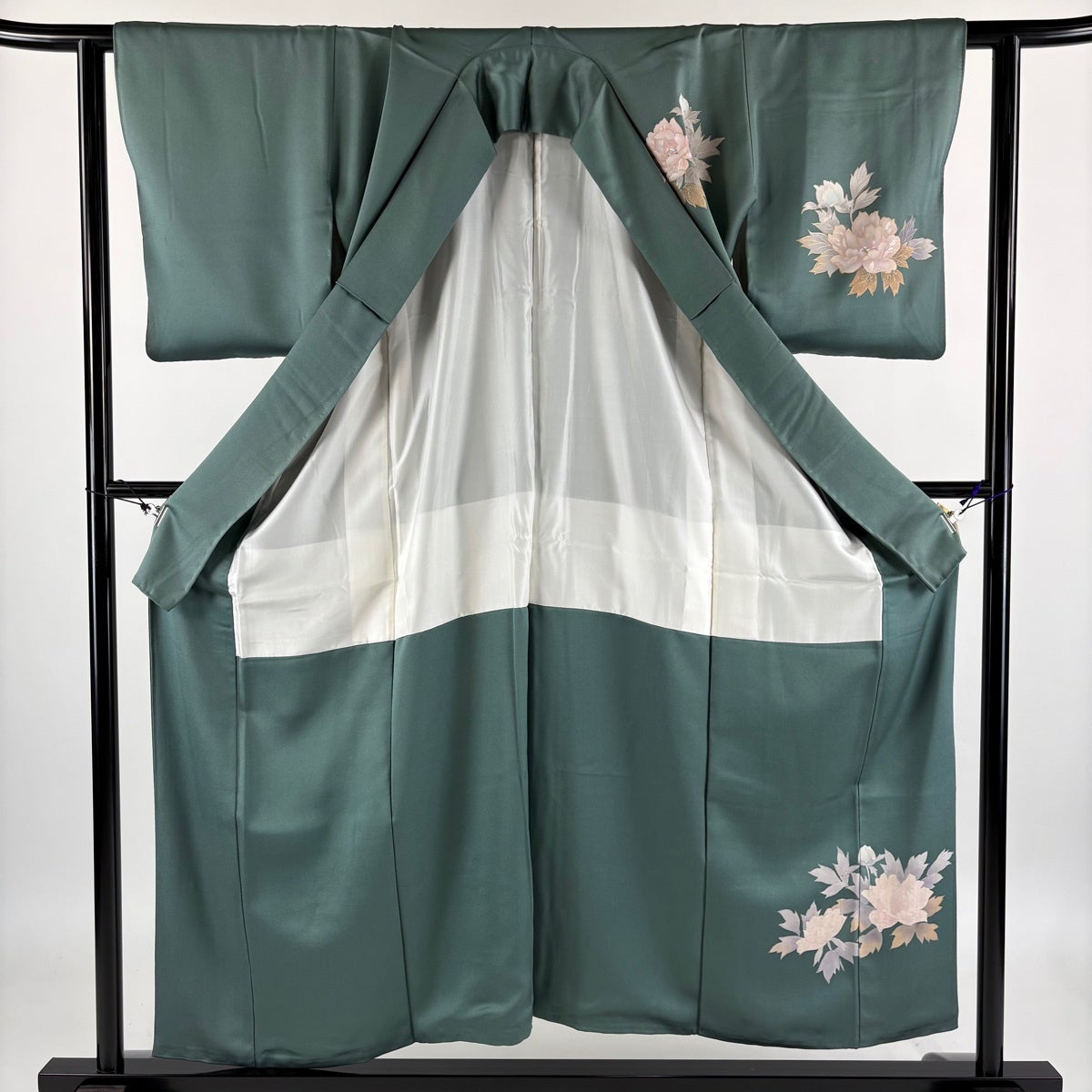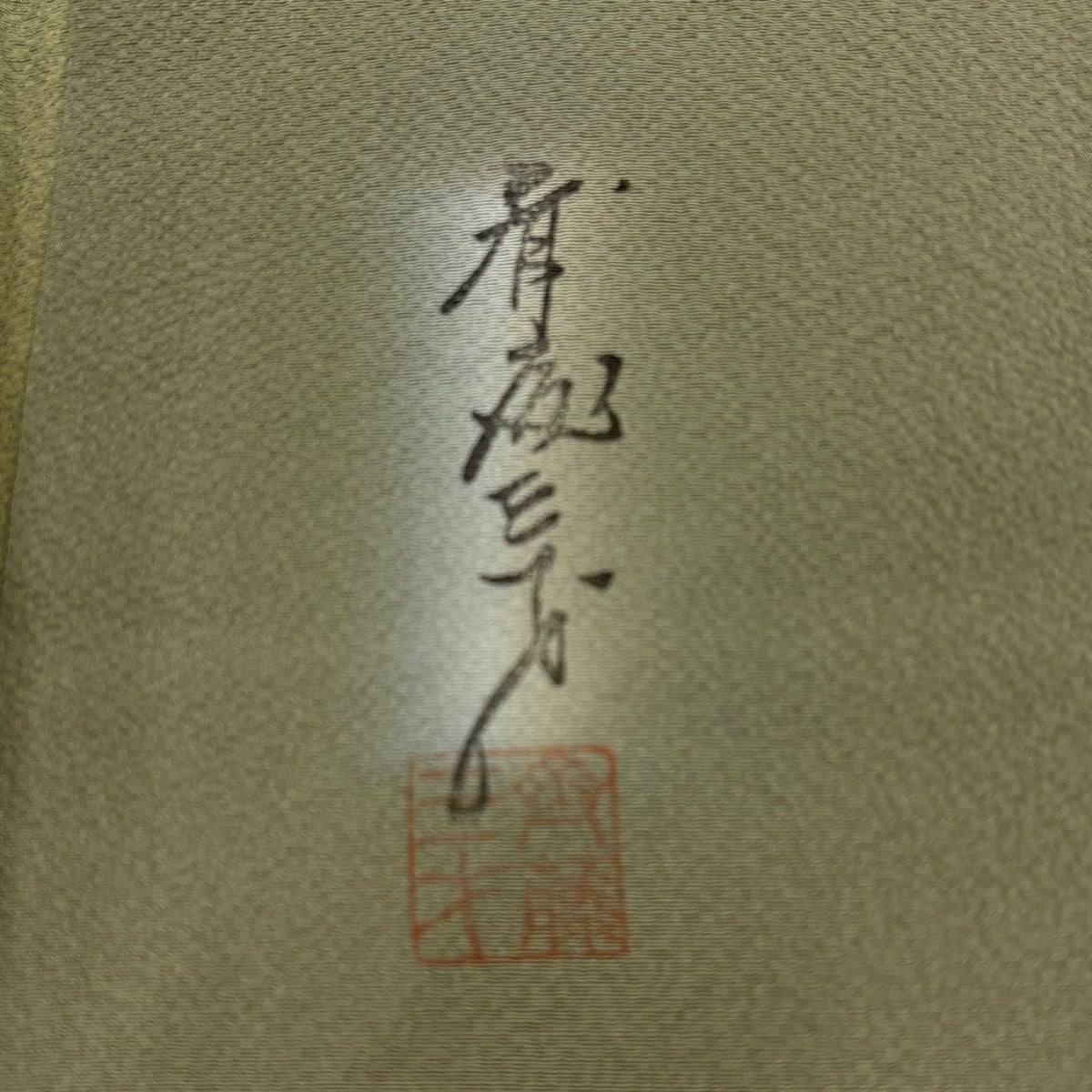 訪問着 身丈165cm 裄丈64.5cm M 袷 落款あり 草花 片輪車 金糸 刺繍 灰緑 正絹 秀品