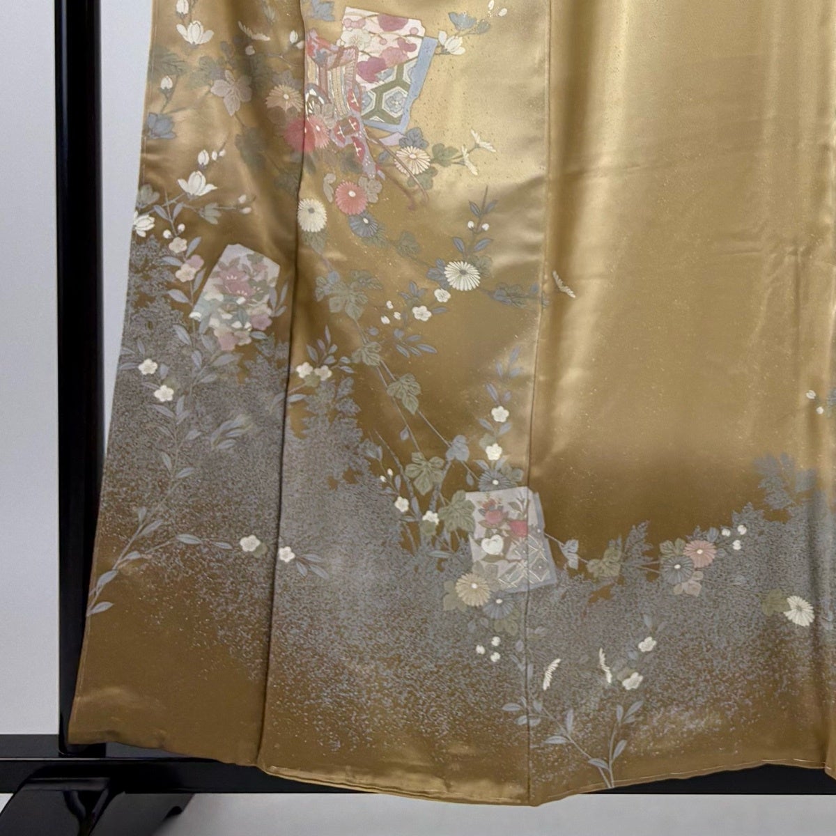振袖 身丈162cm 裄丈66cm M 袷 袋帯フルセット 蝶 花唐草 金彩 箔 黄土色 正絹 秀品