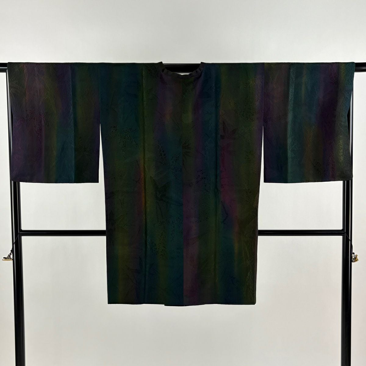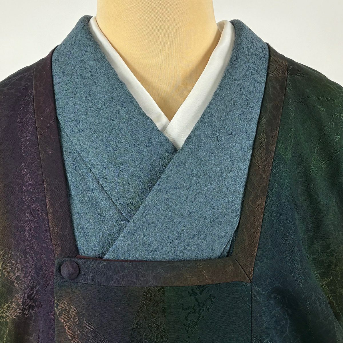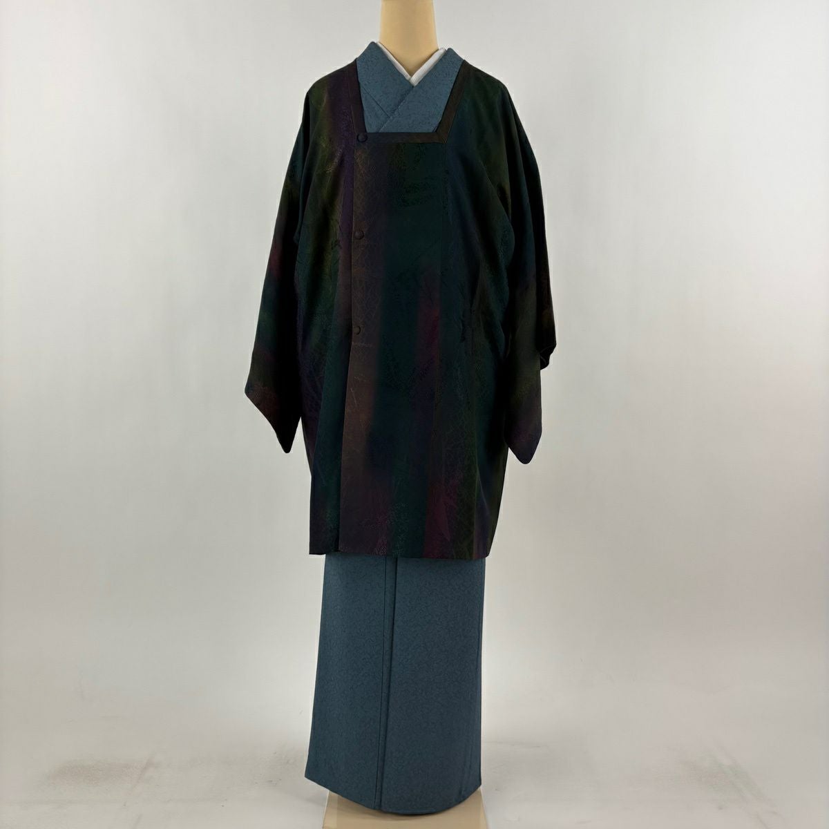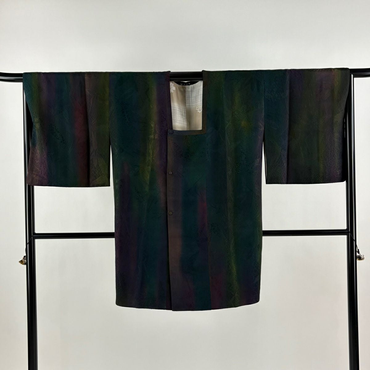 【美品】 道行 身丈93.5cm 裄丈67.5cm L 和装コート 角衿 鈴乃屋 地紋 ぼかし 深緑 正絹 秀品