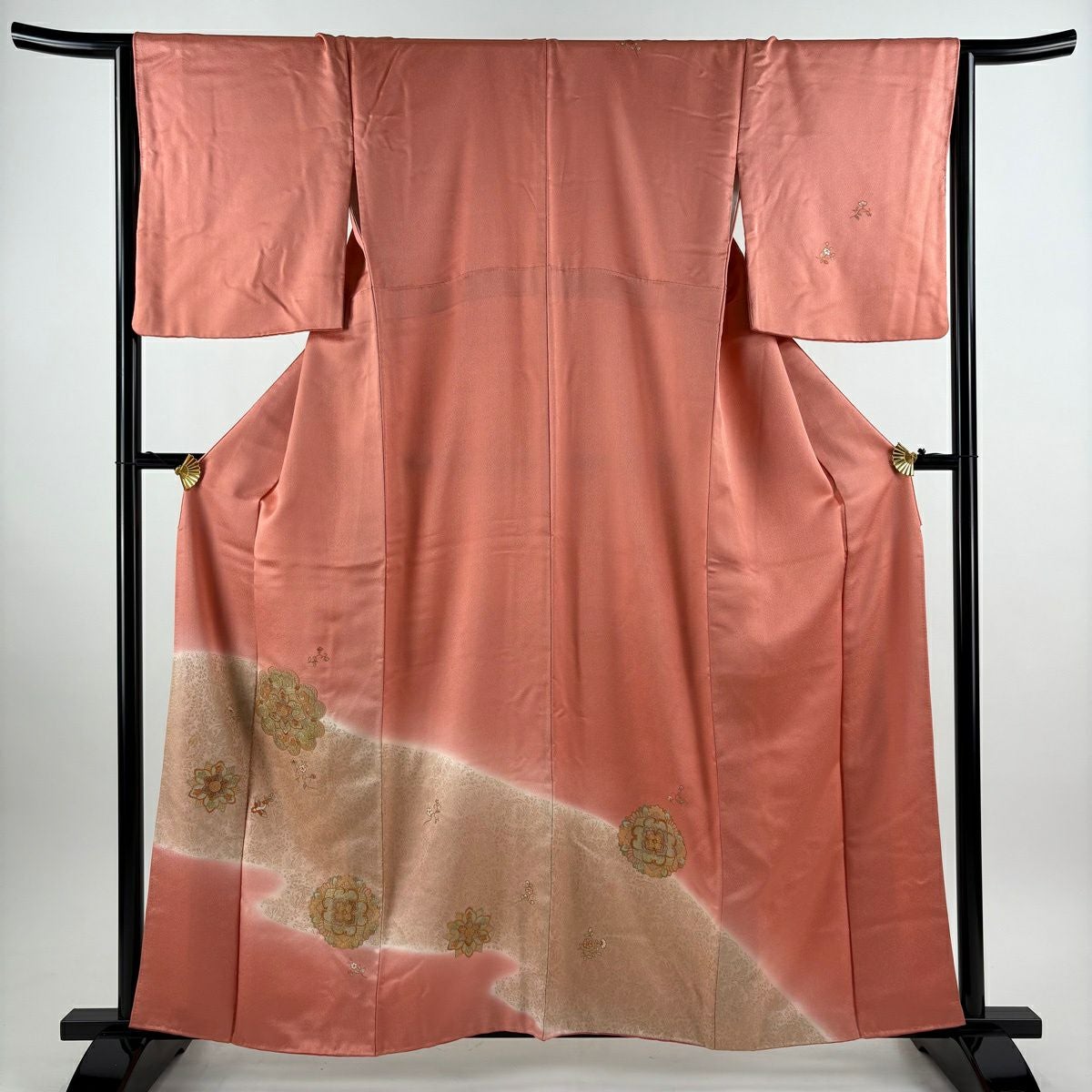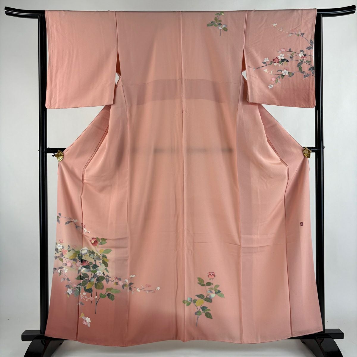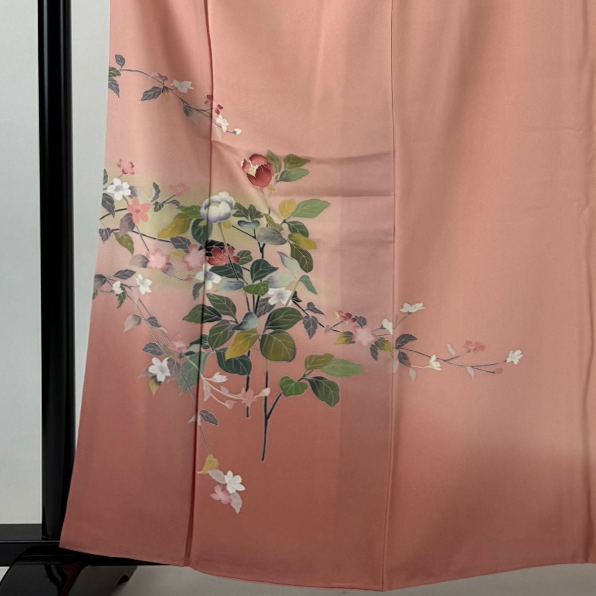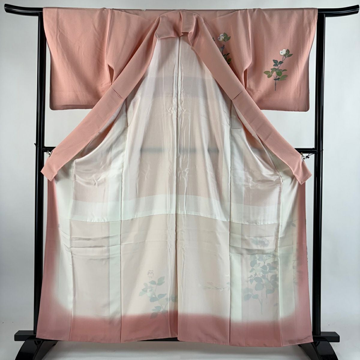 訪問着 身丈156.5cm 裄丈65.5cm M 袷 落款あり 枝花 草花 ぼかし サーモンピンク 正絹 秀品