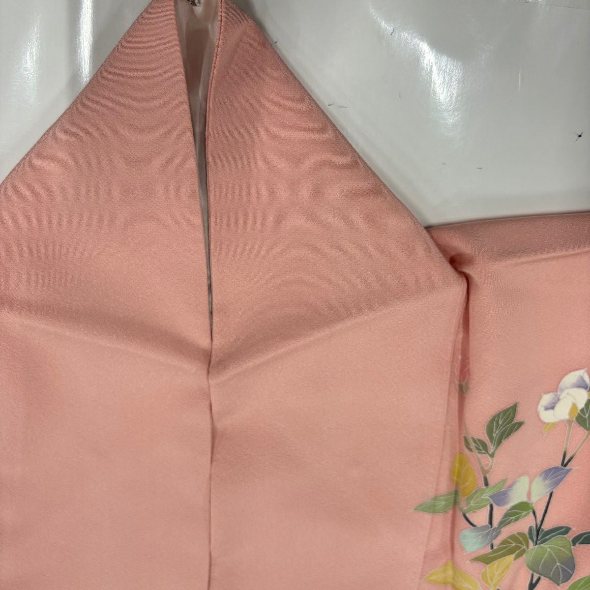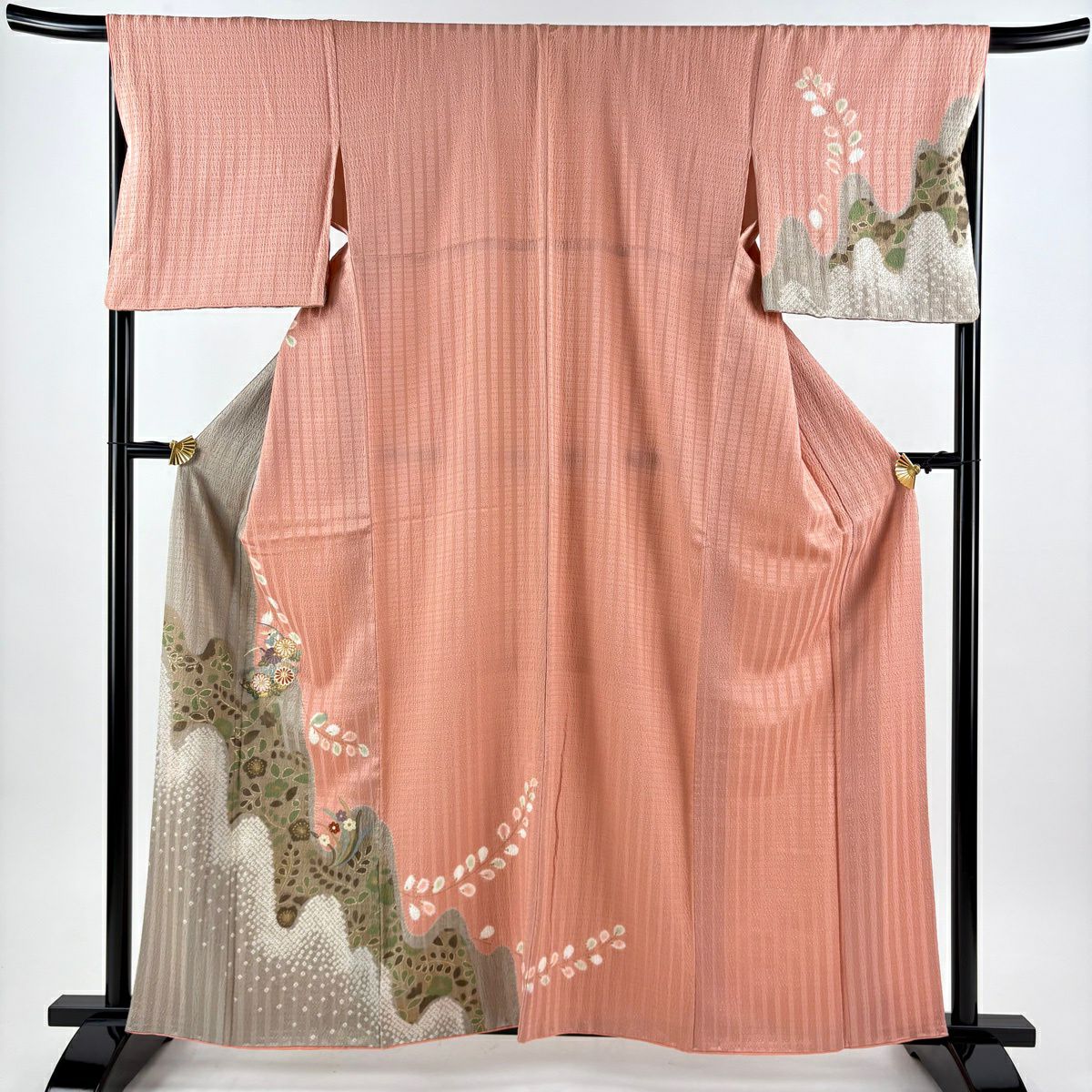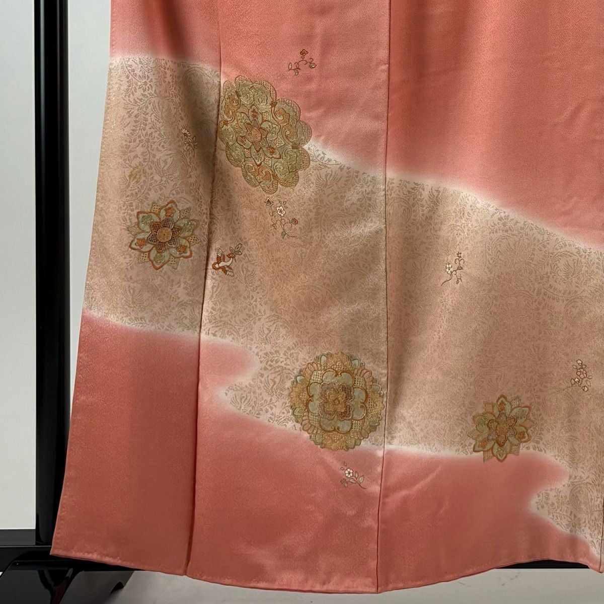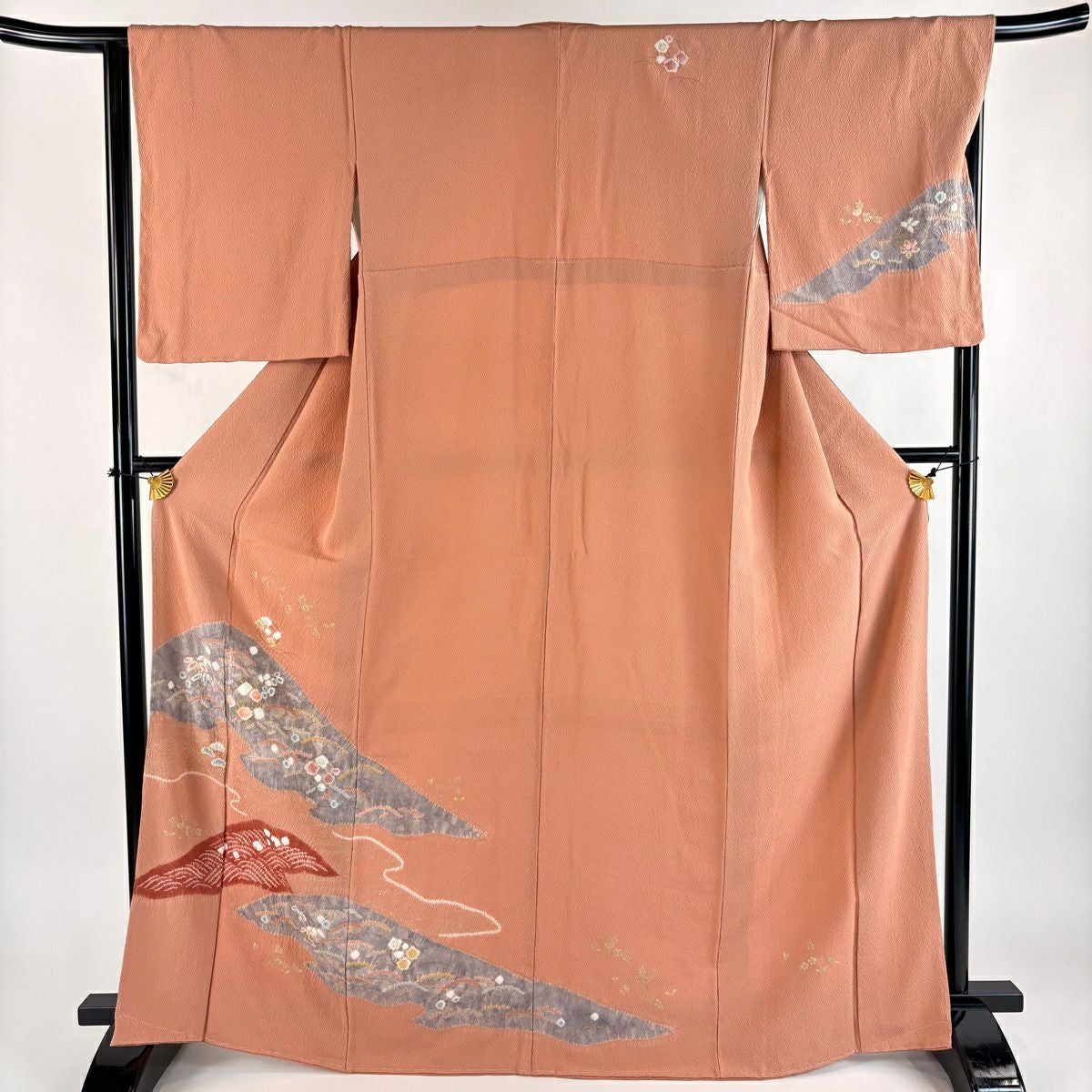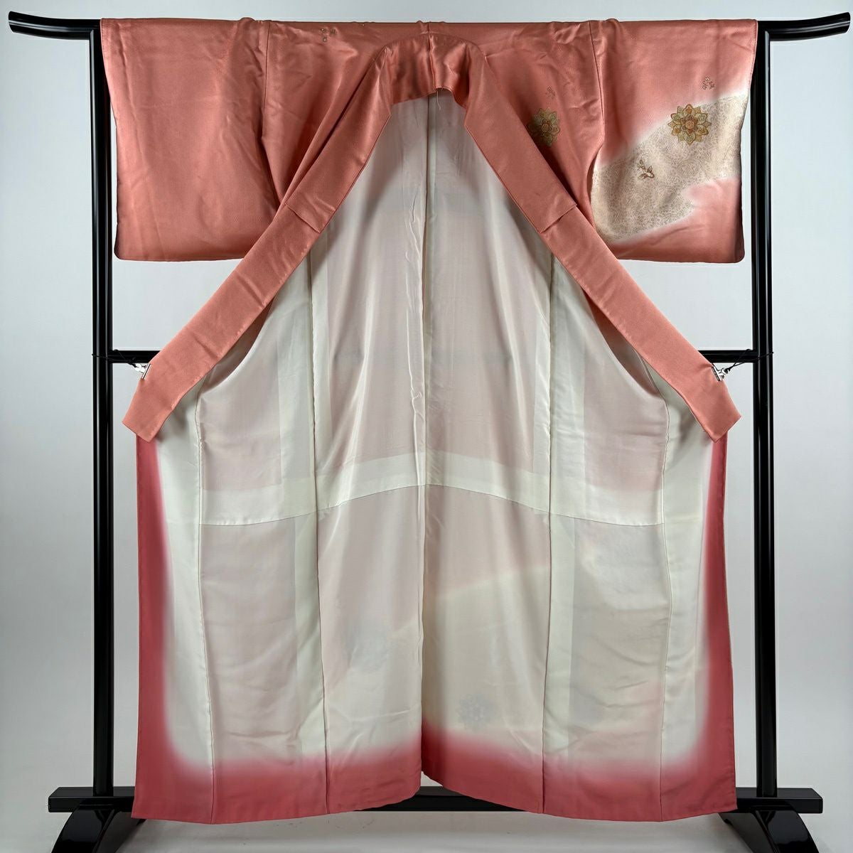 訪問着 身丈156.5cm 裄丈65.5cm M 袷 落款あり 枝花 草花 ぼかし サーモンピンク 正絹 秀品