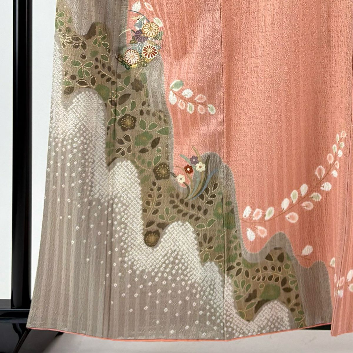 【美品】 訪問着 身丈161cm 裄丈67cm M 袷 菊 草花 金銀彩 絞り サーモンピンク 正絹 秀品