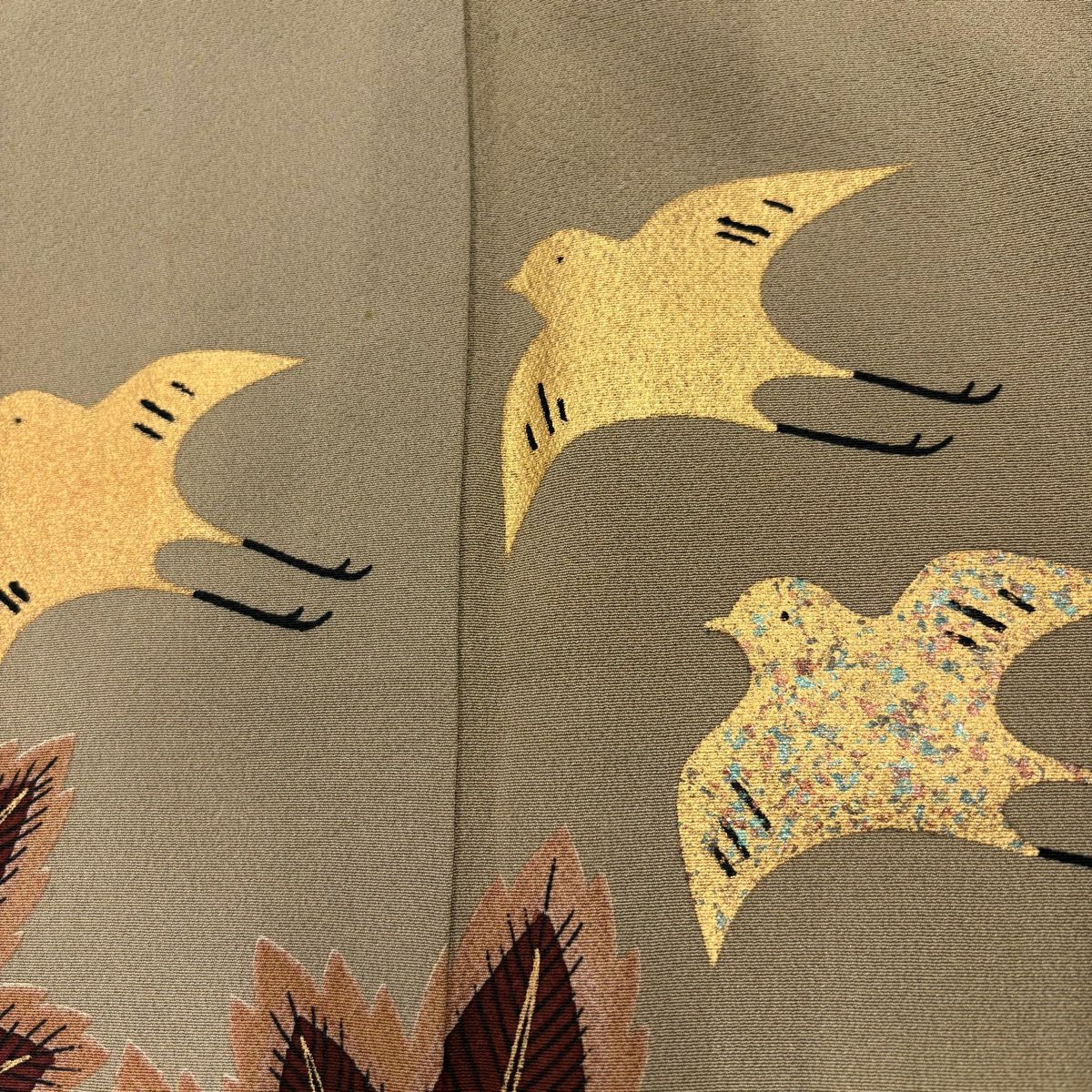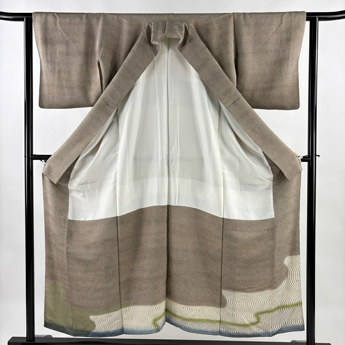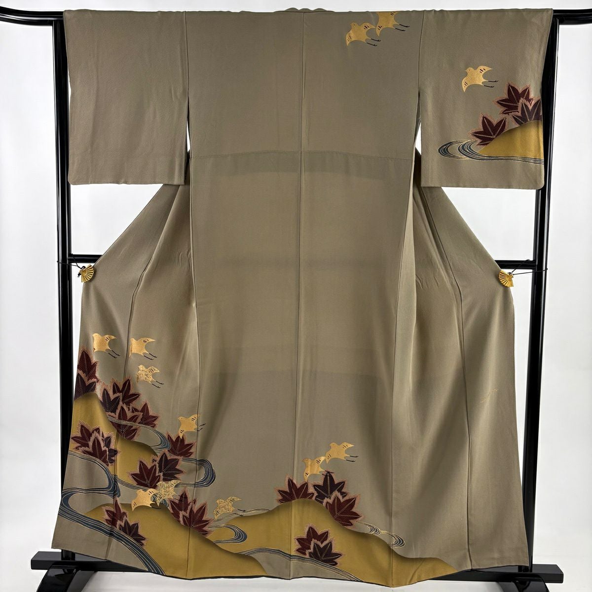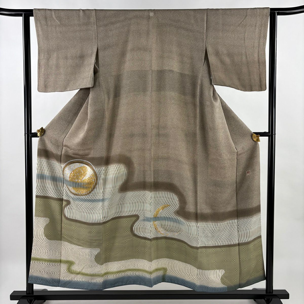 訪問着 身丈158.5cm 裄丈65cm M 袷 コシノヒロコ 落款あり 千鳥 若松 金銀彩 灰茶 正絹 秀品