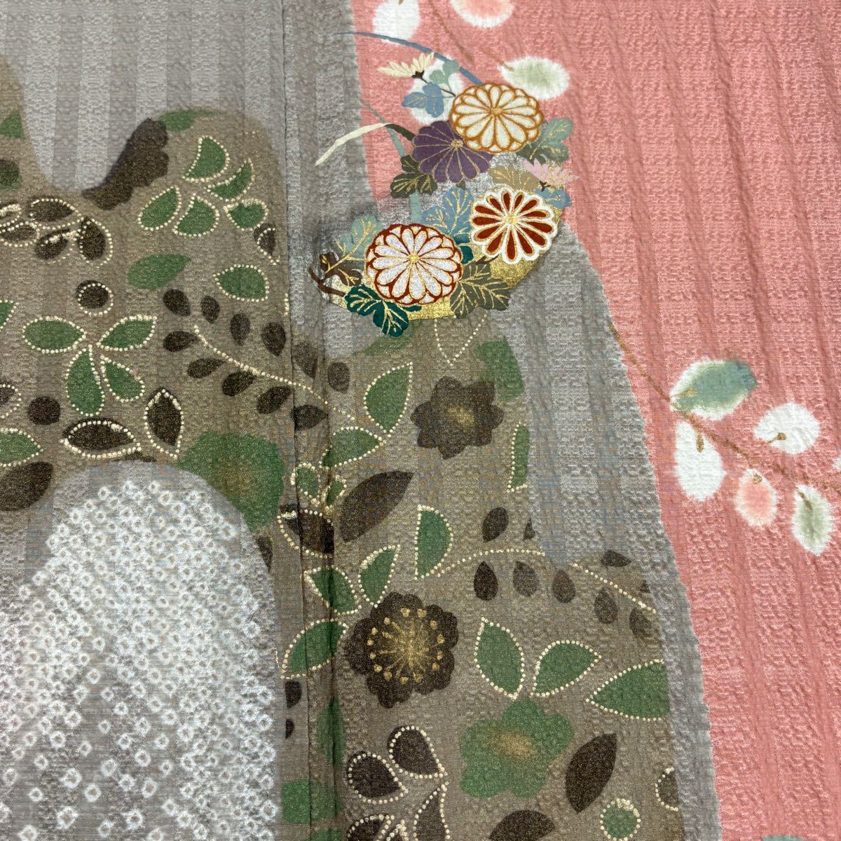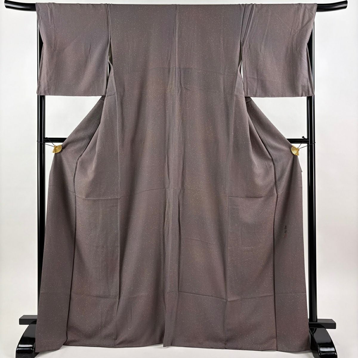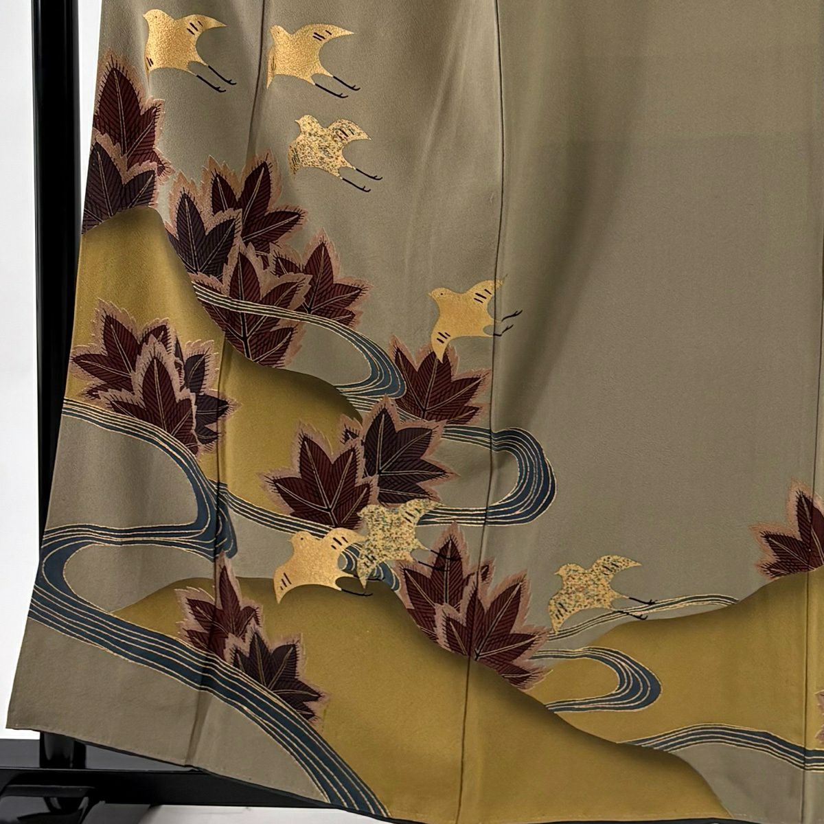 訪問着 身丈158.5cm 裄丈65cm M 袷 コシノヒロコ 落款あり 千鳥 若松 金銀彩 灰茶 正絹 秀品