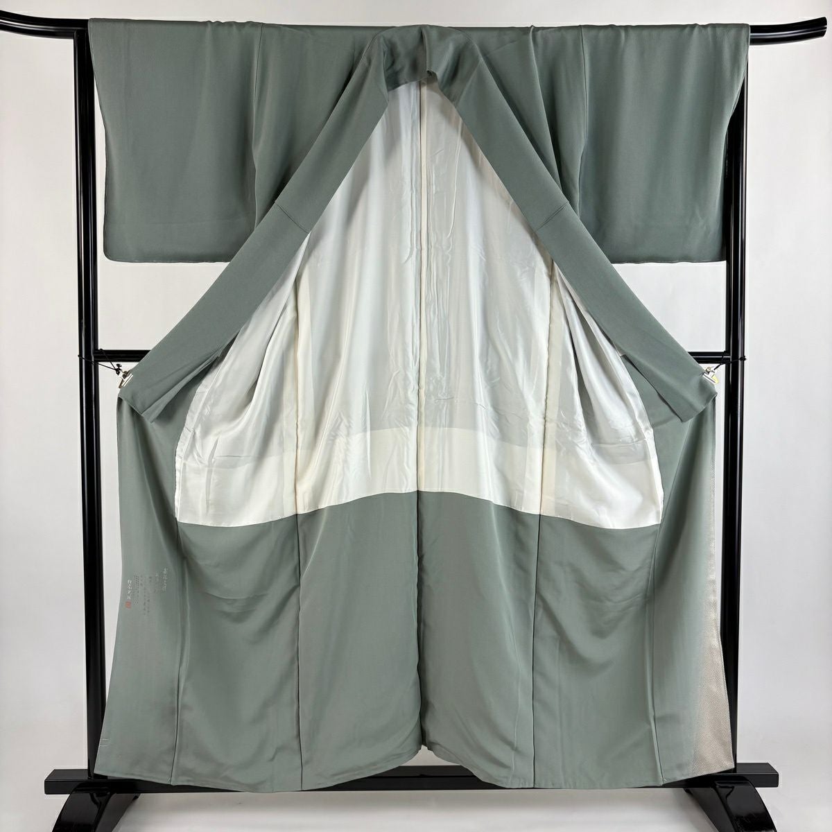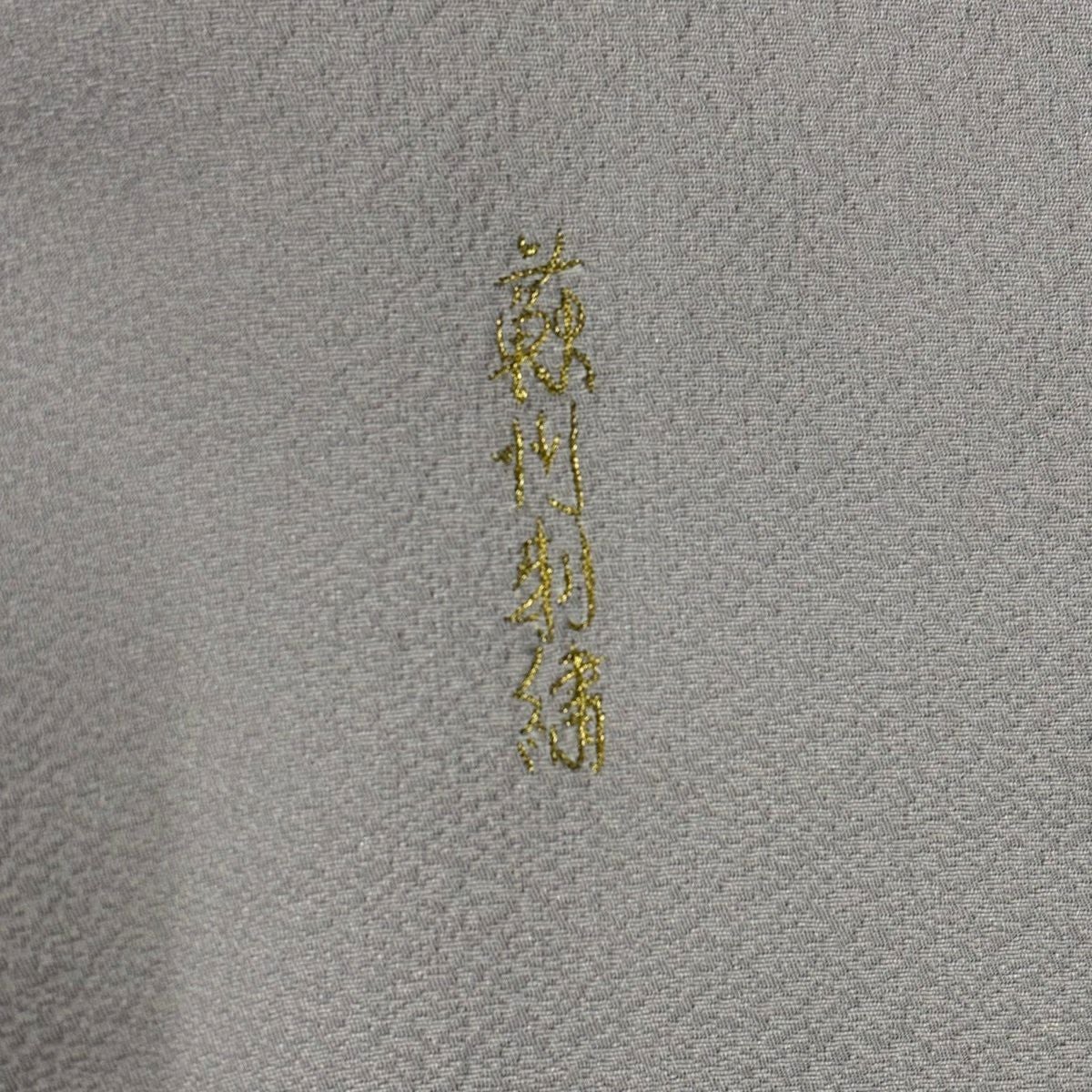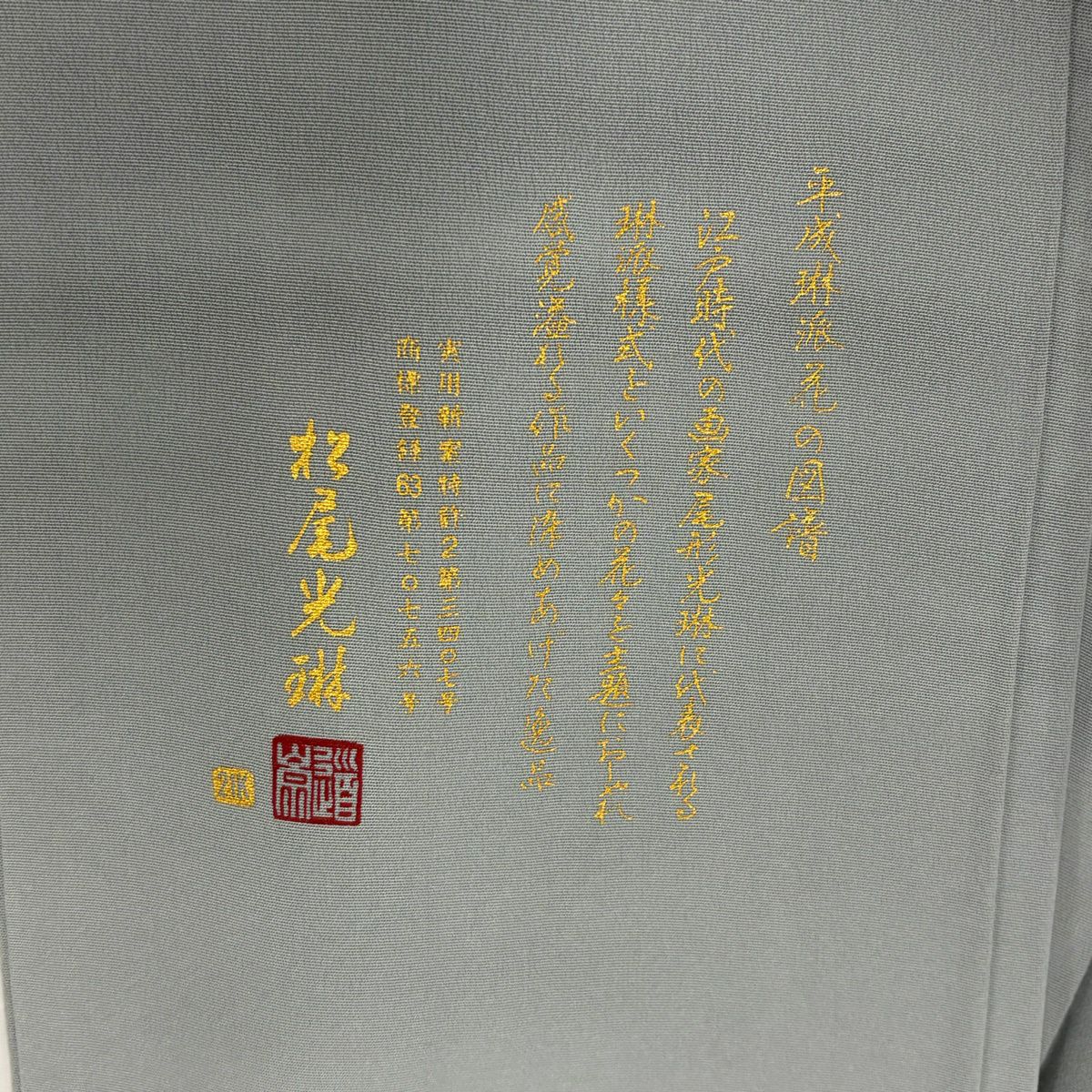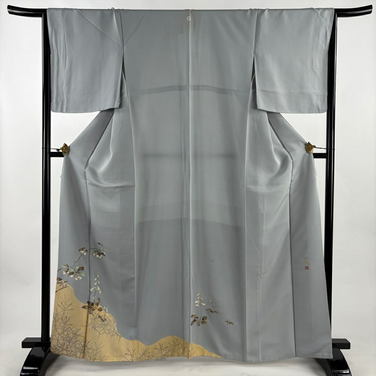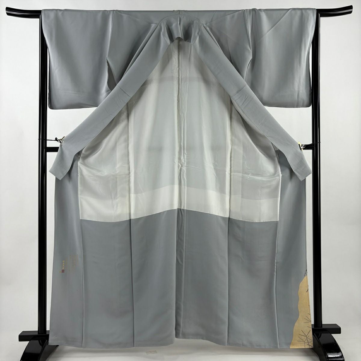 色留袖 身丈163.5cm 裄丈66cm M 袷 松尾光琳 落款あり 枝花 金彩 青灰色 正絹 秀品 一つ紋