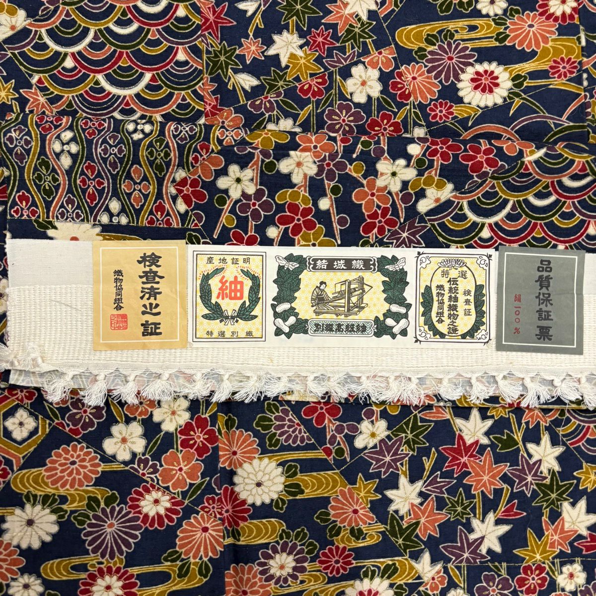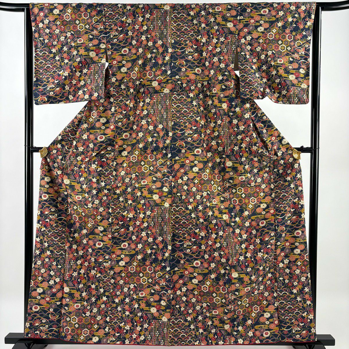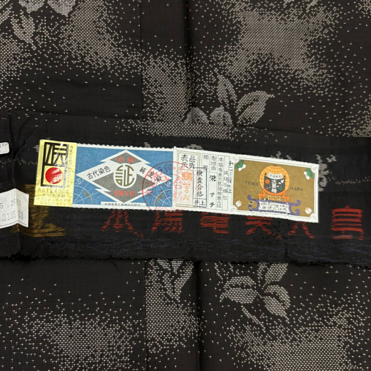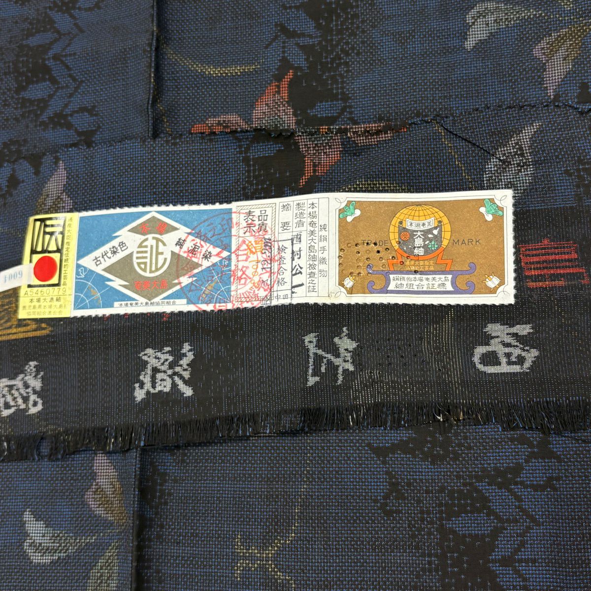 【美品】 大島紬 身丈163cm 裄丈65cm M 袷 純泥染 証紙あり 草花 シルエット 紺色 正絹 秀品