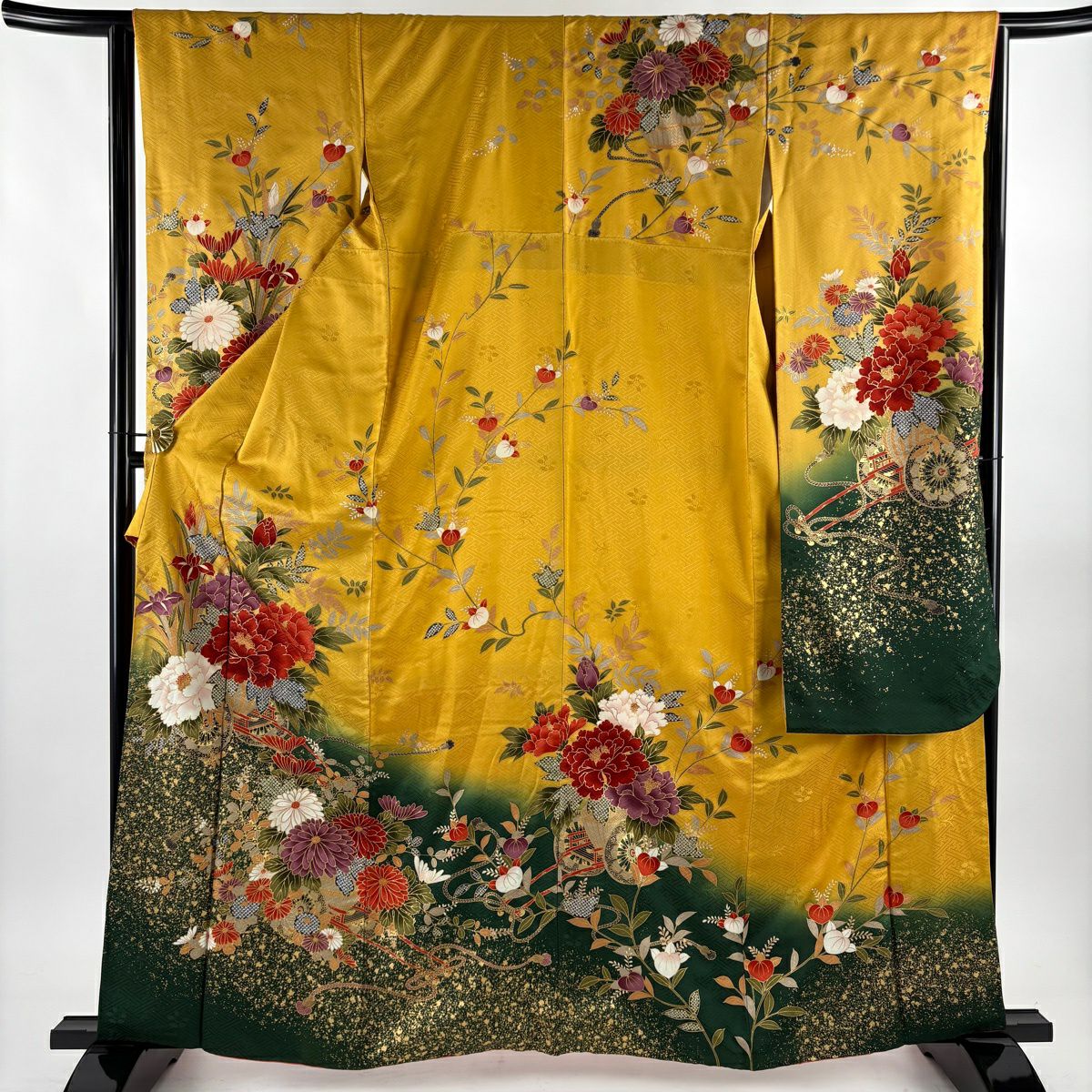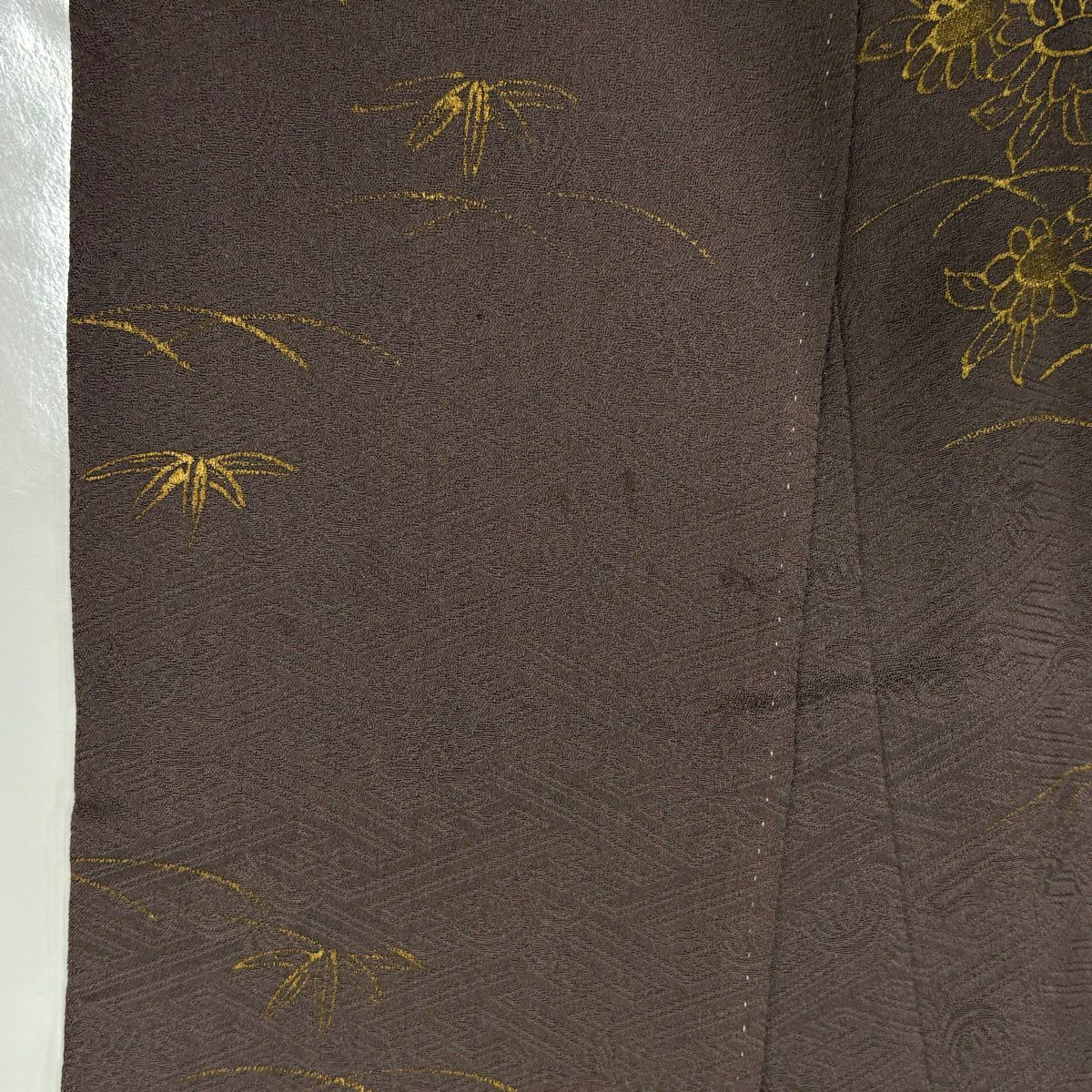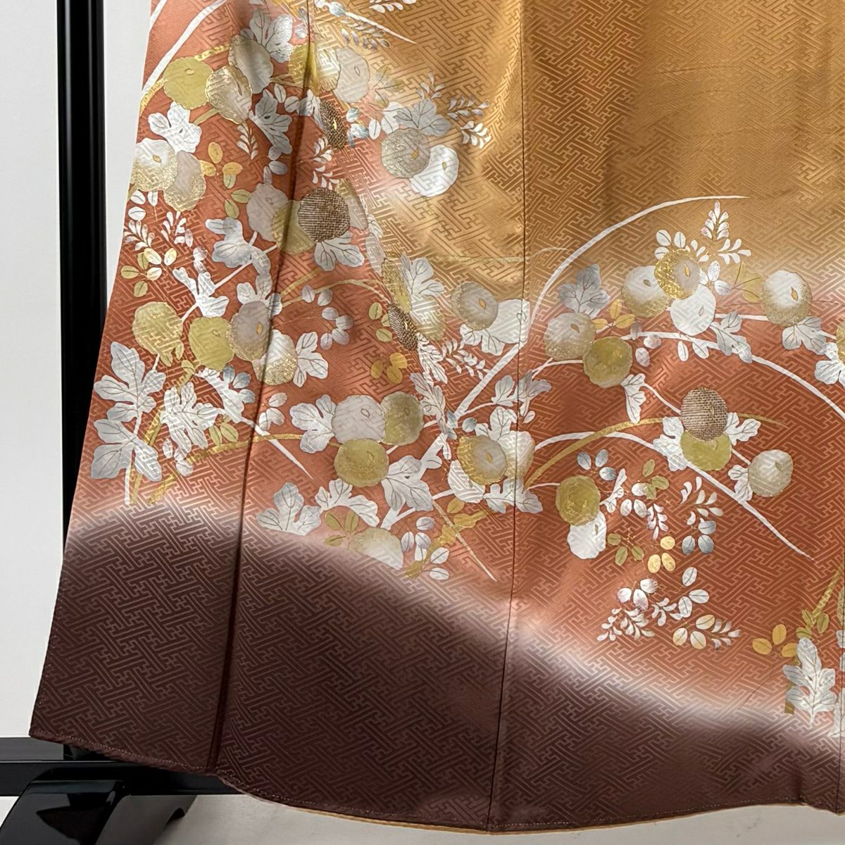 色留袖 身丈161cm 裄丈67cm M 袷 落款あり 万寿菊 萩 金銀彩 金糸 山吹茶色 正絹 秀品 三つ紋