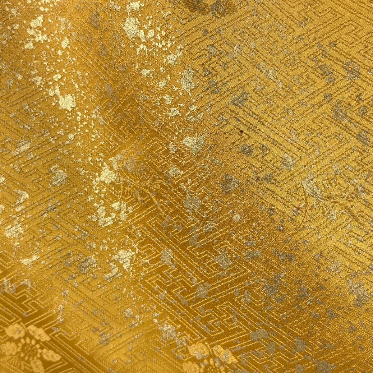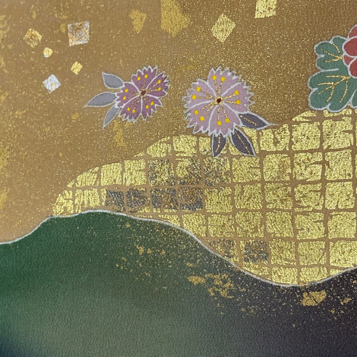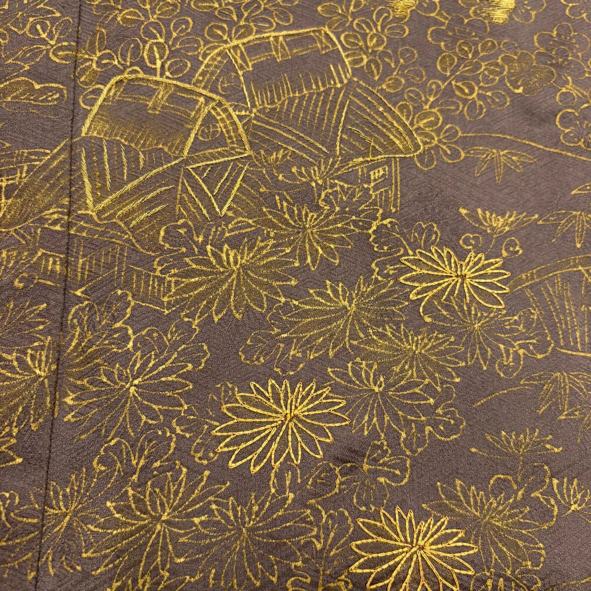色留袖 身丈161cm 裄丈67cm M 袷 落款あり 万寿菊 萩 金銀彩 金糸 山吹茶色 正絹 秀品 三つ紋