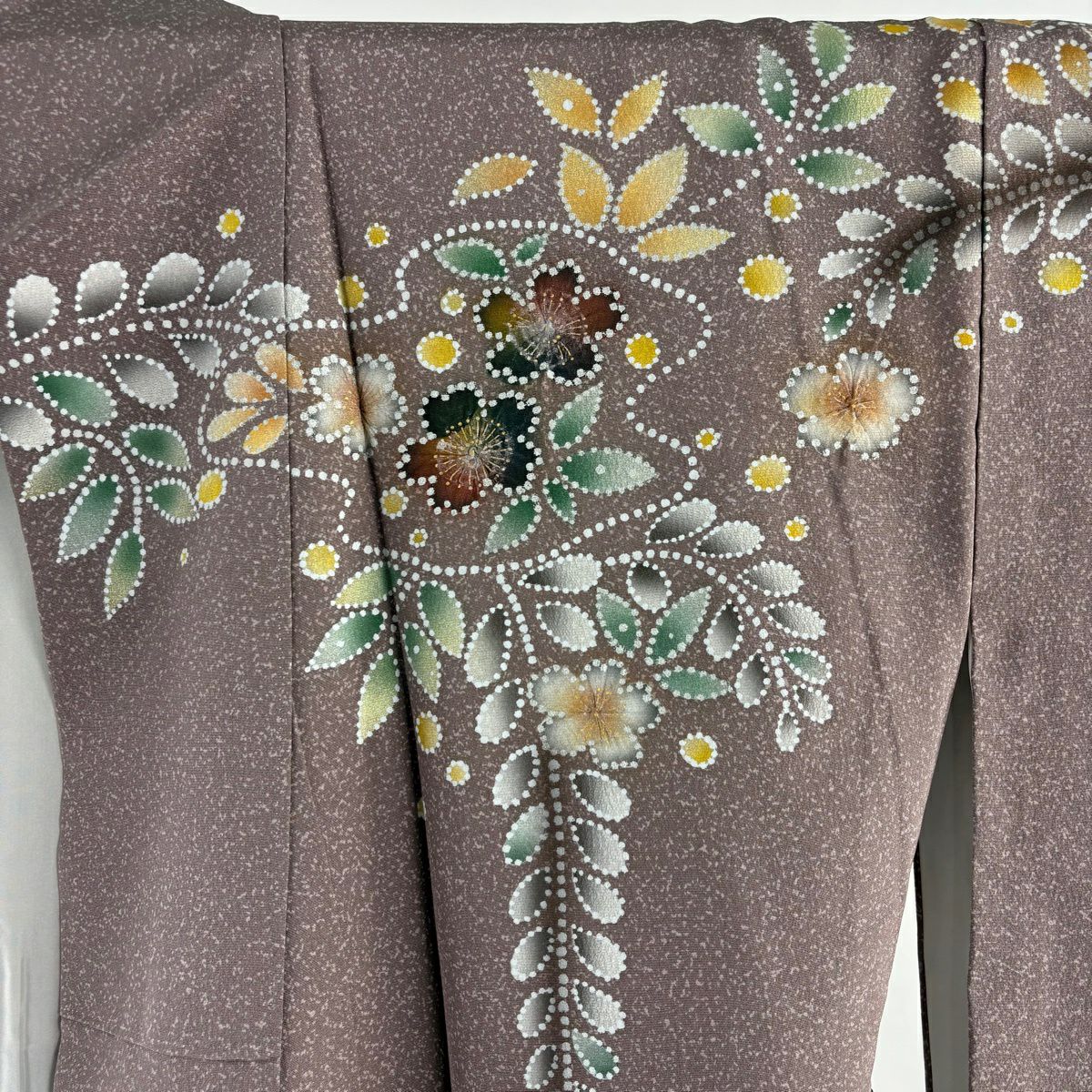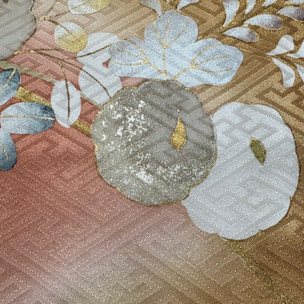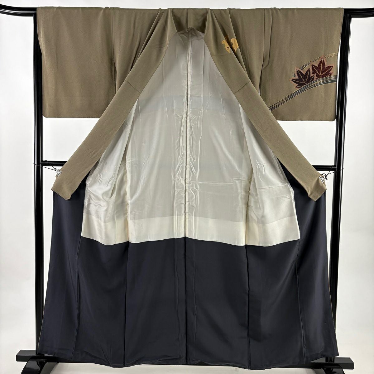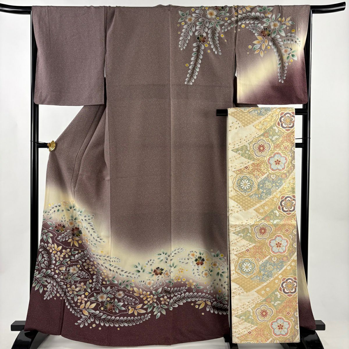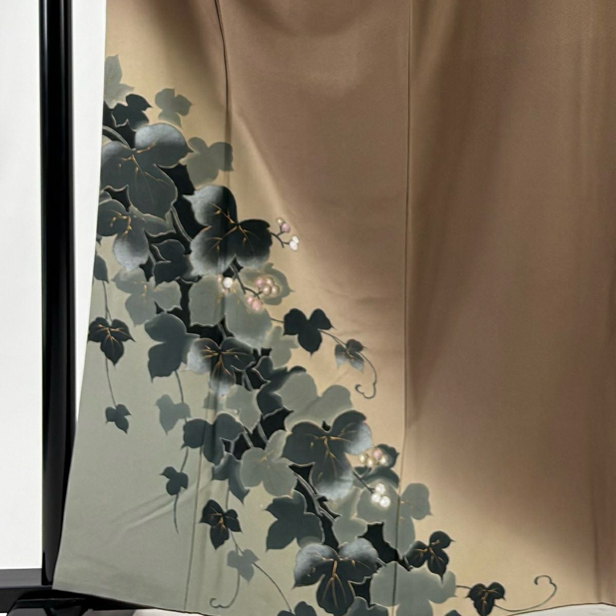 付下げ 身丈161.5cm 裄丈64cm M 袷 落款あり 葉と実 金銀彩 ぼかし 茶色 正絹 秀品 一つ紋