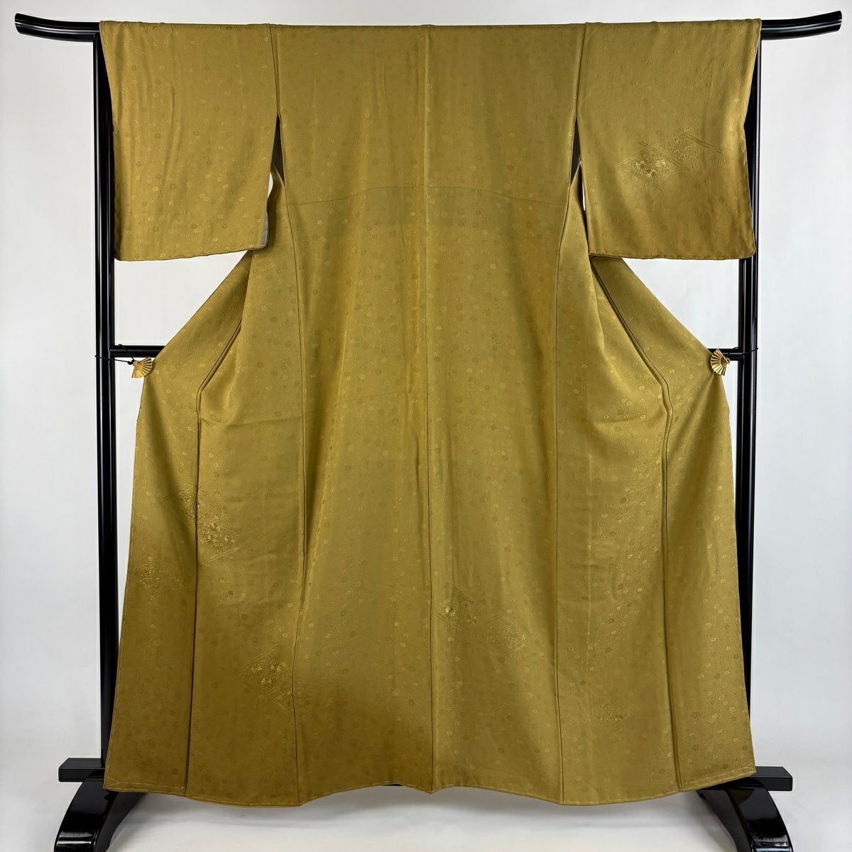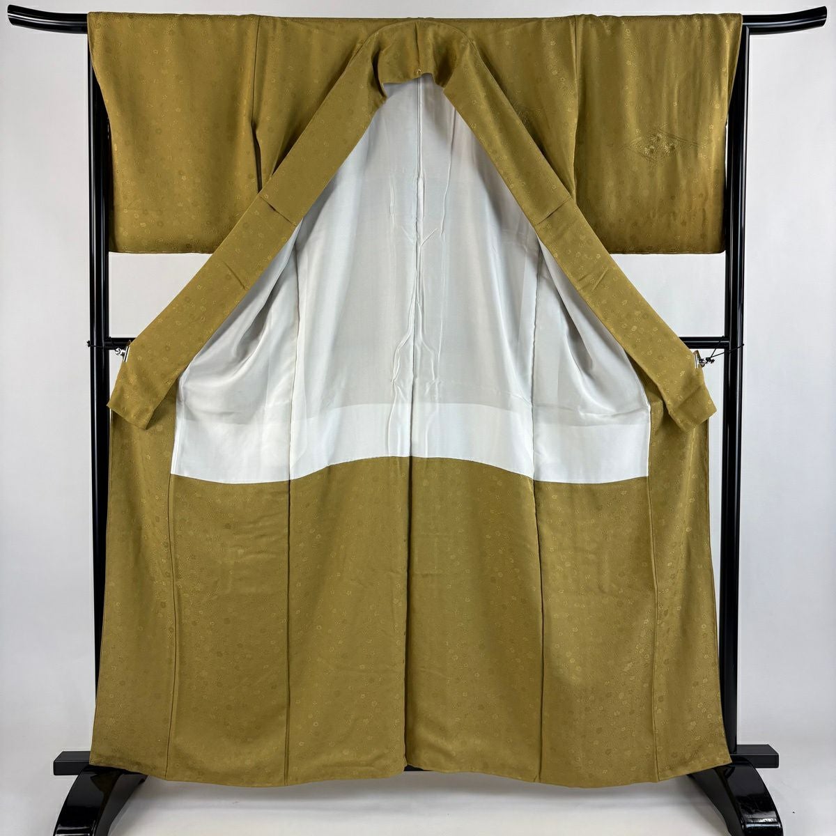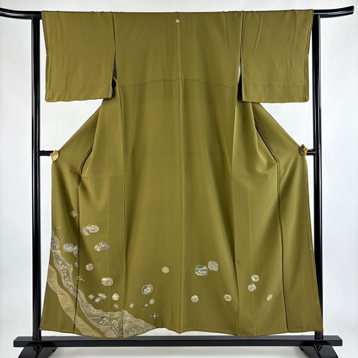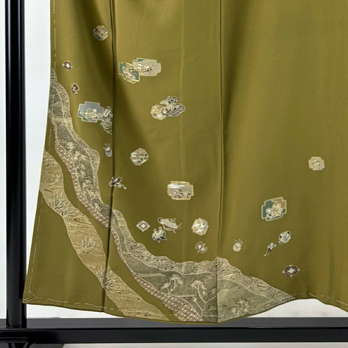 【美品】 色留袖 身丈154.5cm 裄丈63.5cm S 袷 宝尽くし 松 金糸 金彩 鶯色 正絹 秀品 一つ紋
