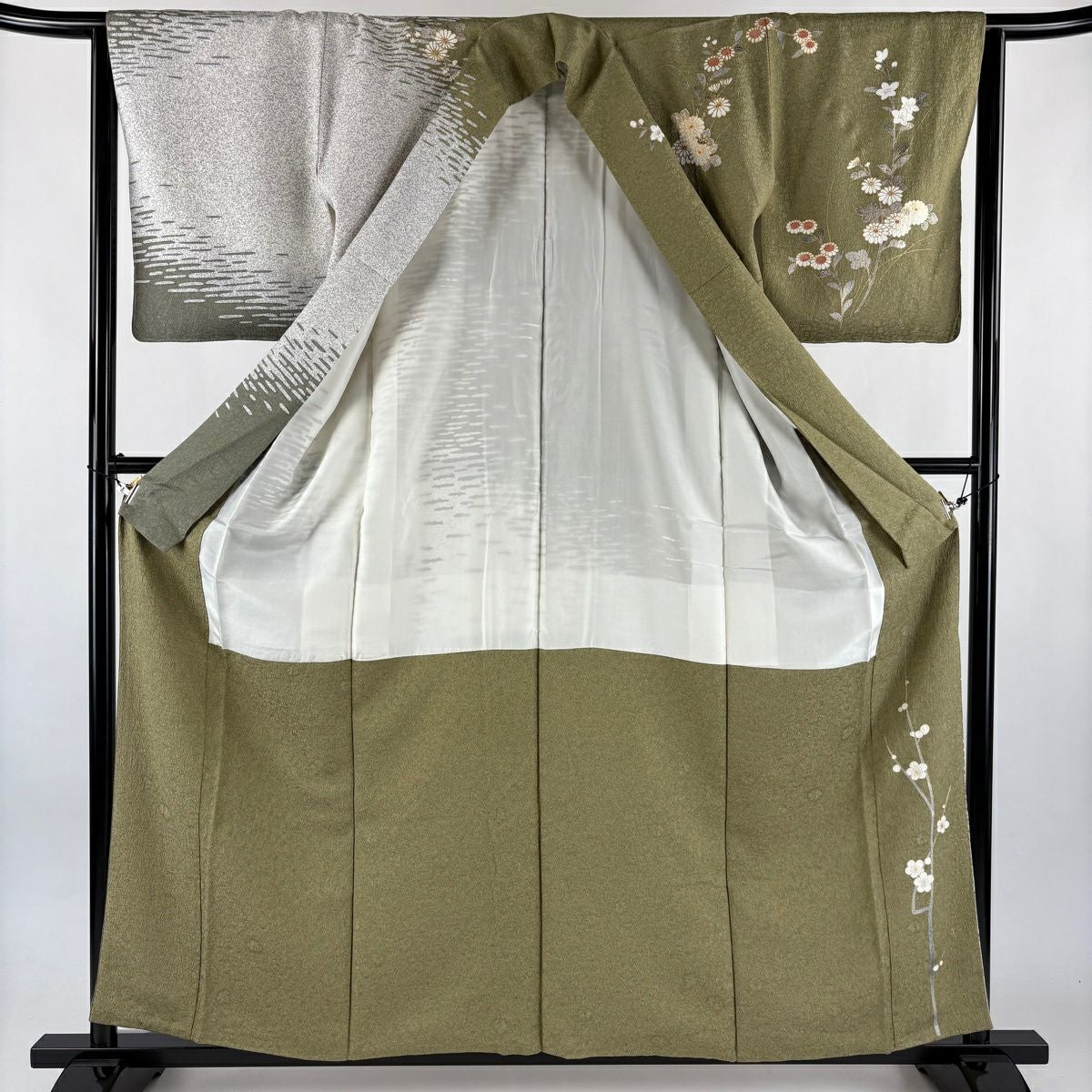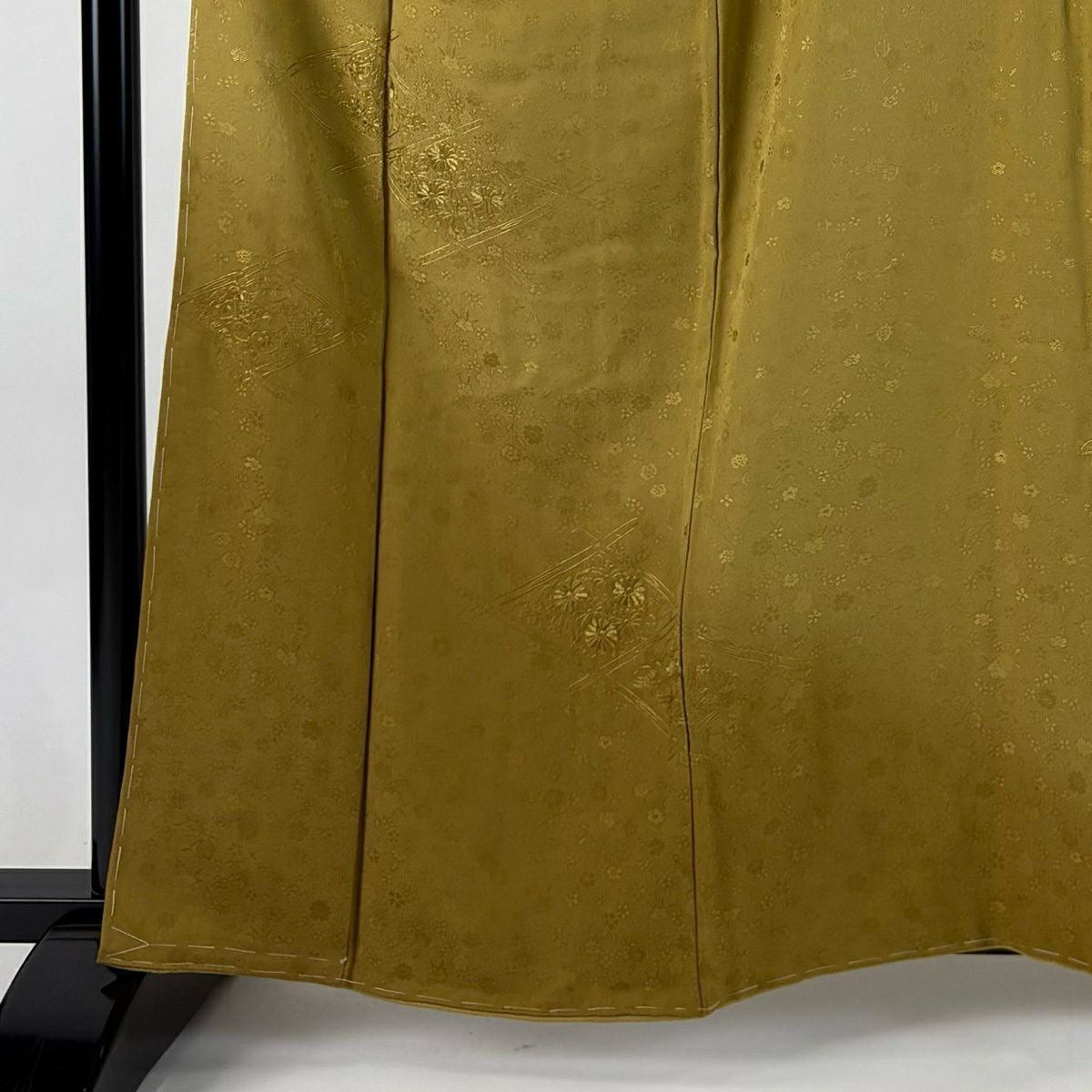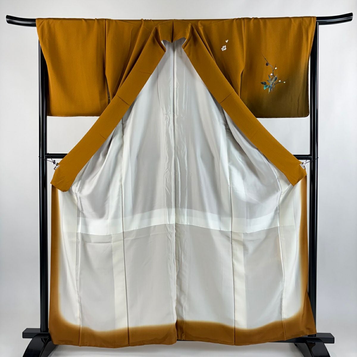 【美品】 付下げ 身丈161.5cm 裄丈66cm M 袷 菱天井 草花 刺繍 ぼかし0 黄土色 正絹 秀品