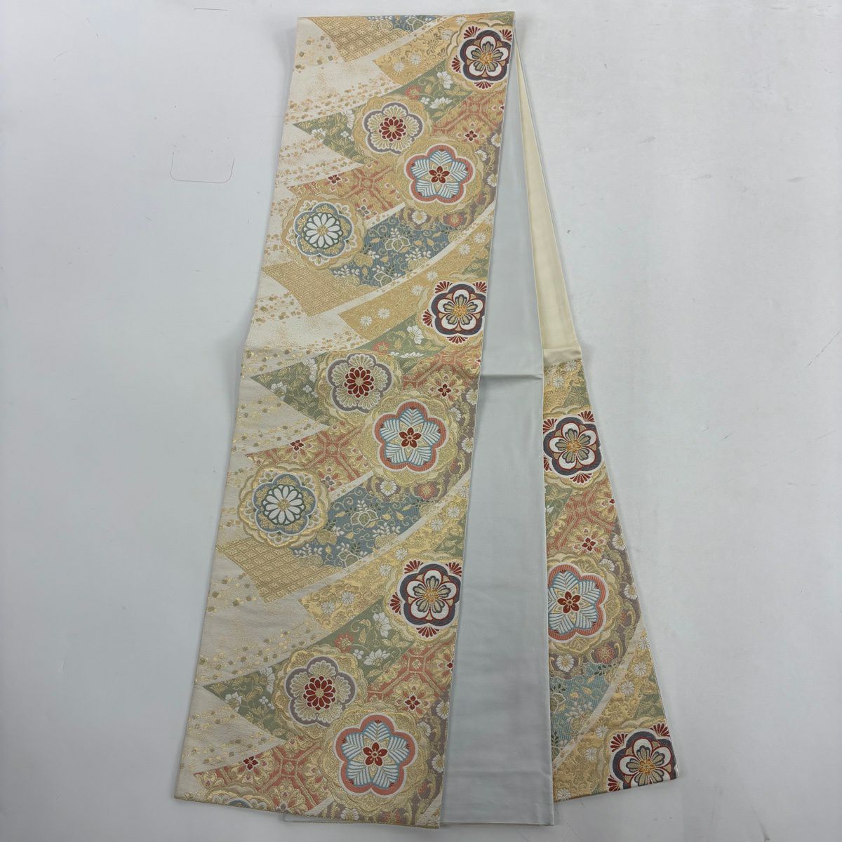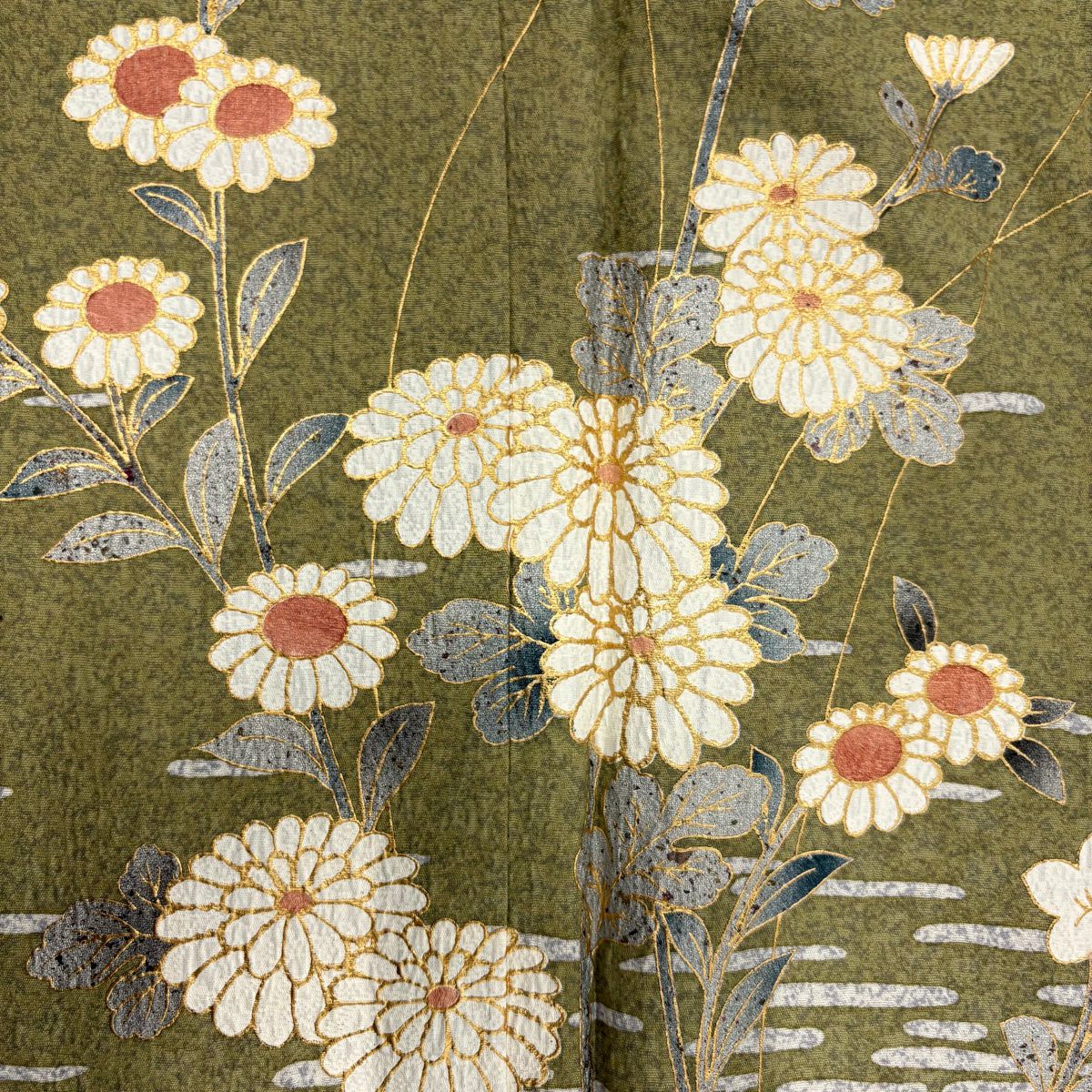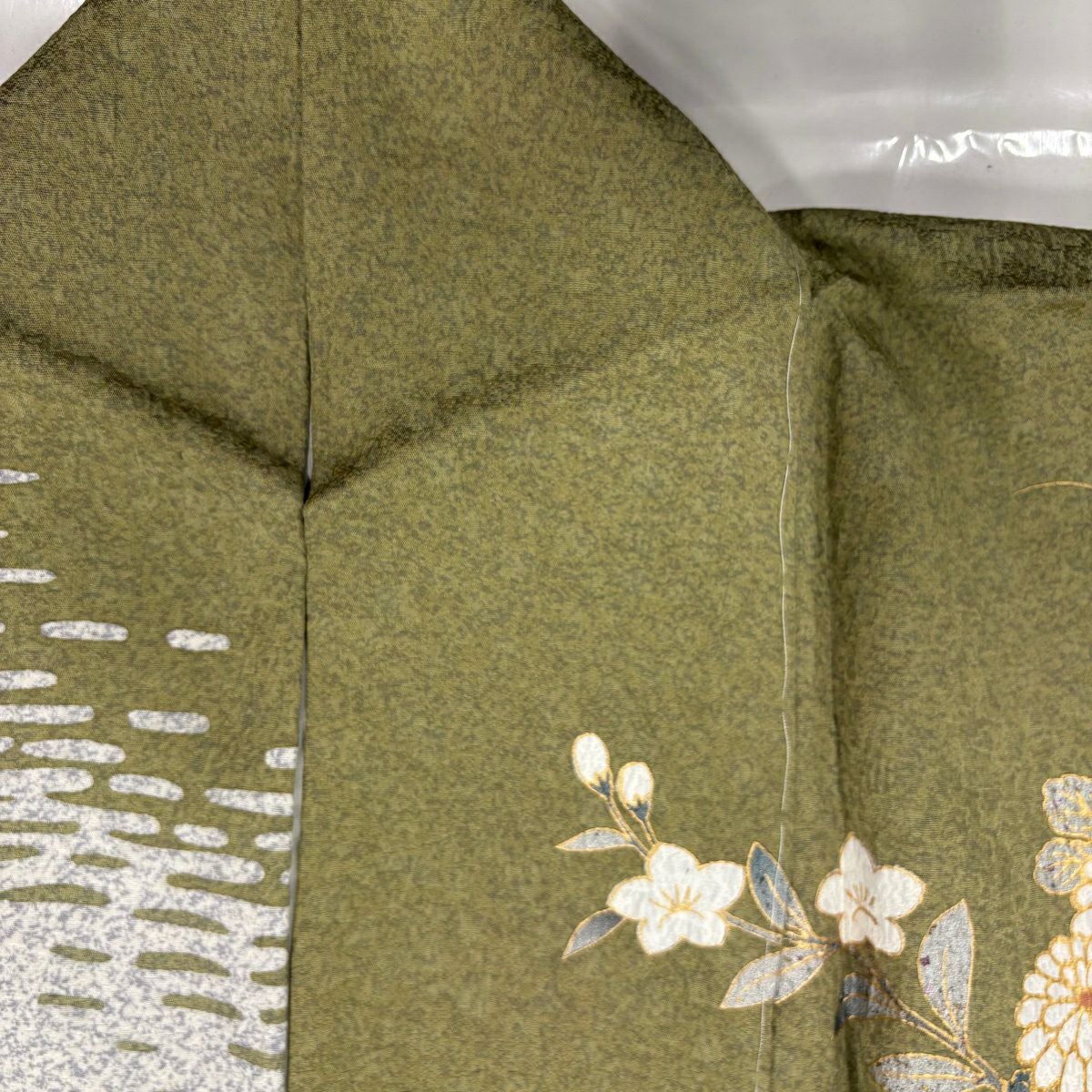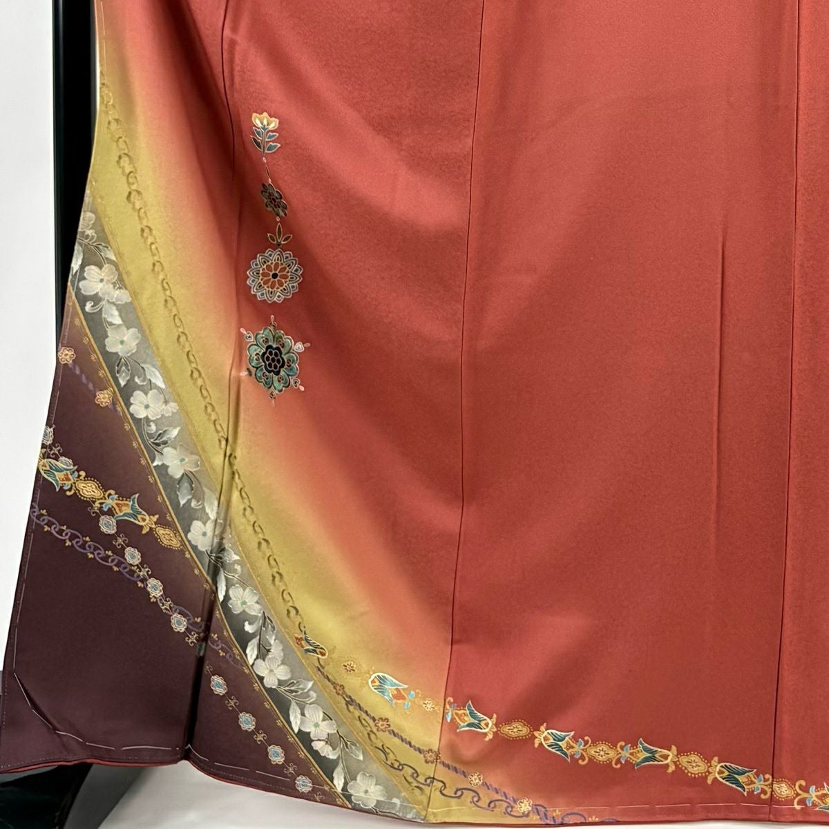 【美品】 付下げ 身丈161.5cm 裄丈66cm M 袷 菱天井 草花 刺繍 ぼかし0 黄土色 正絹 秀品