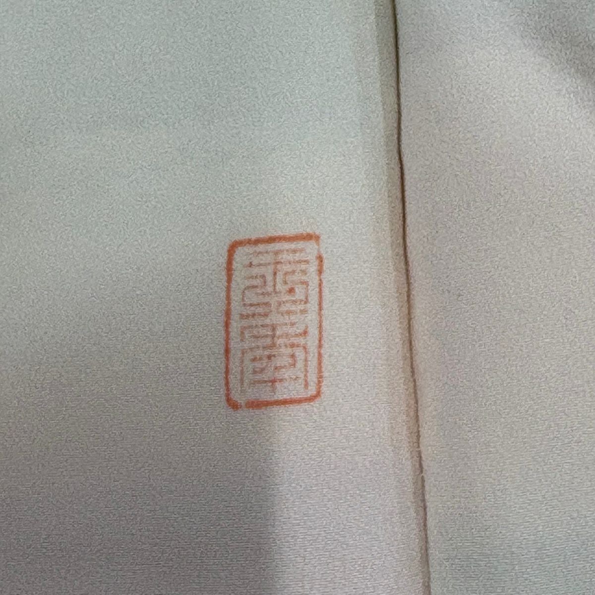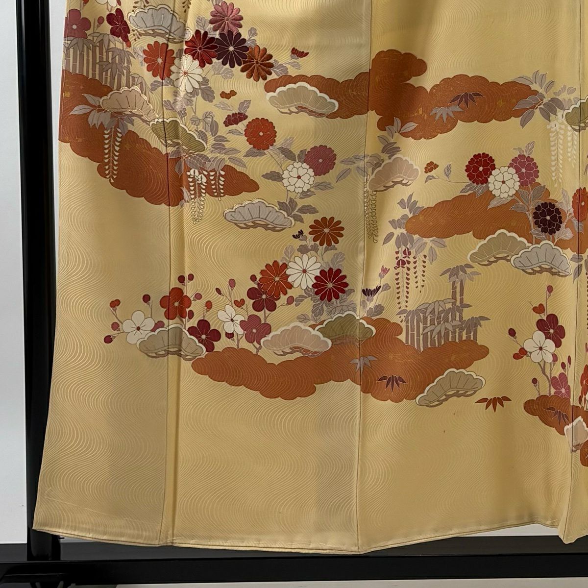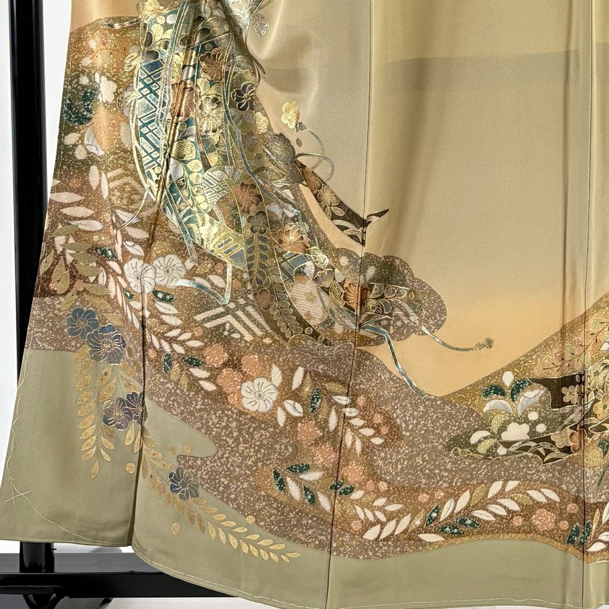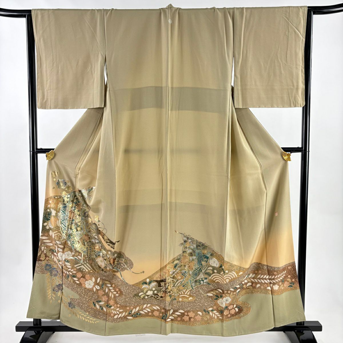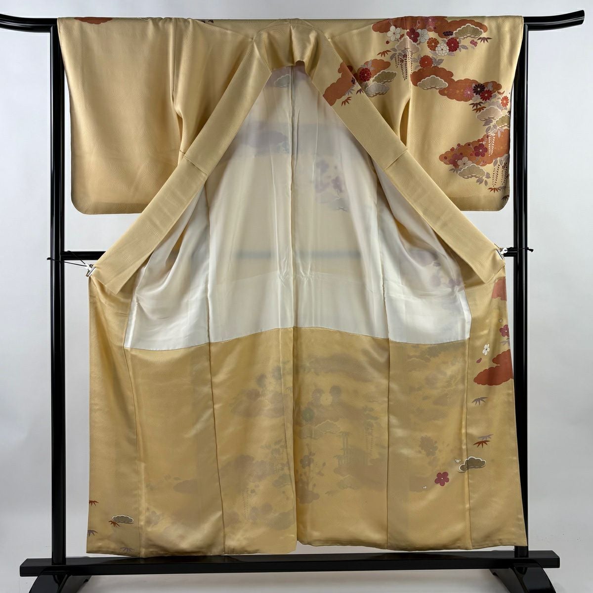 色留袖 身丈160cm 裄丈66cm M 袷 落款あり 几帳 草花 金銀彩 ベージュ 正絹 秀品 一つ紋
