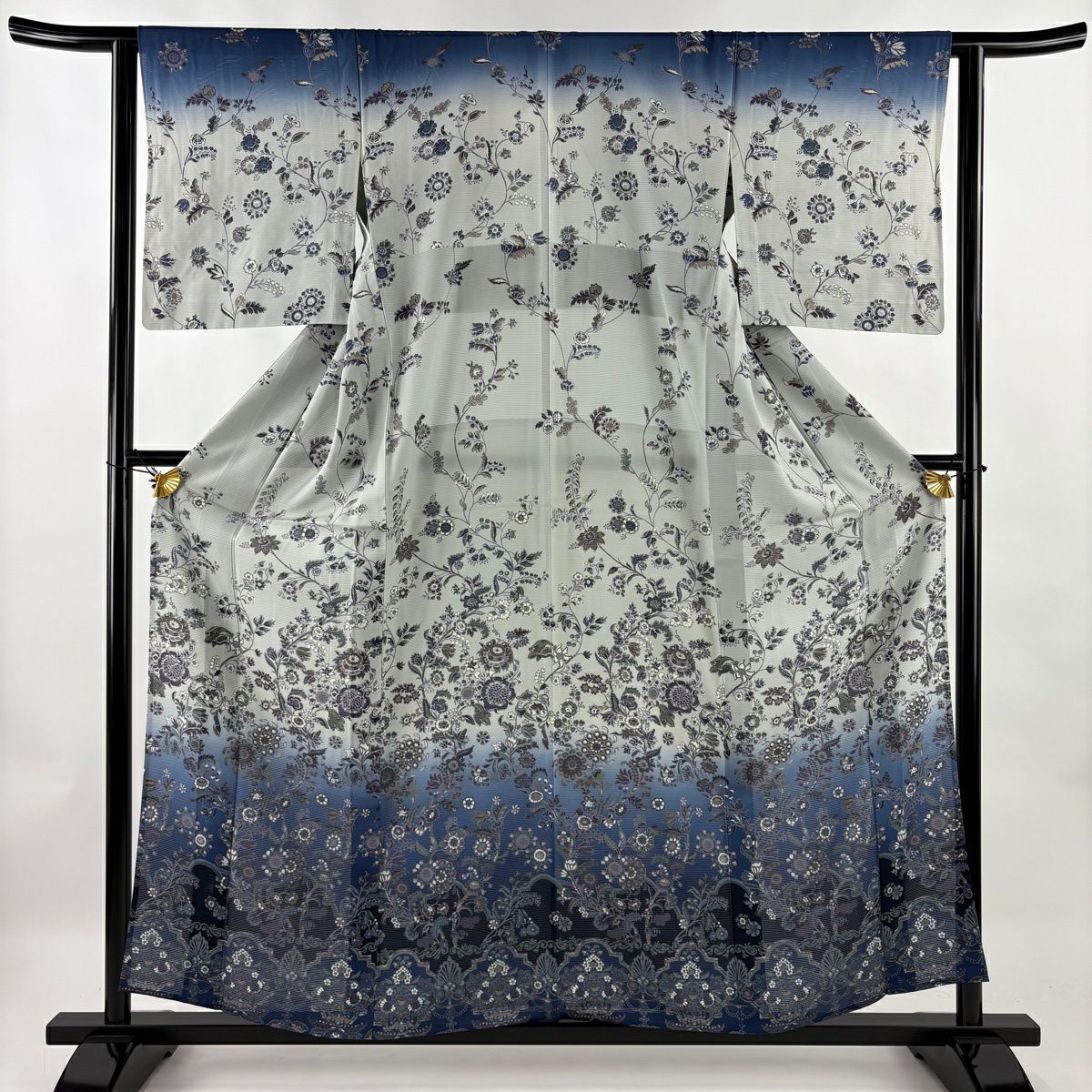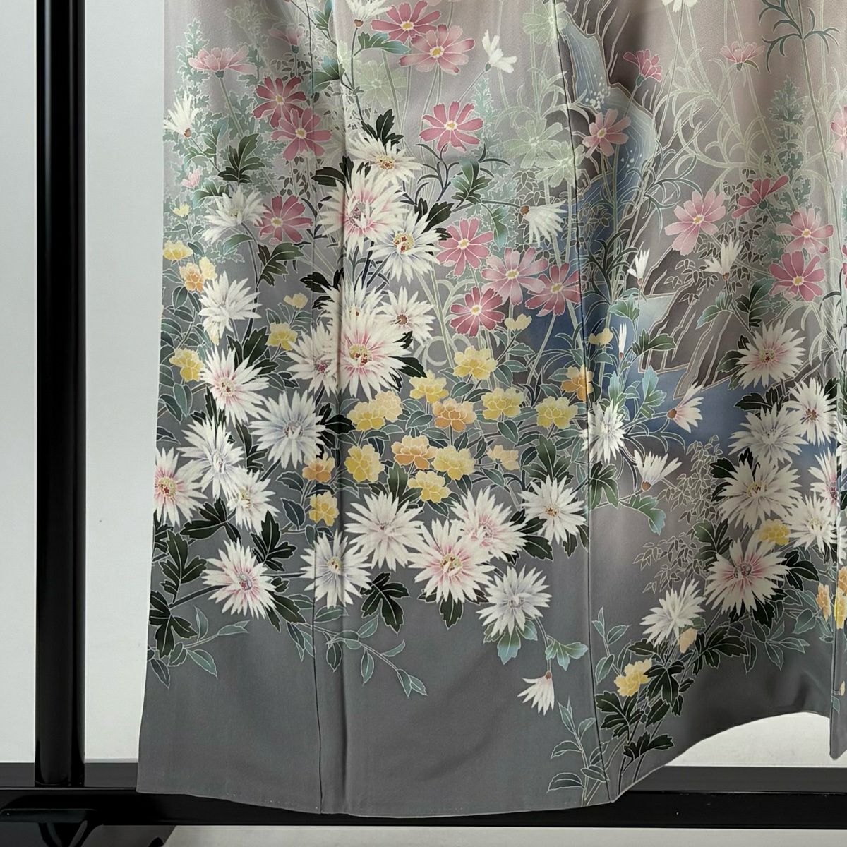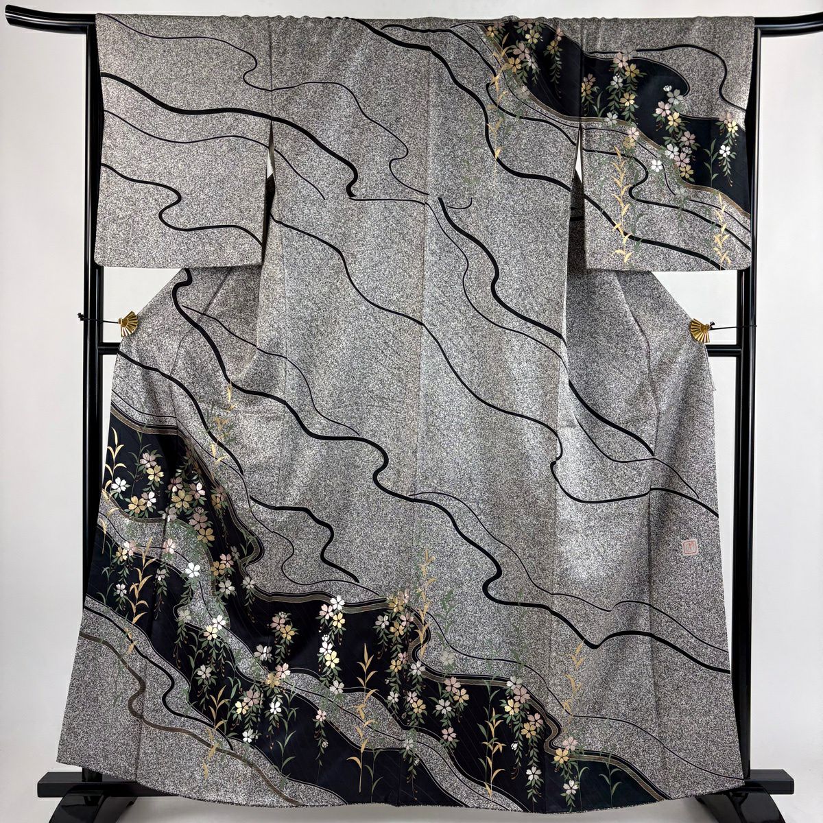訪問着 身丈161.5cm 裄丈67.5cm L 袷 やまと 落款あり 枝垂れ桜 流水 金銀彩 灰白 正絹 秀品