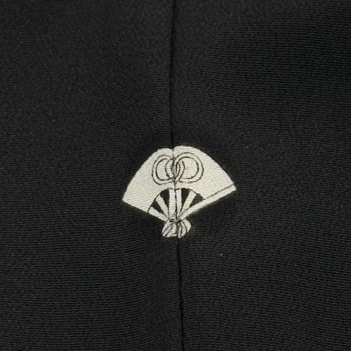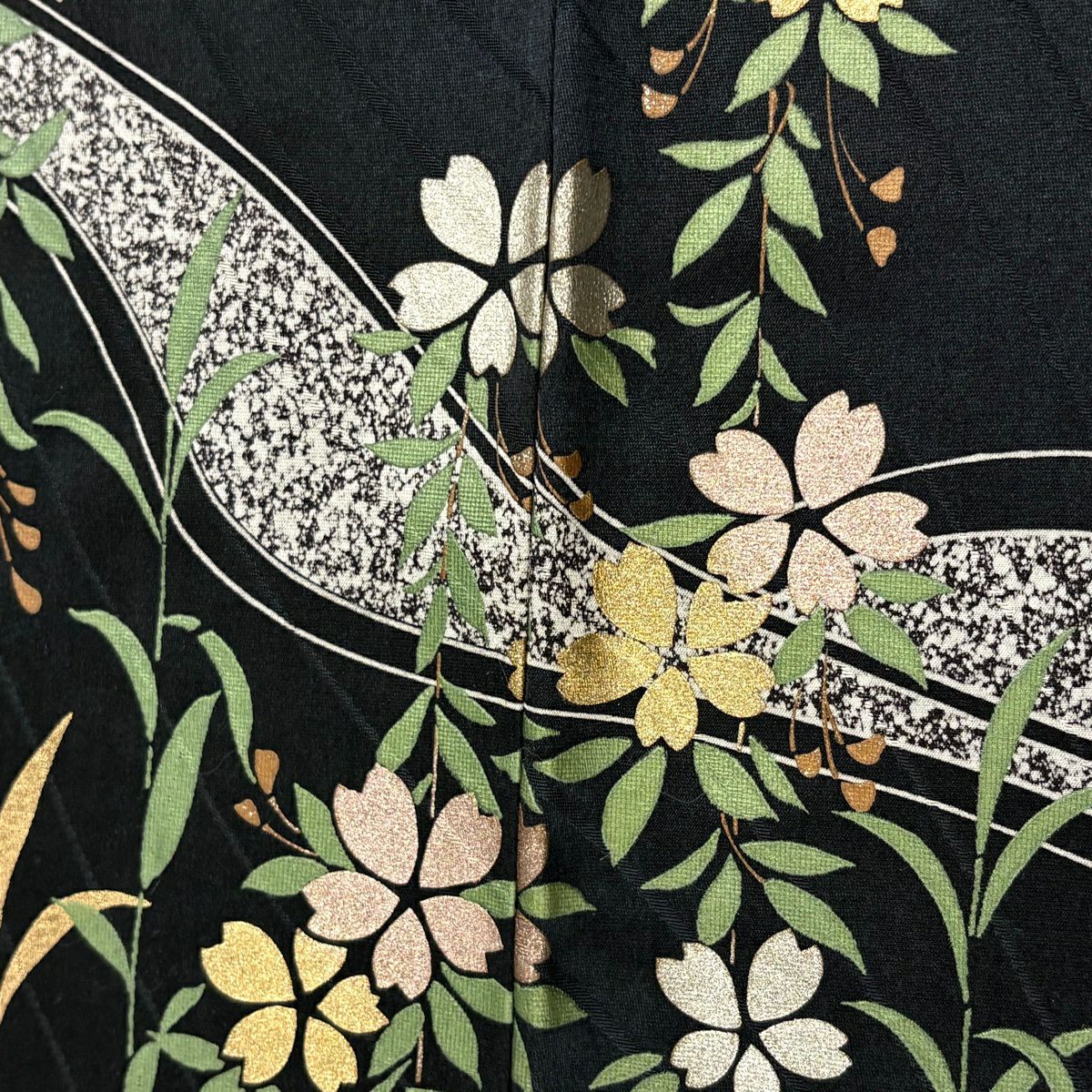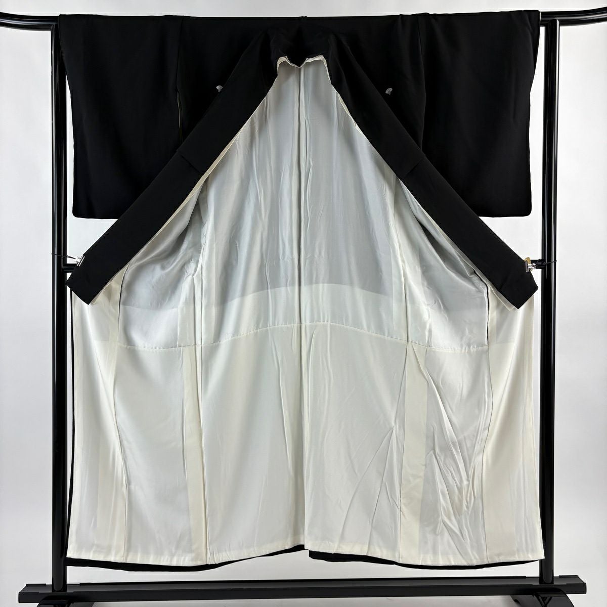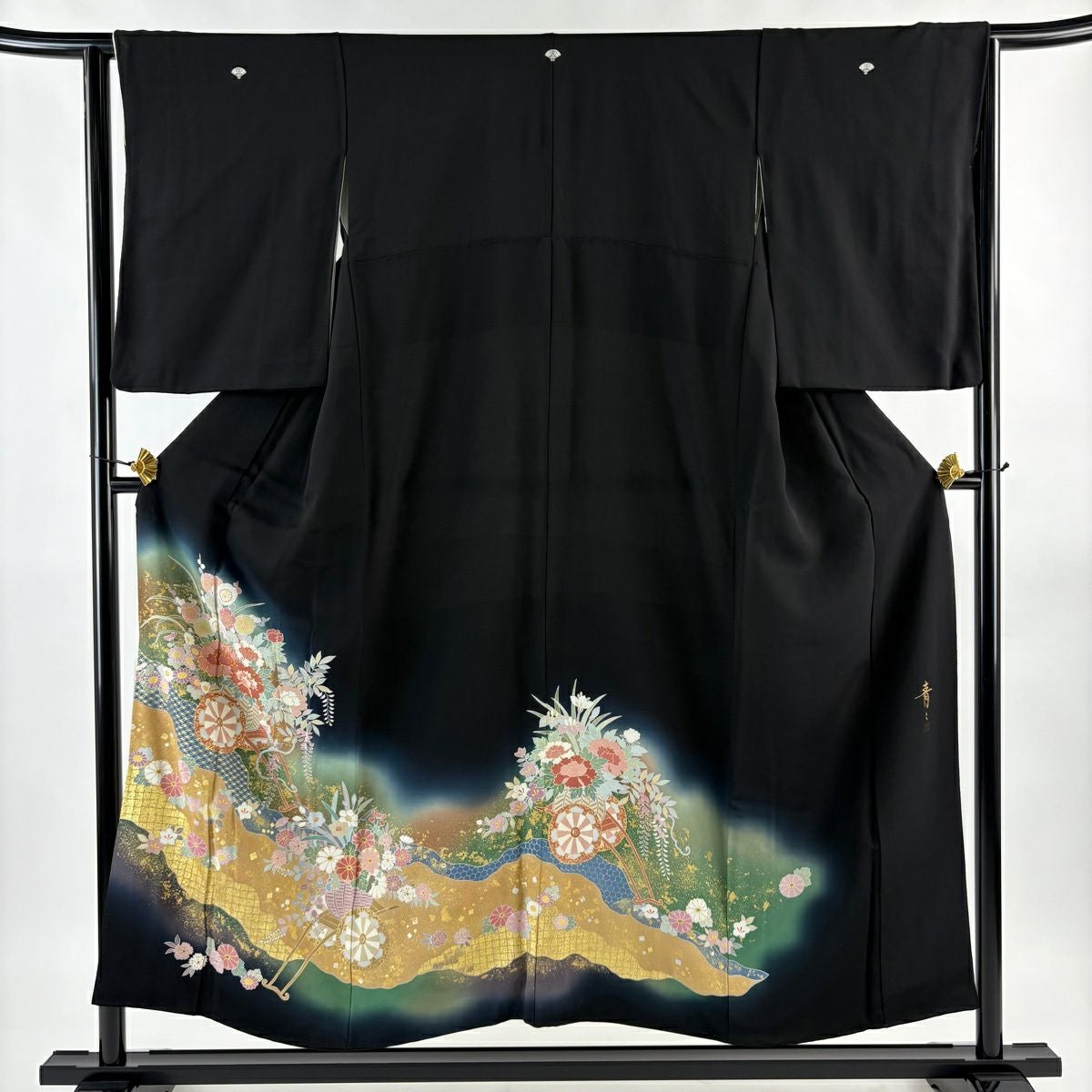 黒留袖 身丈151cm 裄丈64.5cm M 袷 松井青々 落款あり 花車 草花 刺繍 金銀彩 黒 正絹 秀品