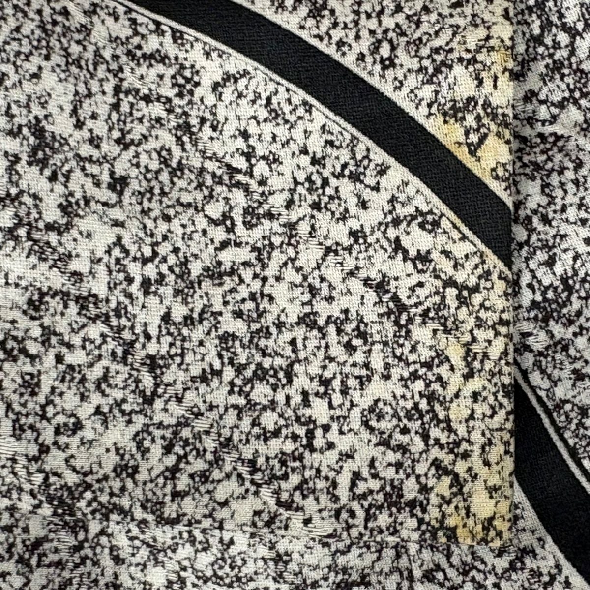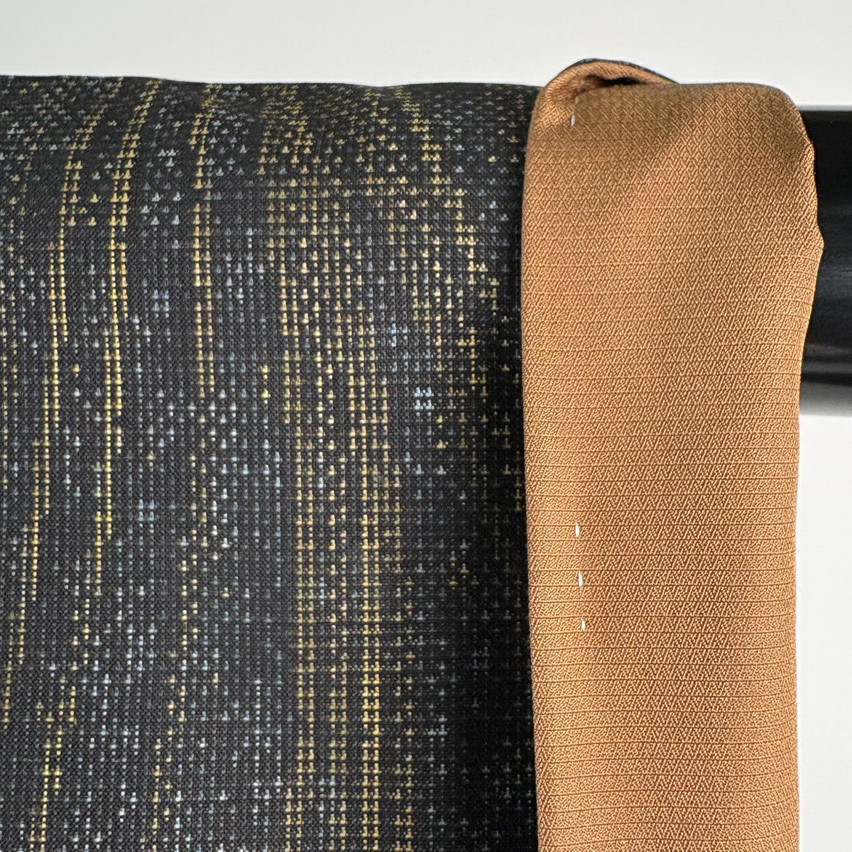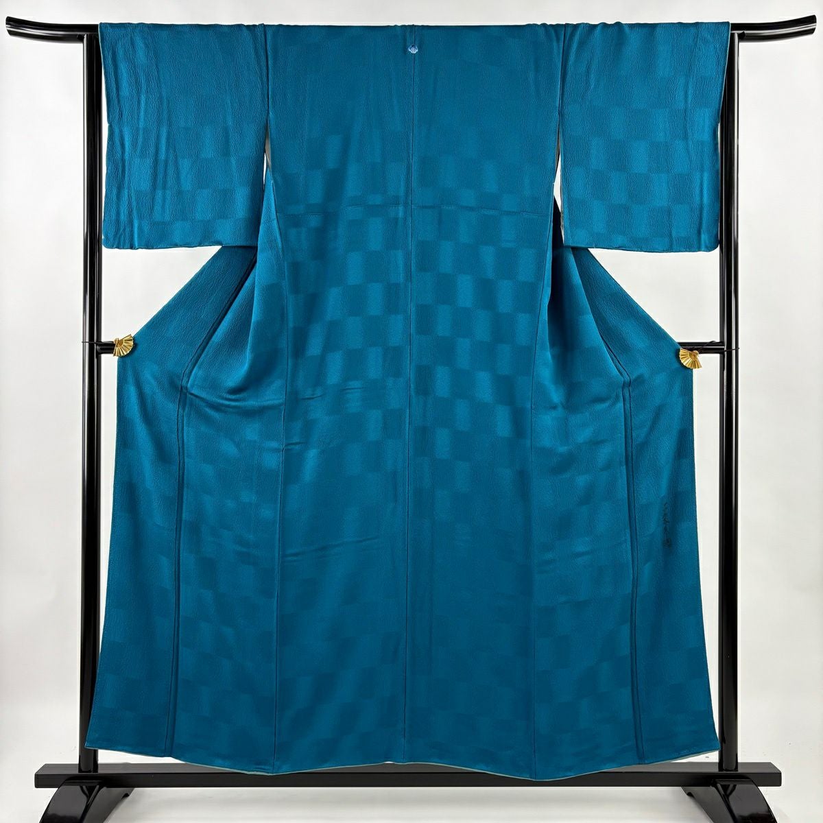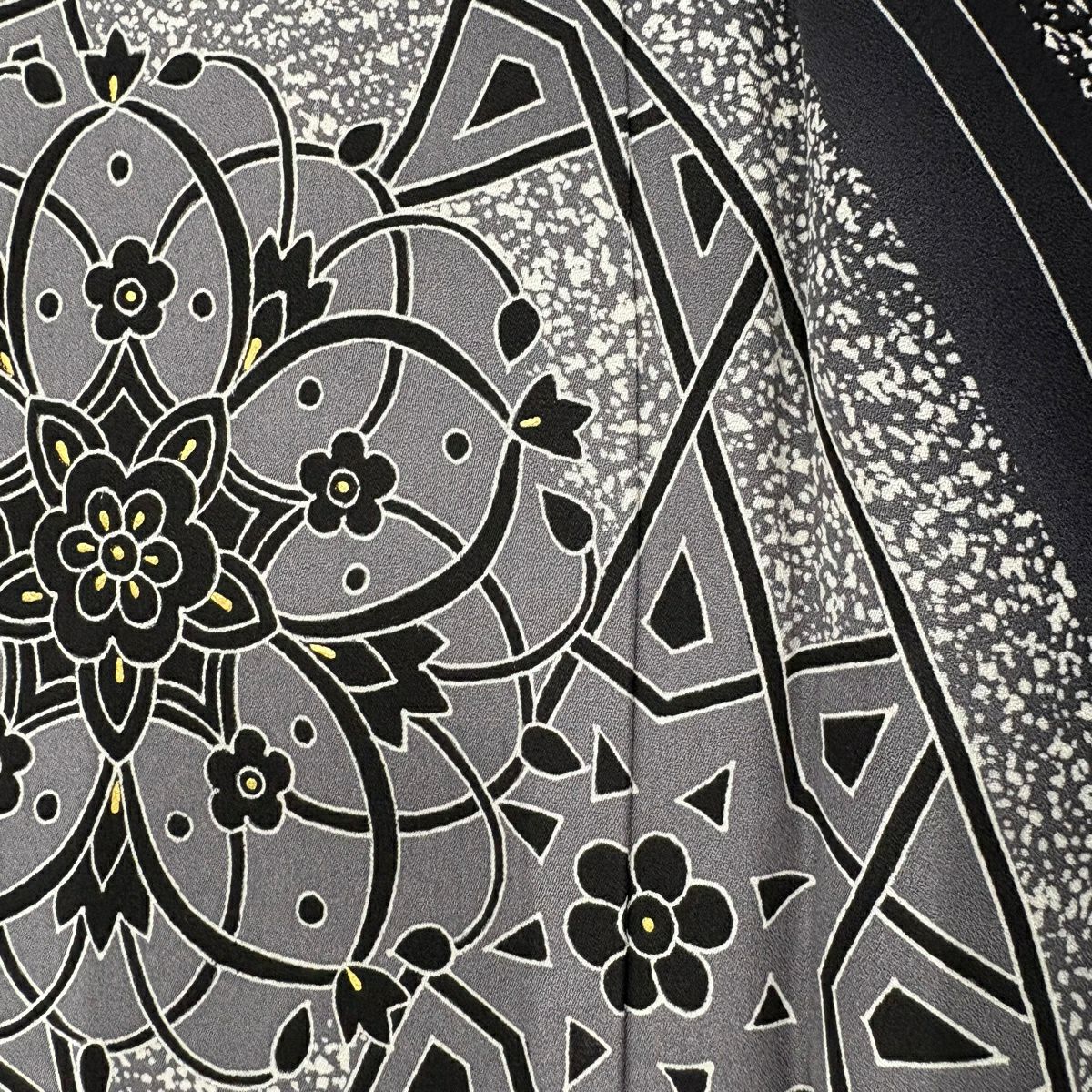 【美品】 紬 身丈161.5cm 裄丈63.5cm S 袷 名古屋セット よろけ縞 幾何学模様 墨色 正絹 秀品