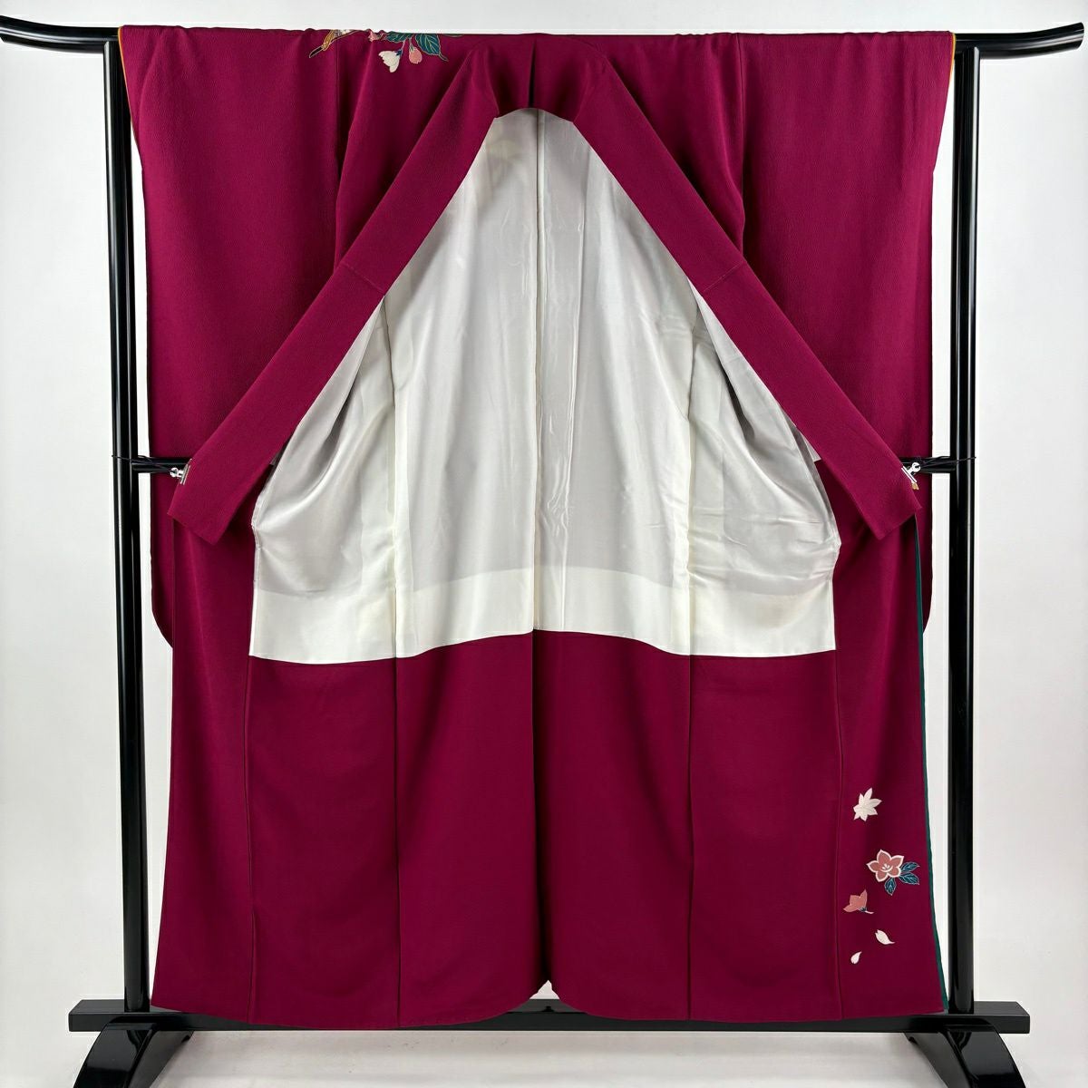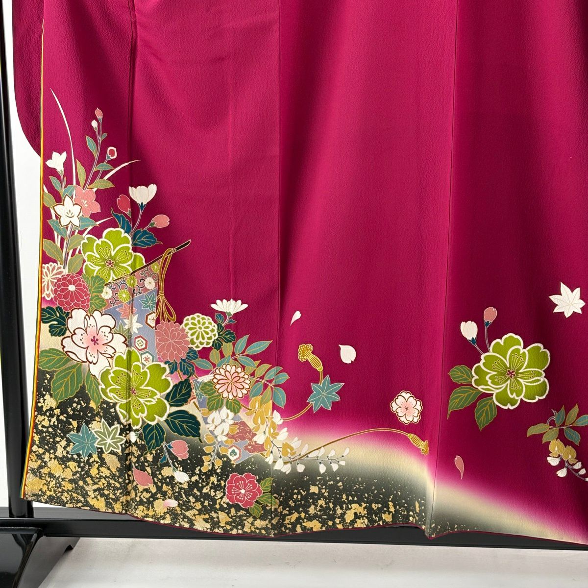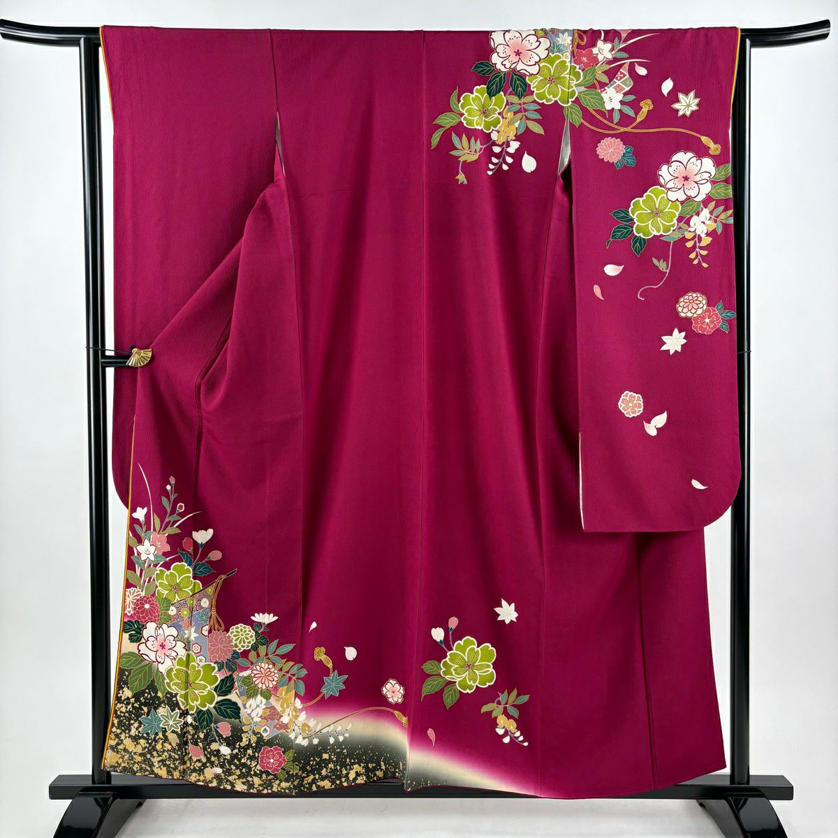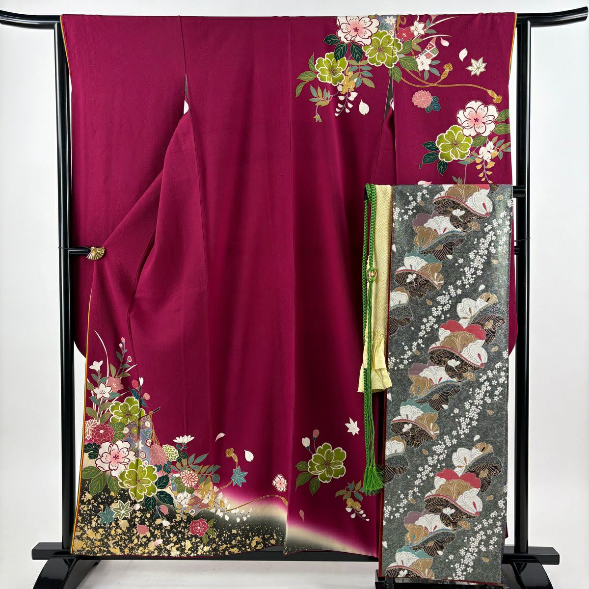 【美品】 振袖 身丈157.5cm 裄丈63cm S 袷 袋帯フルセット 几帳 草花 金彩 赤紫 正絹 秀品