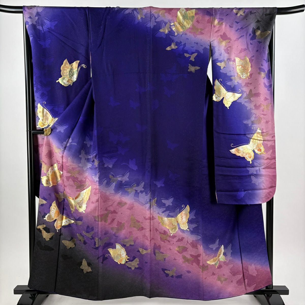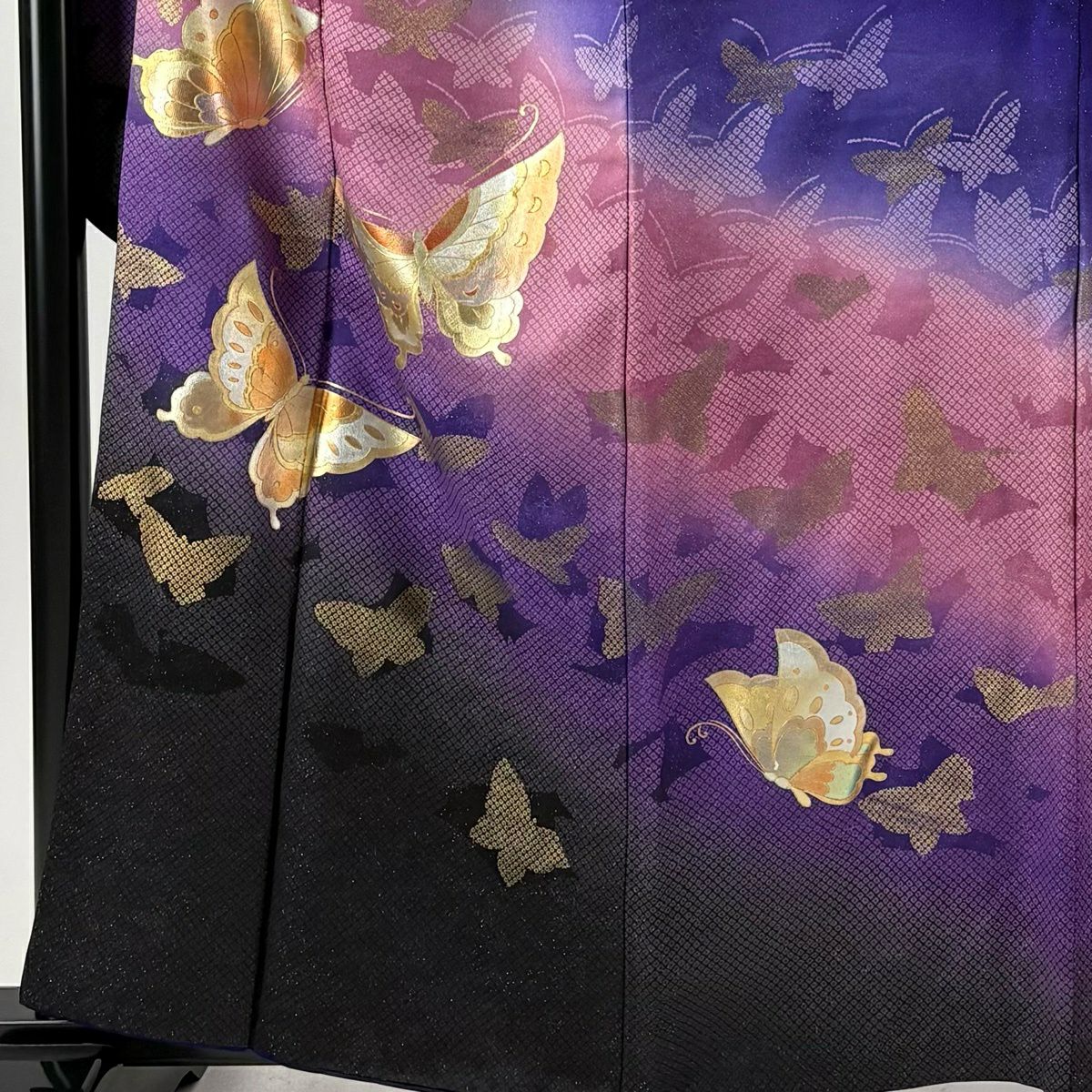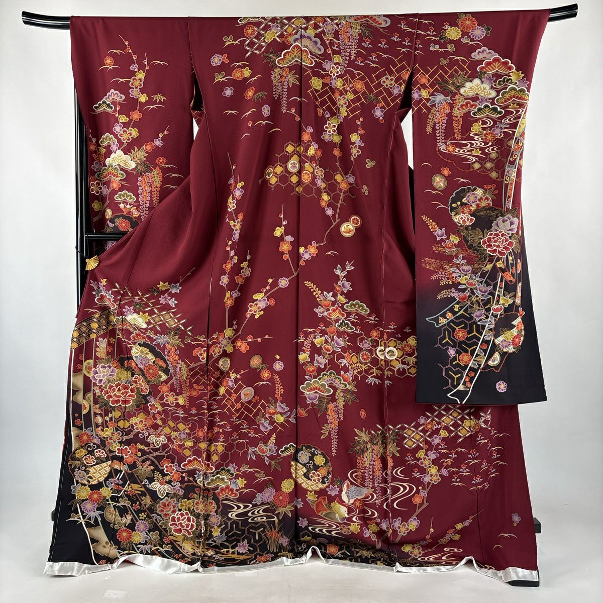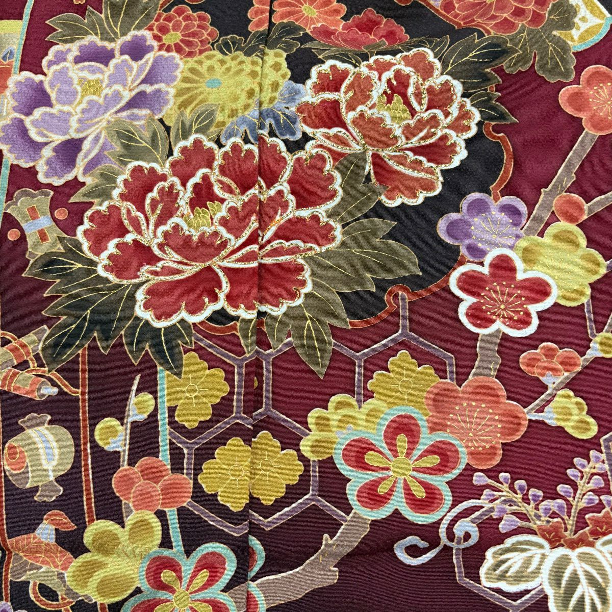 【美品】 振袖 身丈157.5cm 裄丈63cm S 袷 袋帯フルセット 几帳 草花 金彩 赤紫 正絹 秀品