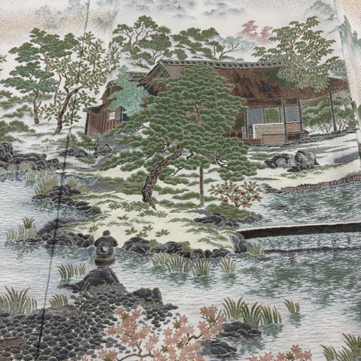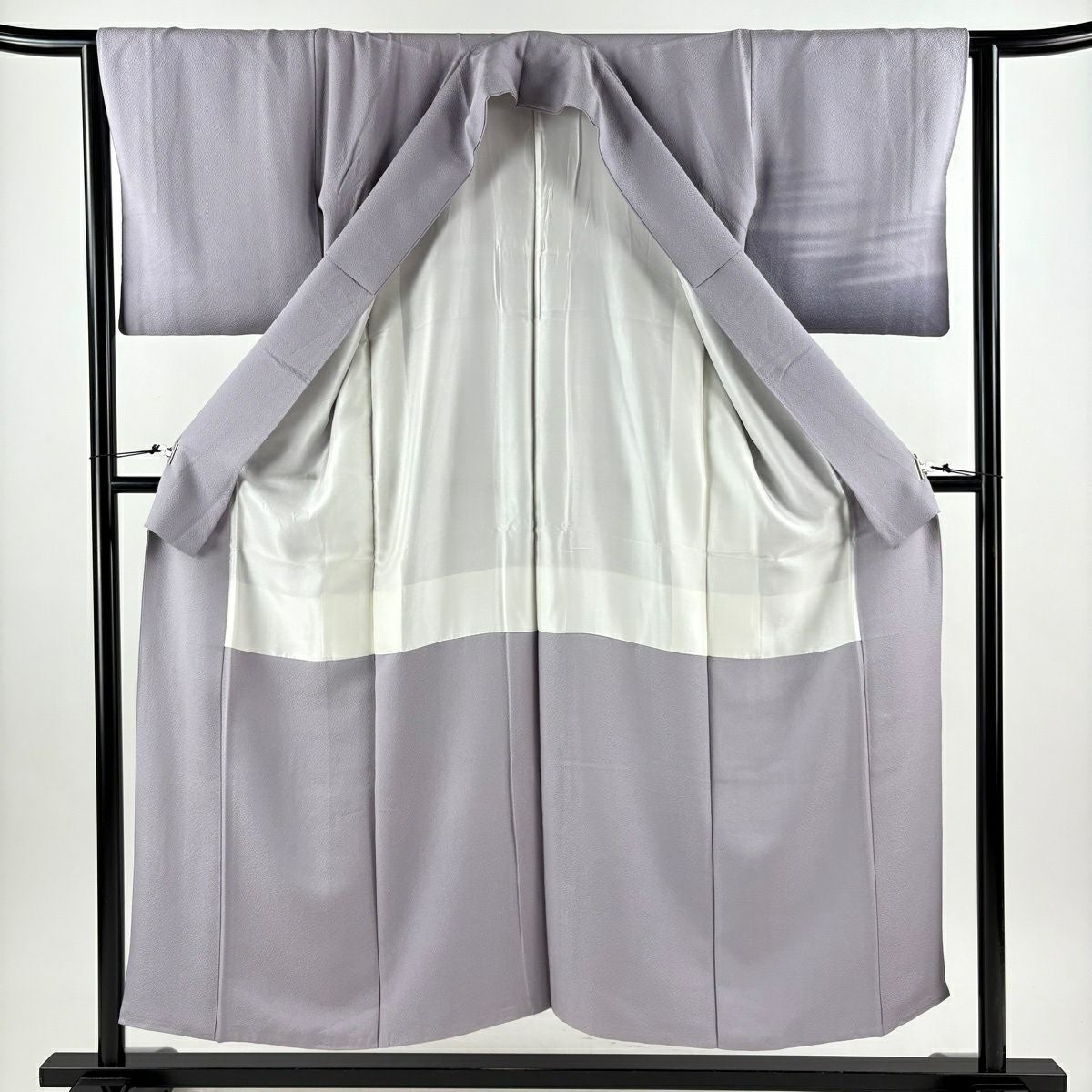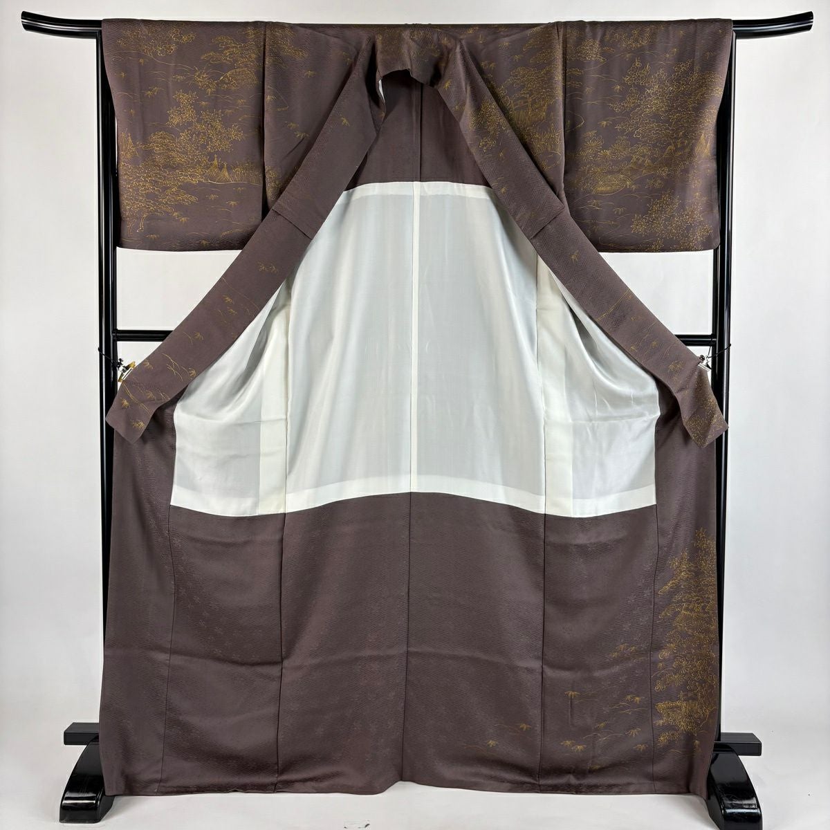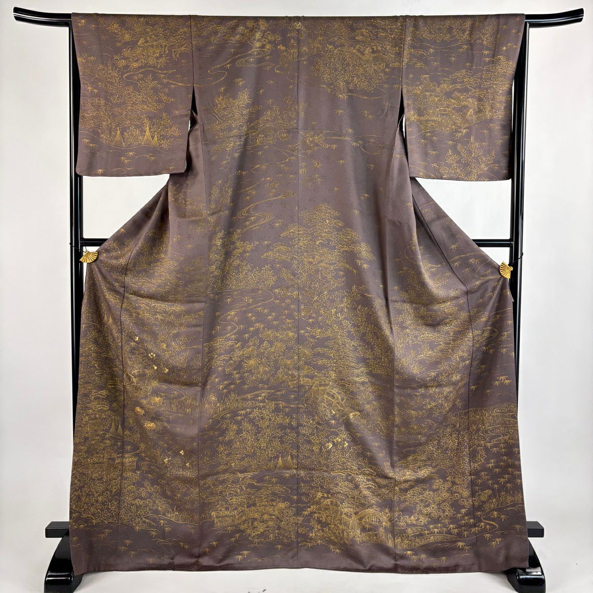 訪問着 身丈168.5cm 裄丈65.5cm M 袷 背抜き 風景 松竹梅 刺繍 金彩 灰紫 正絹 秀品 一つ紋