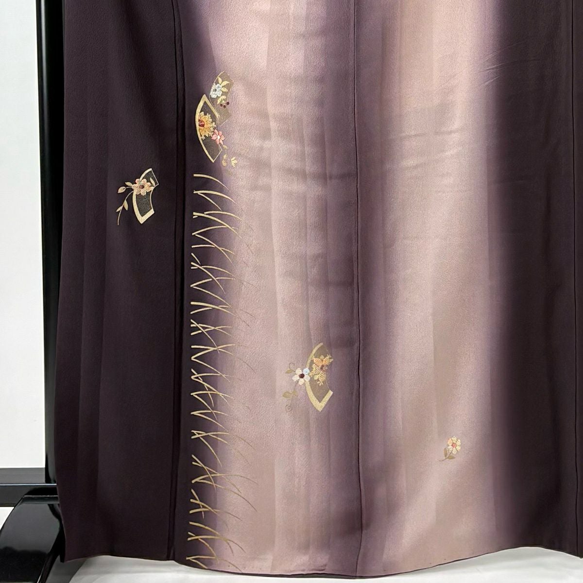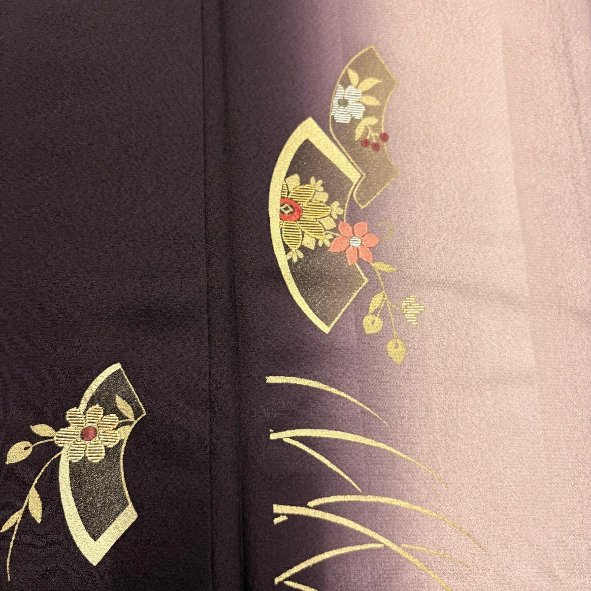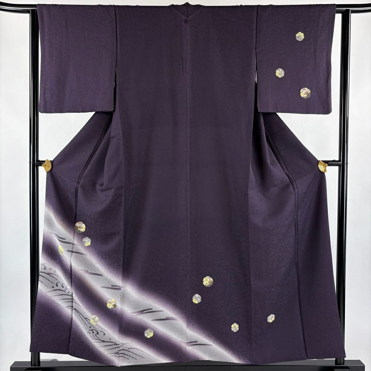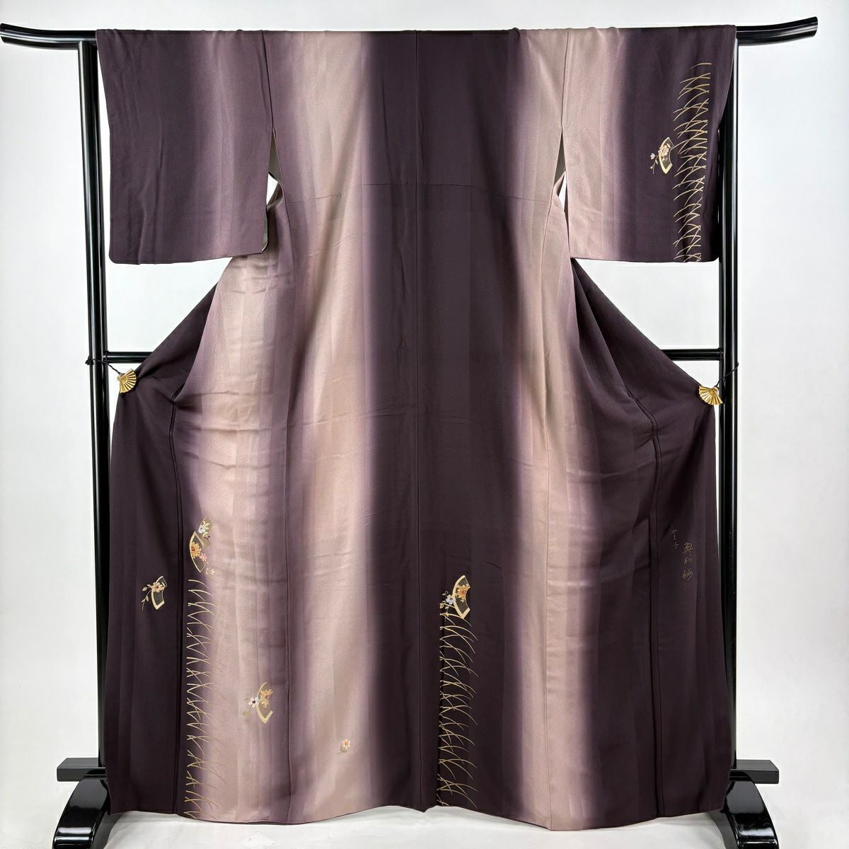 【美品】 付下げ 身丈169cm 裄丈65.5cm M 袷 落款あり 扇面 草花 箔 金彩 濃紫 正絹 秀品