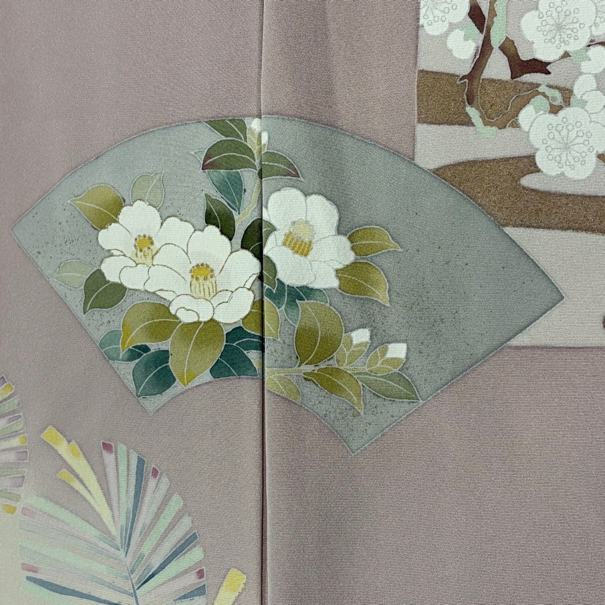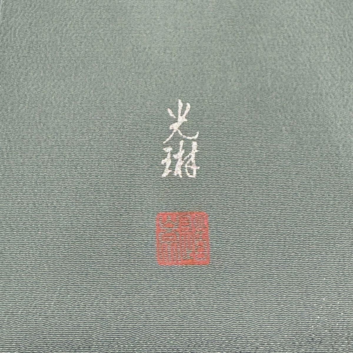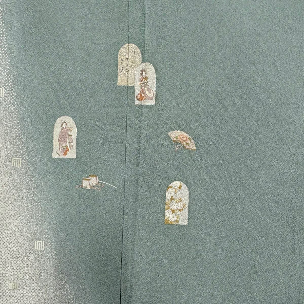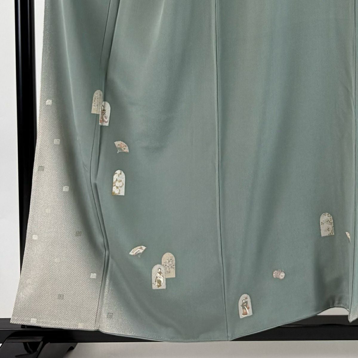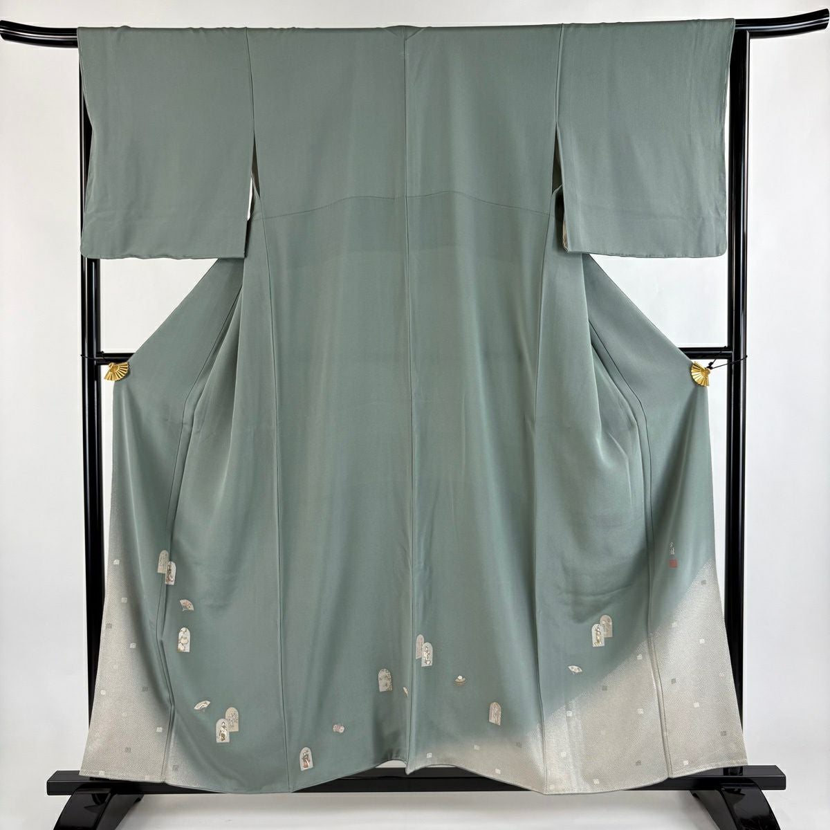 付下げ 身丈158cm 裄丈65cm M 袷 松尾光琳 落款あり 扇 人物 金銀彩 灰緑 正絹 秀品 一つ紋
