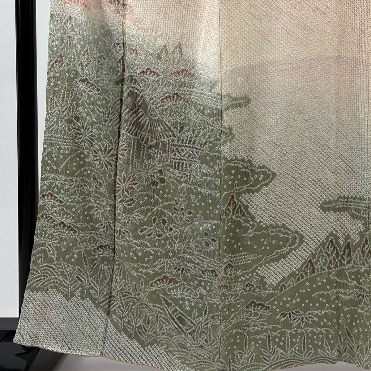 訪問着 身丈163.5cm 裄丈66cm M 袷 家屋 松竹梅 絞り 染め分け ピンク 正絹 秀品 一つ紋