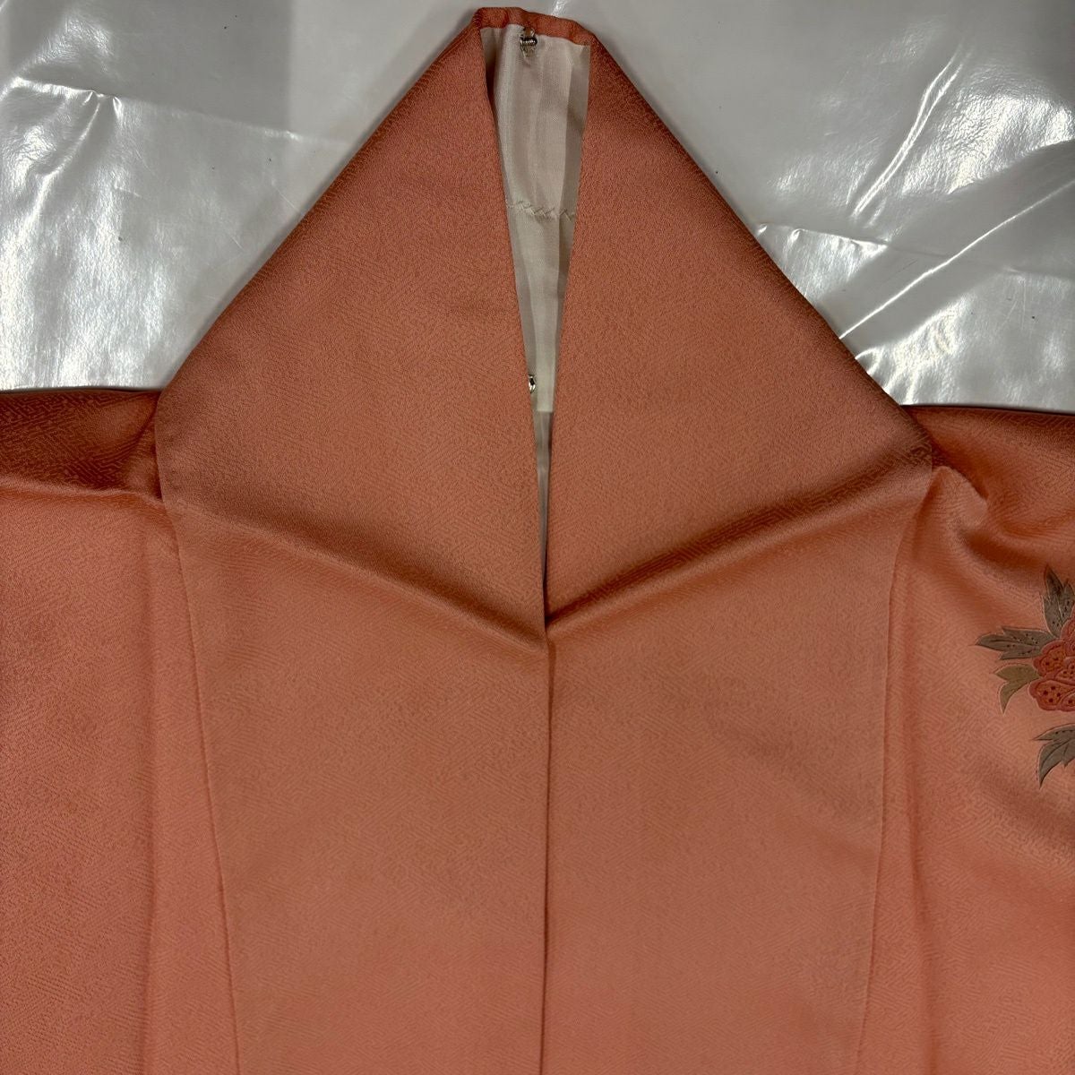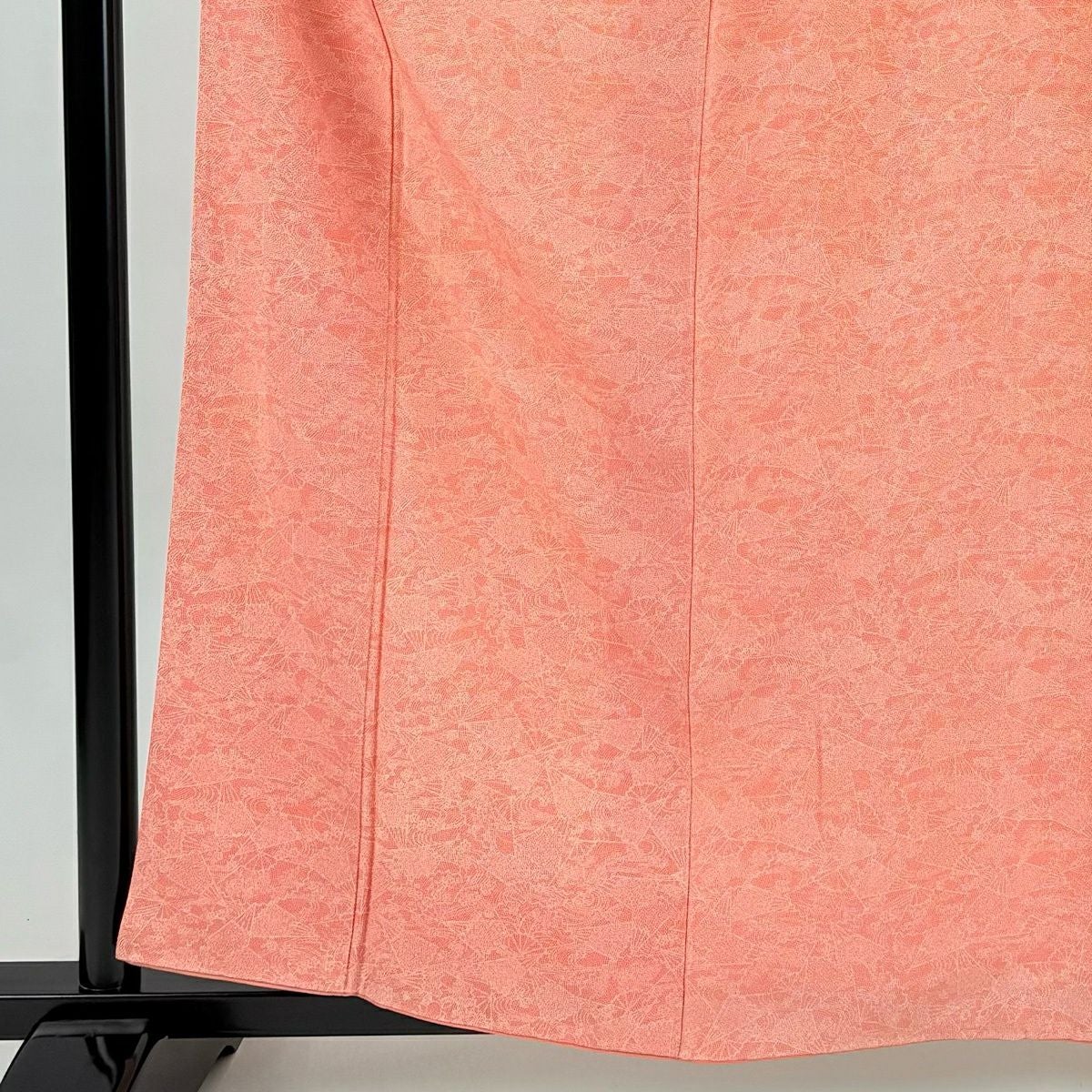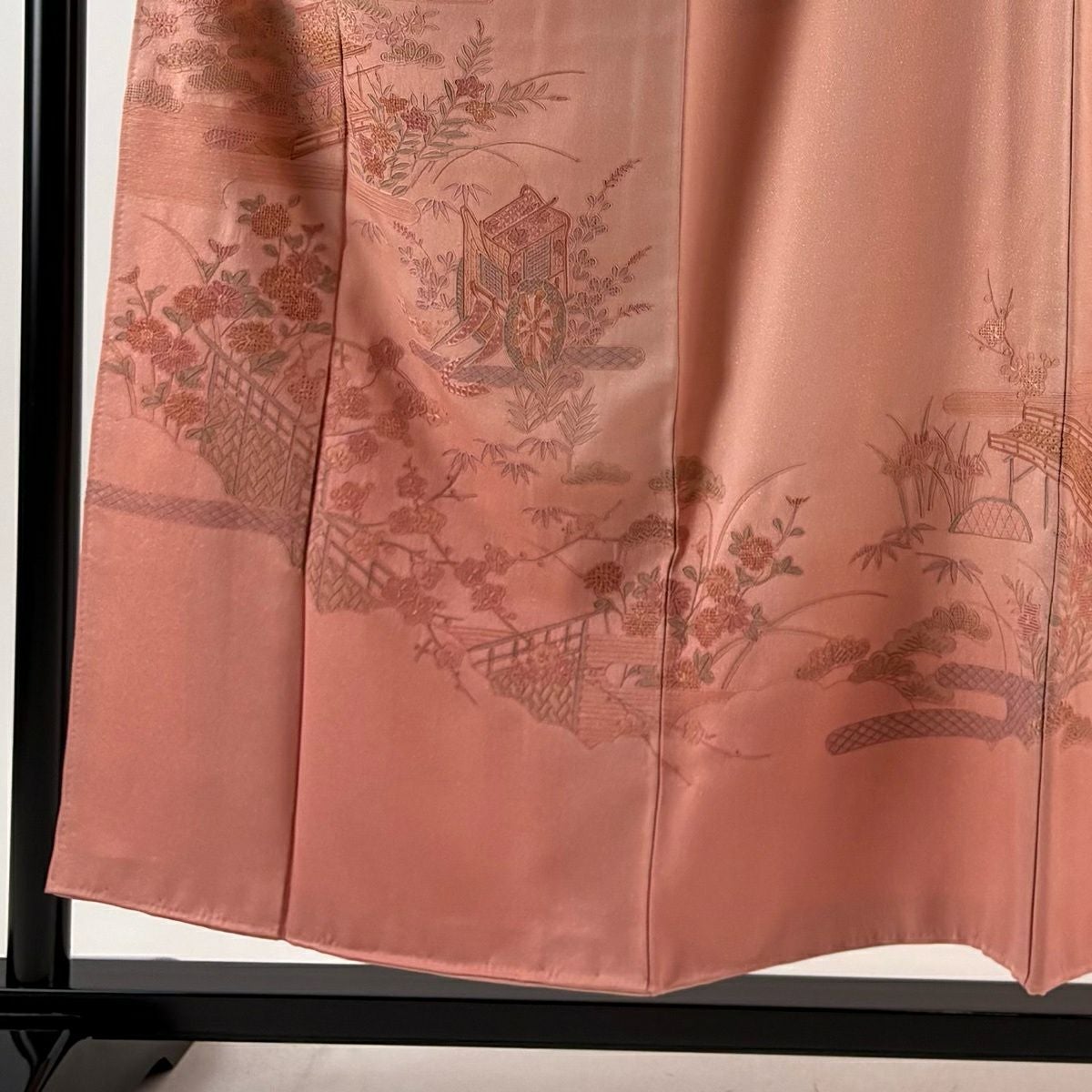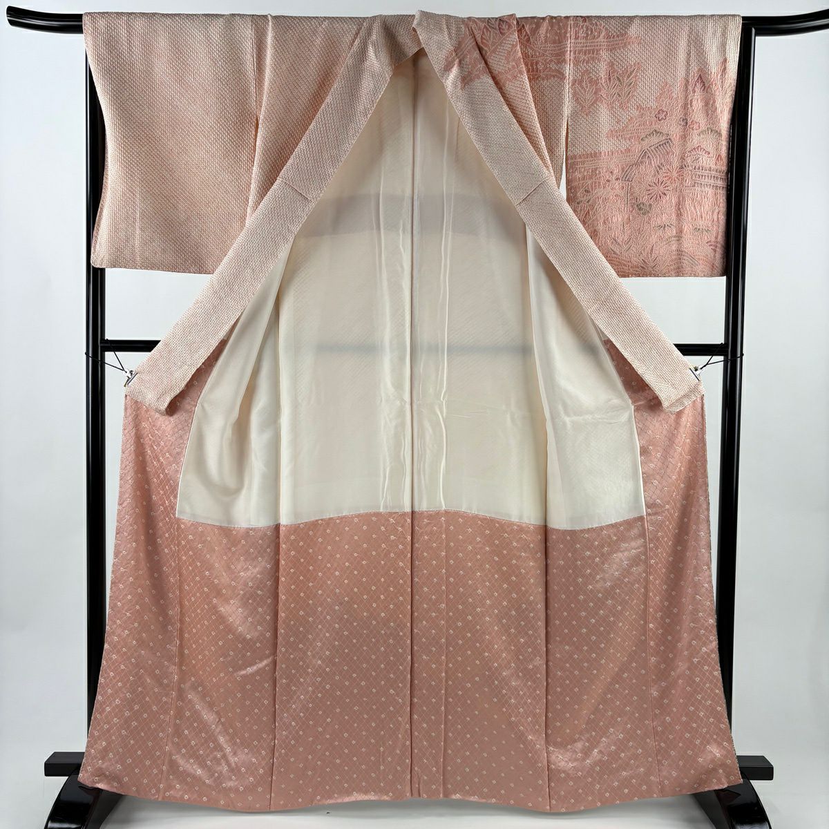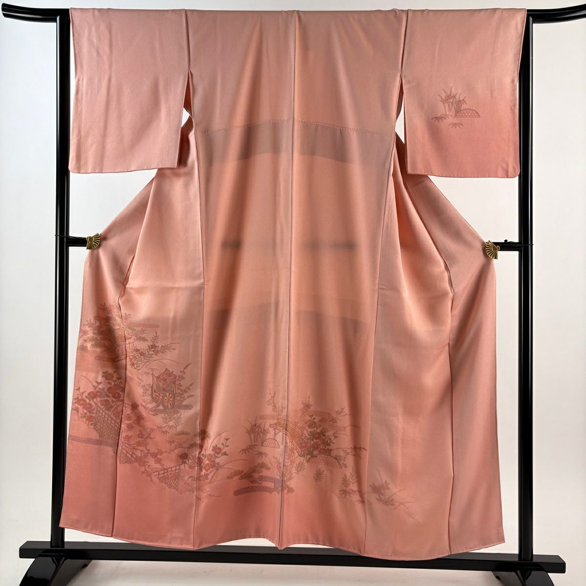 付下げ 身丈156cm 裄丈64.5cm M 袷 御所車 松竹梅 金通し 刺繍 サーモンピンク 正絹 秀品
