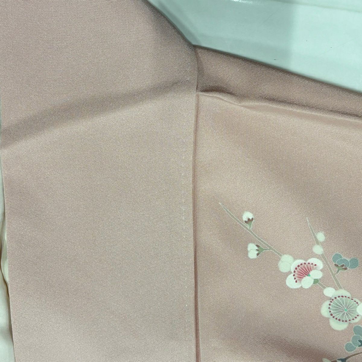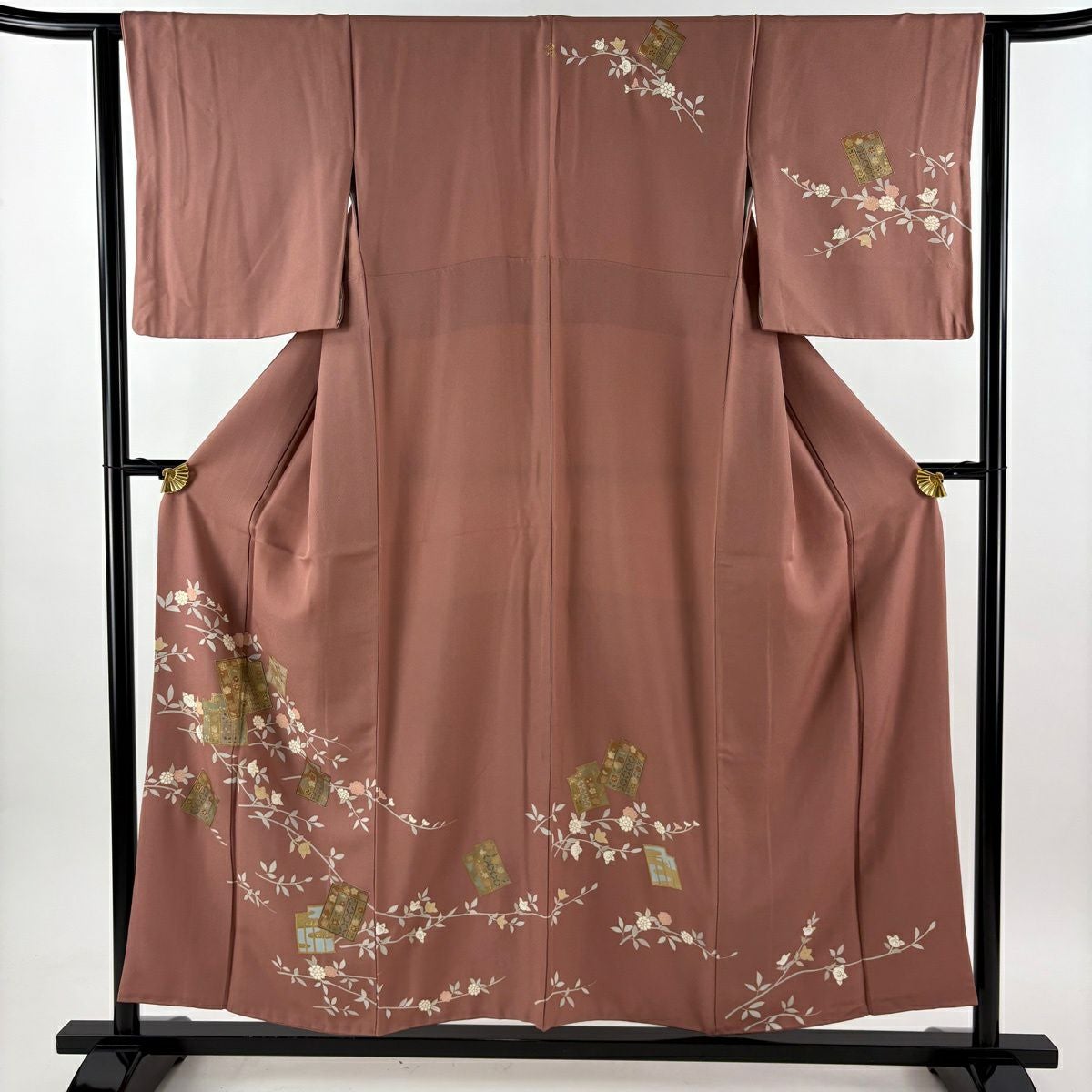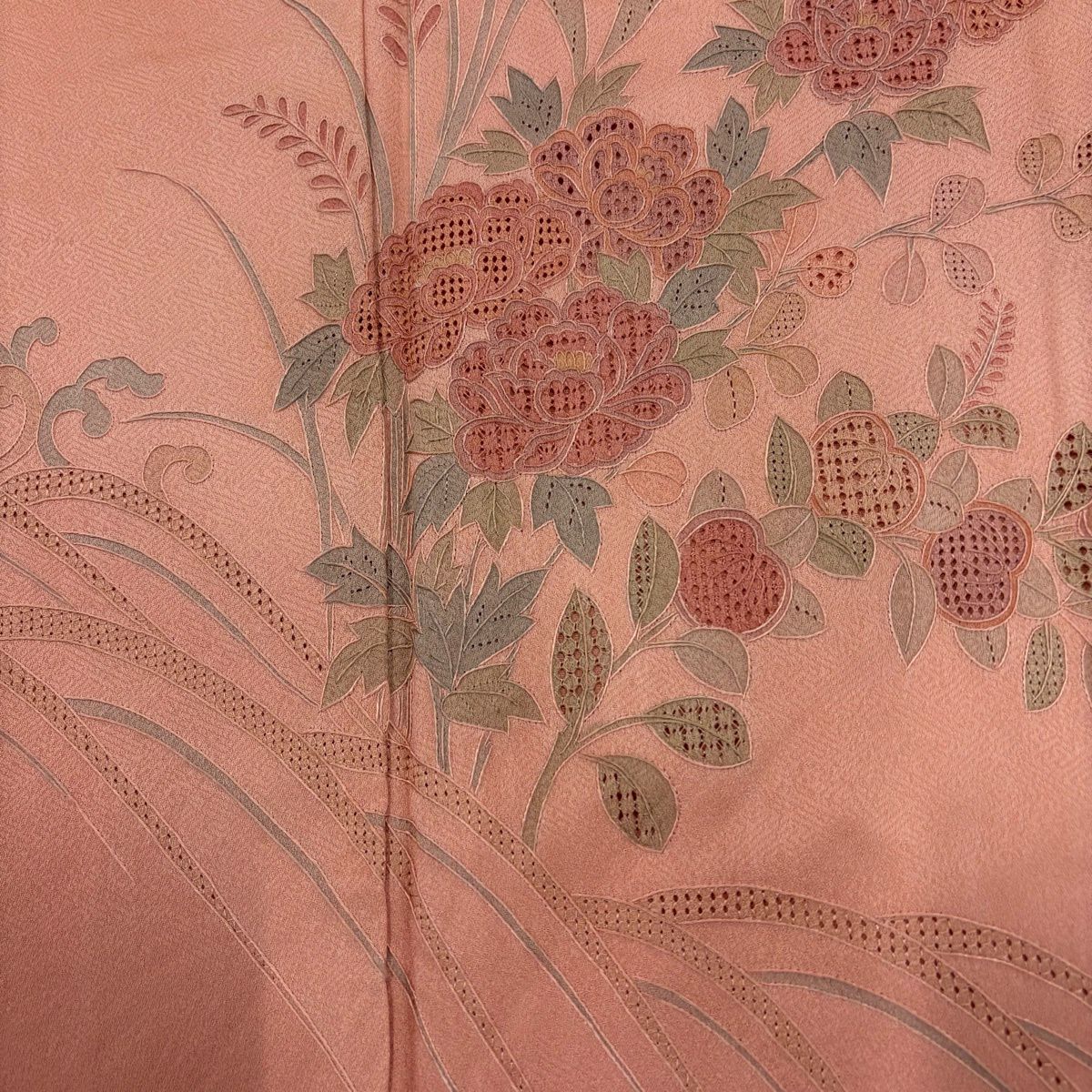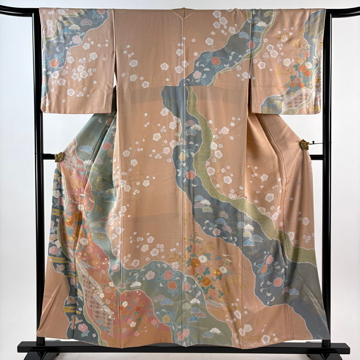 付下げ 身丈156cm 裄丈64.5cm M 袷 御所車 松竹梅 金通し 刺繍 サーモンピンク 正絹 秀品