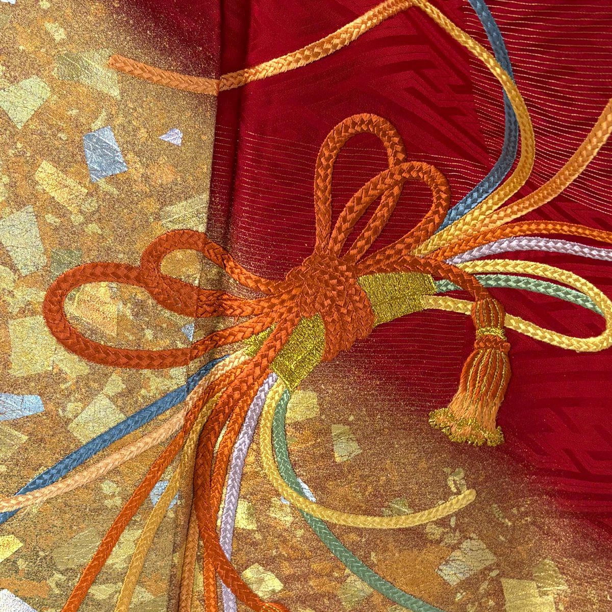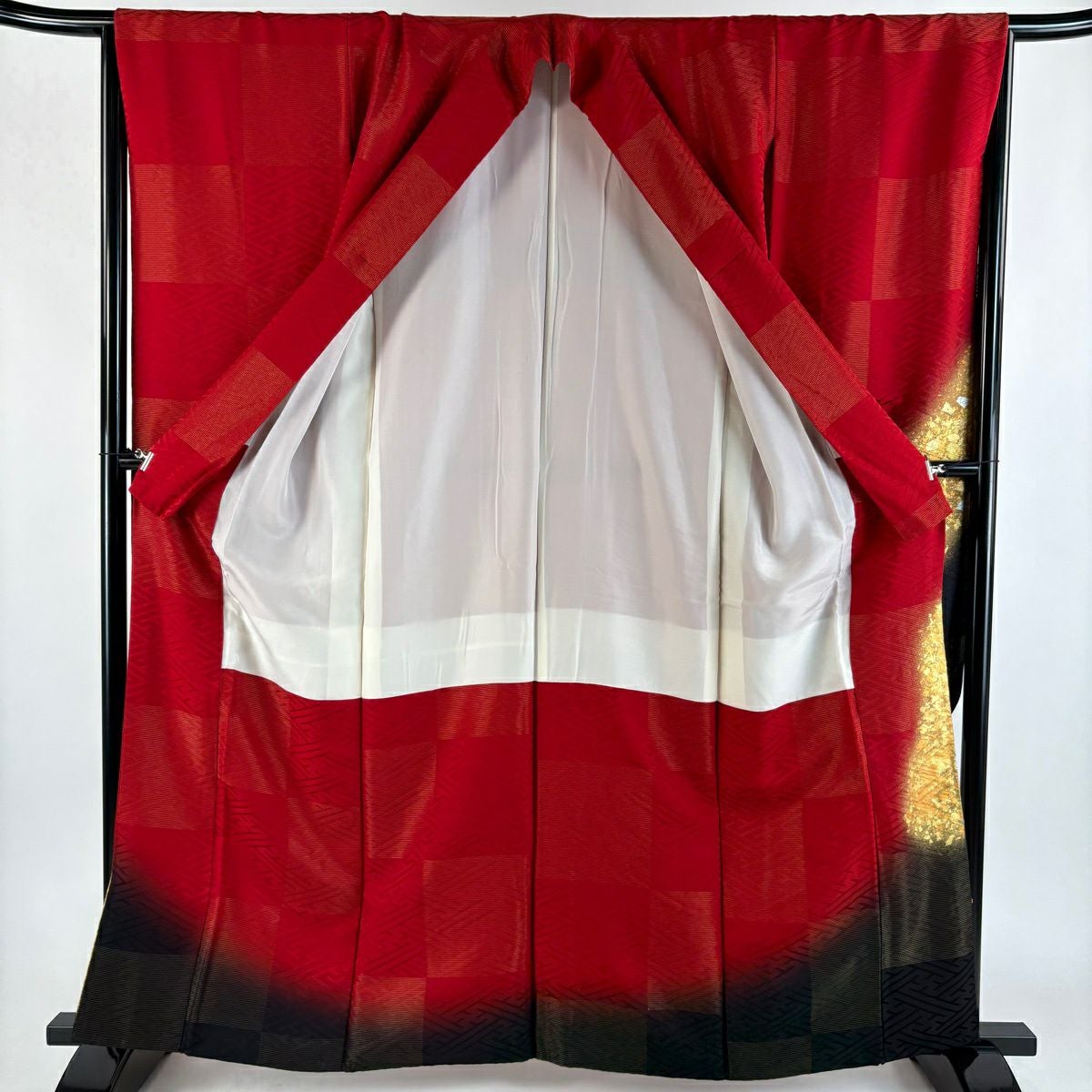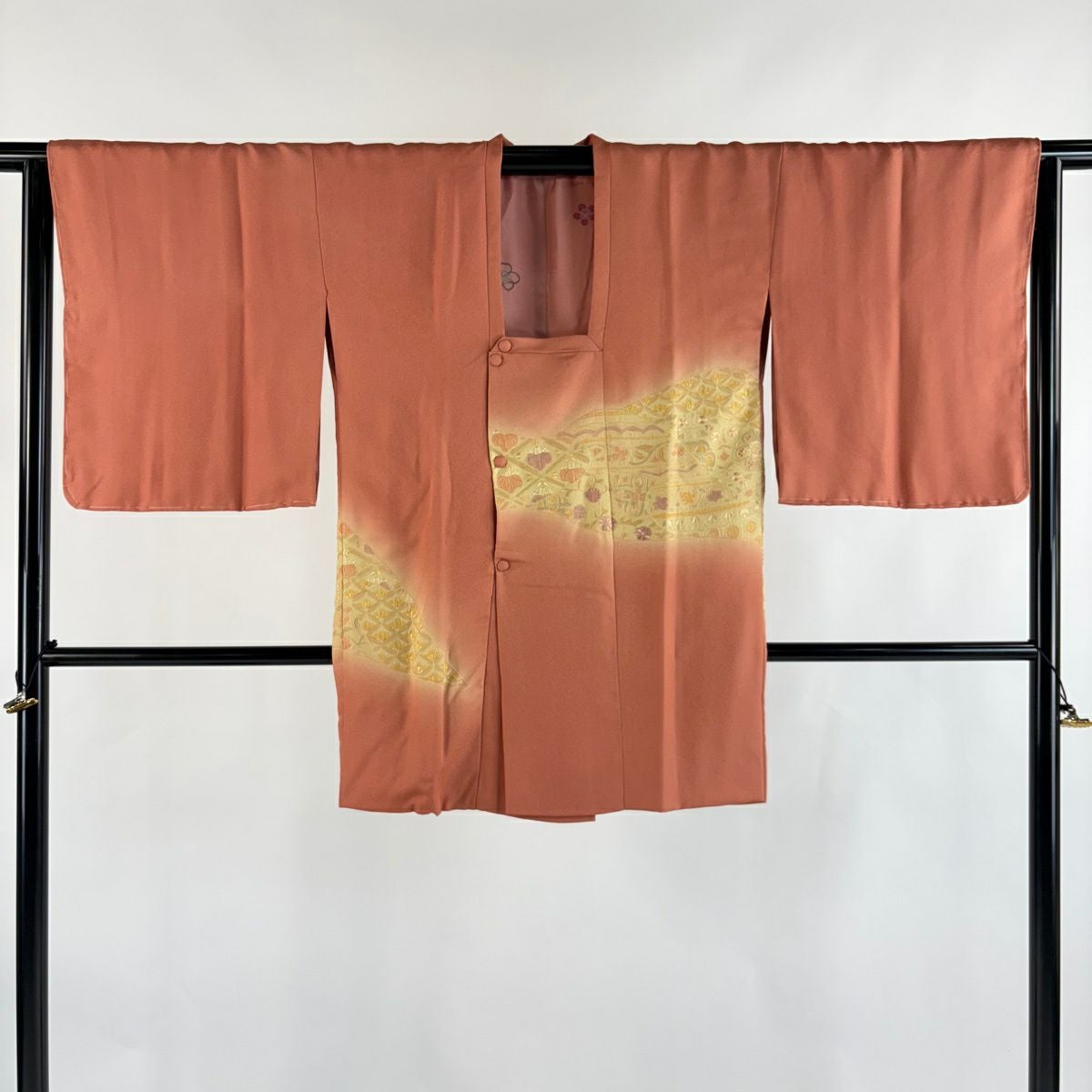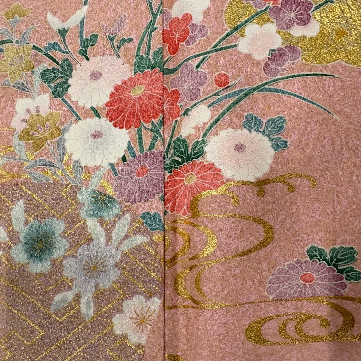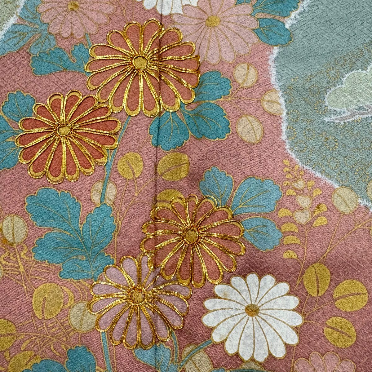 付下げ 身丈156cm 裄丈64.5cm M 袷 御所車 松竹梅 金通し 刺繍 サーモンピンク 正絹 秀品