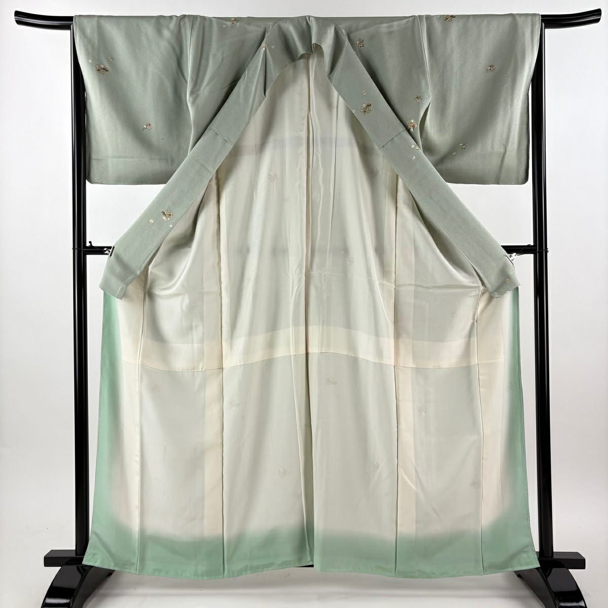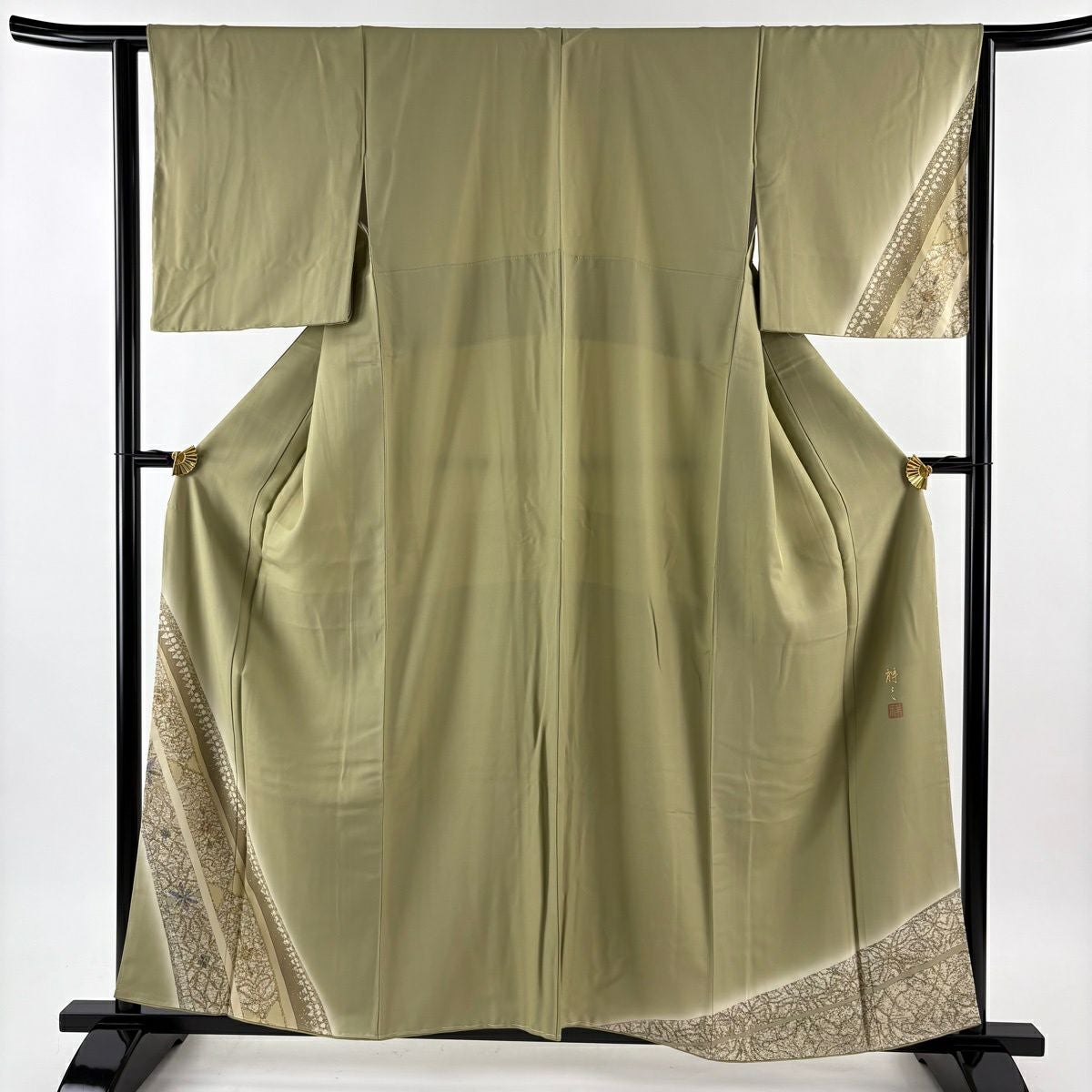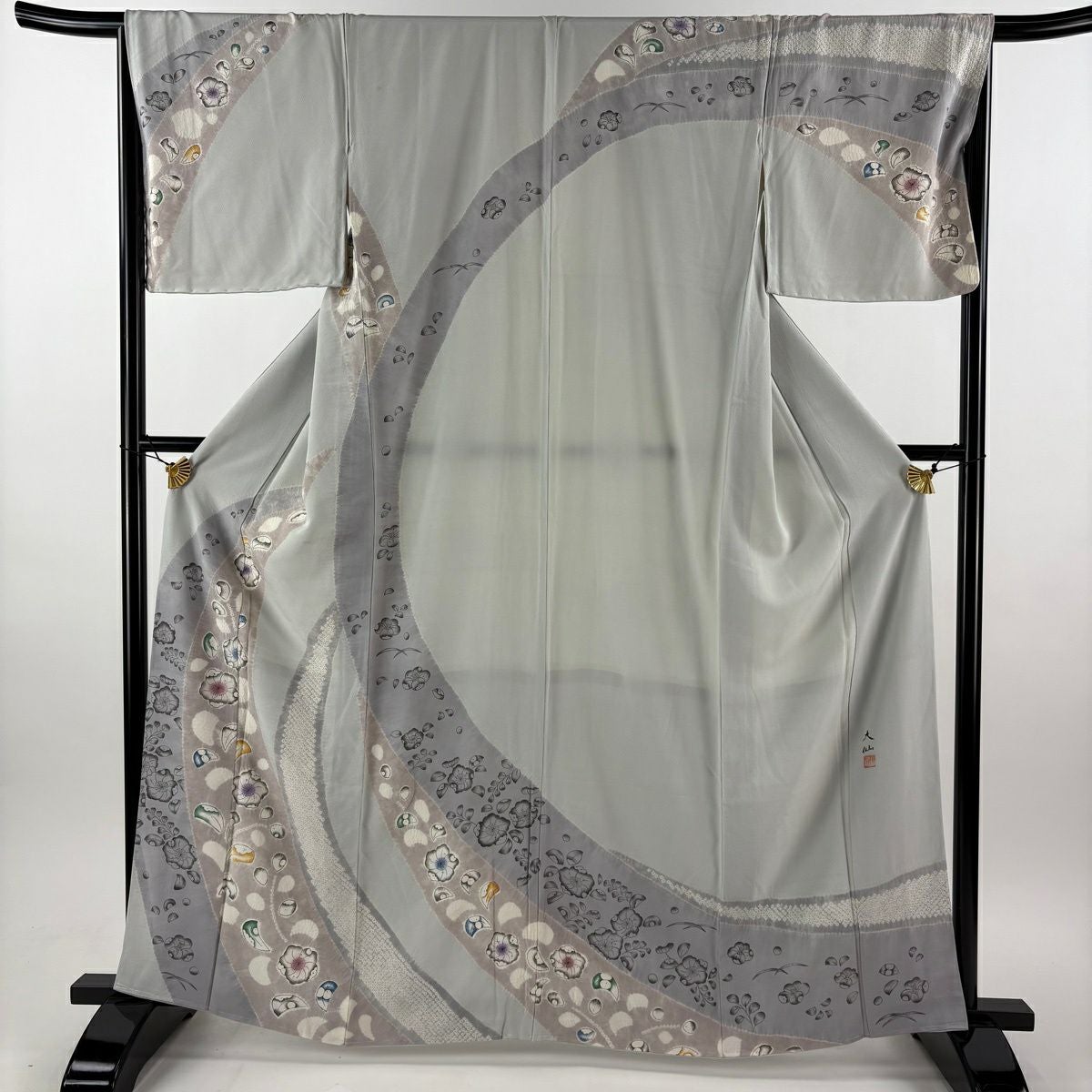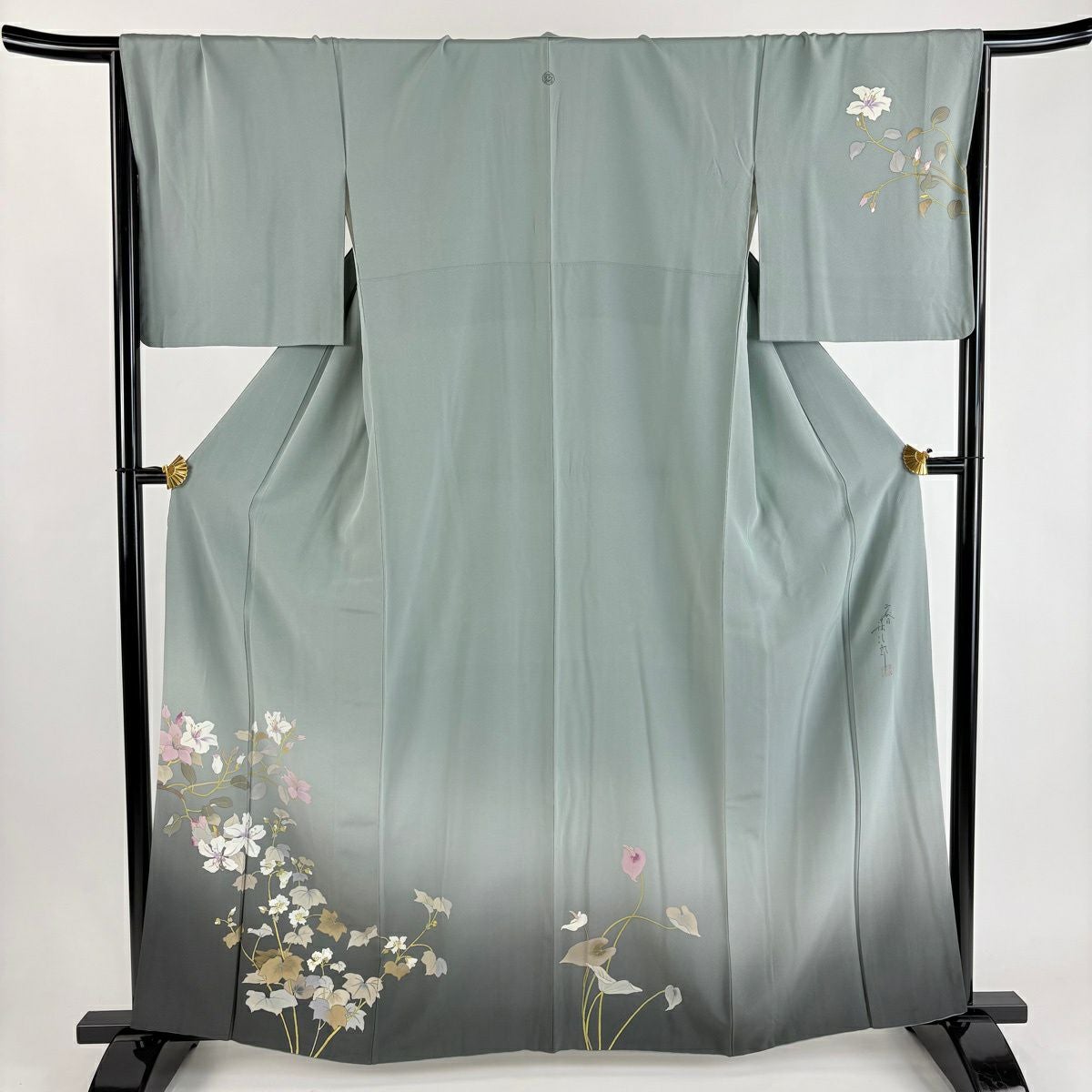 付下げ 身丈159.5cm 裄丈64cm M 袷 やまと 落款あり 斜縞 花 金彩 ぼかし 灰緑 正絹 秀品