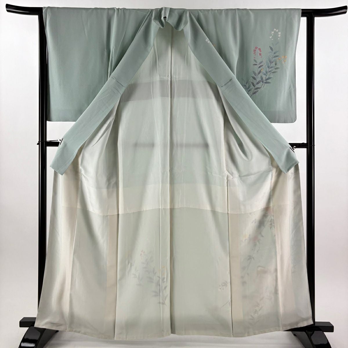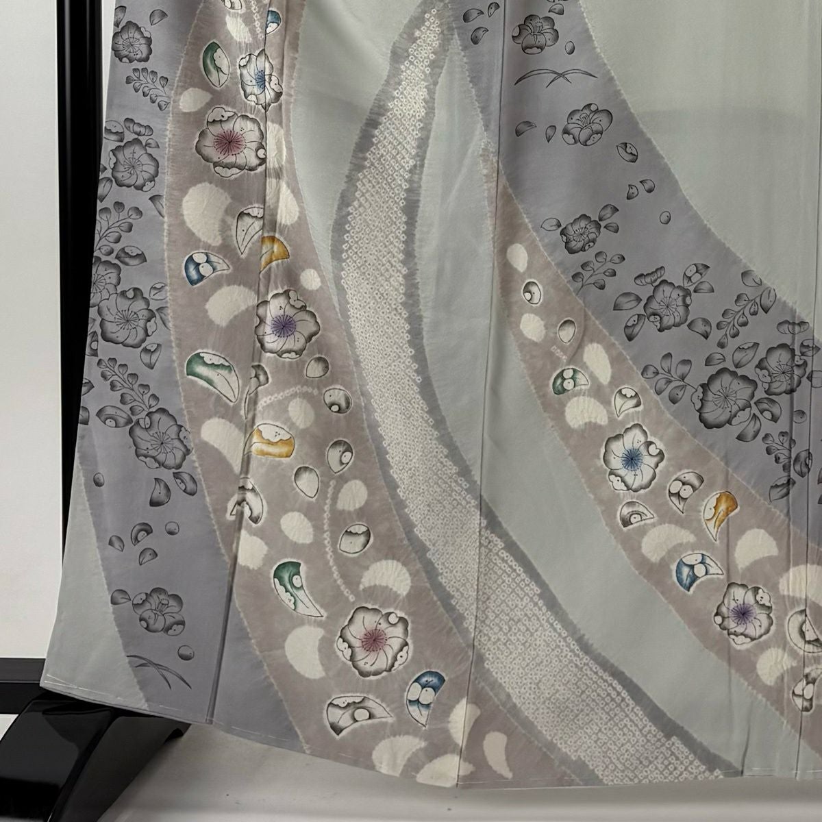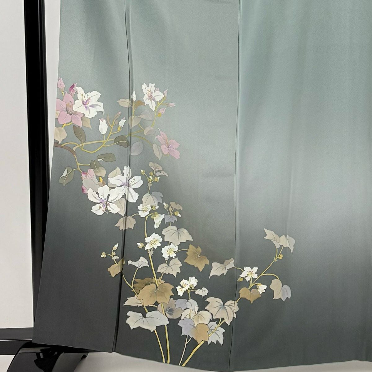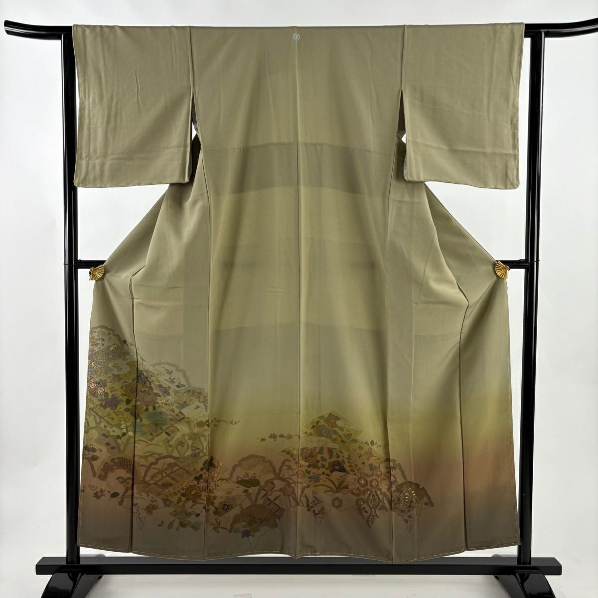 付下げ 身丈159.5cm 裄丈64cm M 袷 やまと 落款あり 斜縞 花 金彩 ぼかし 灰緑 正絹 秀品