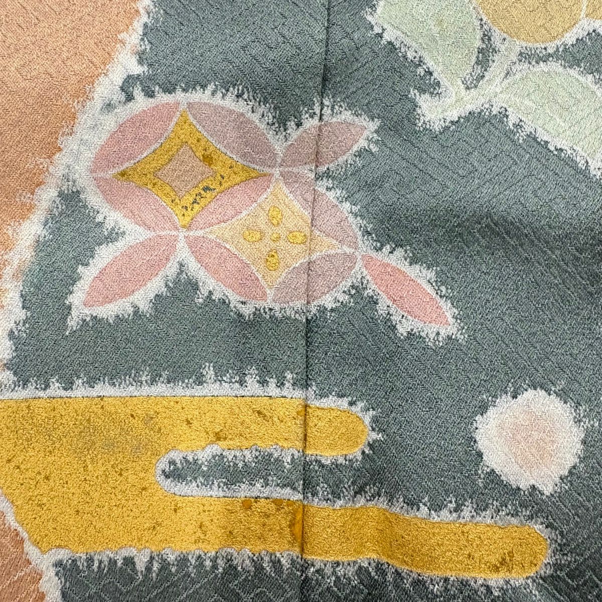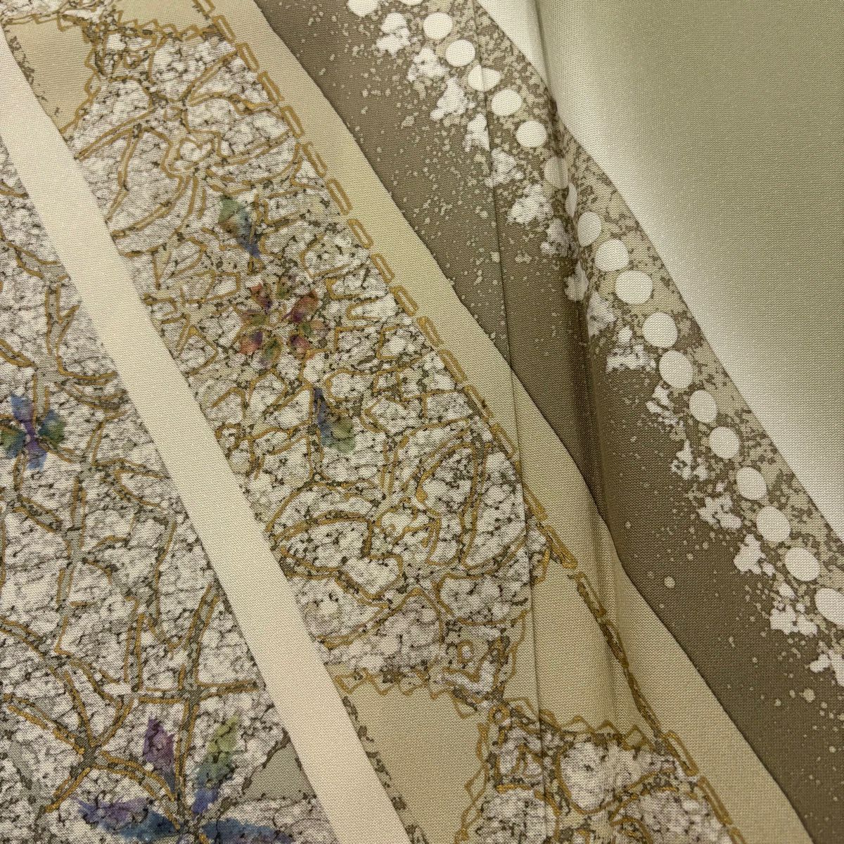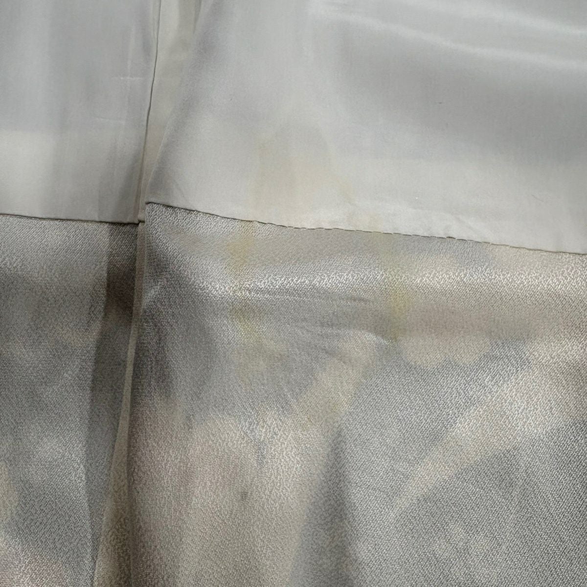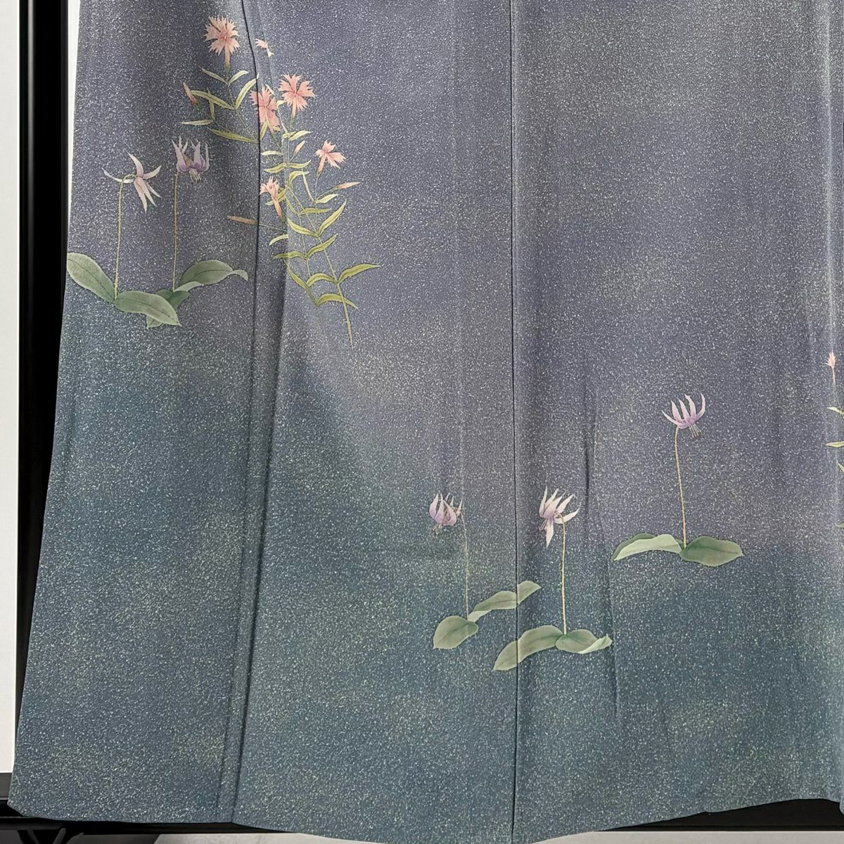 付下げ 身丈159.5cm 裄丈64cm M 袷 やまと 落款あり 斜縞 花 金彩 ぼかし 灰緑 正絹 秀品